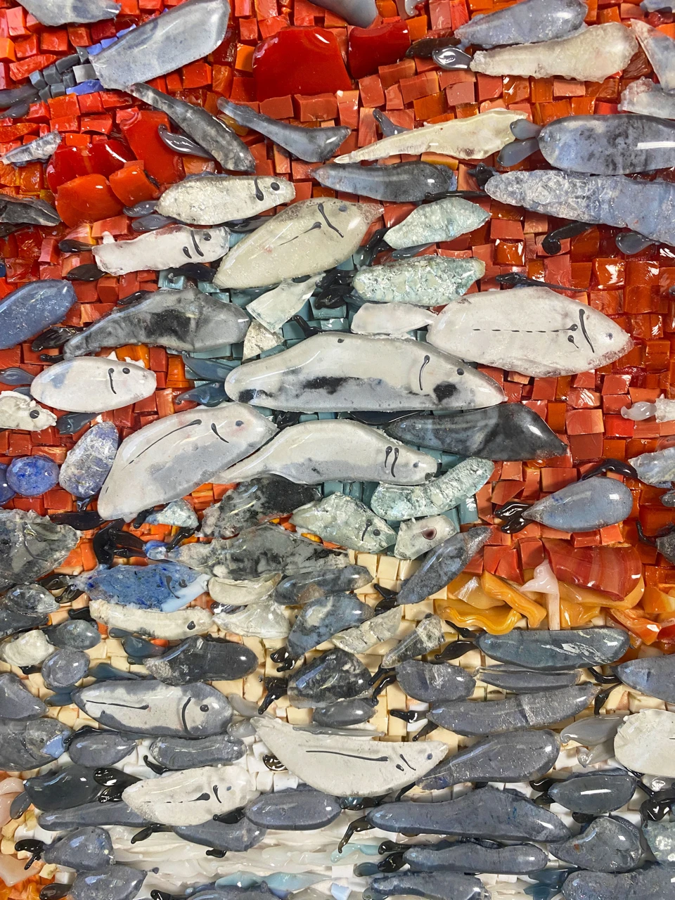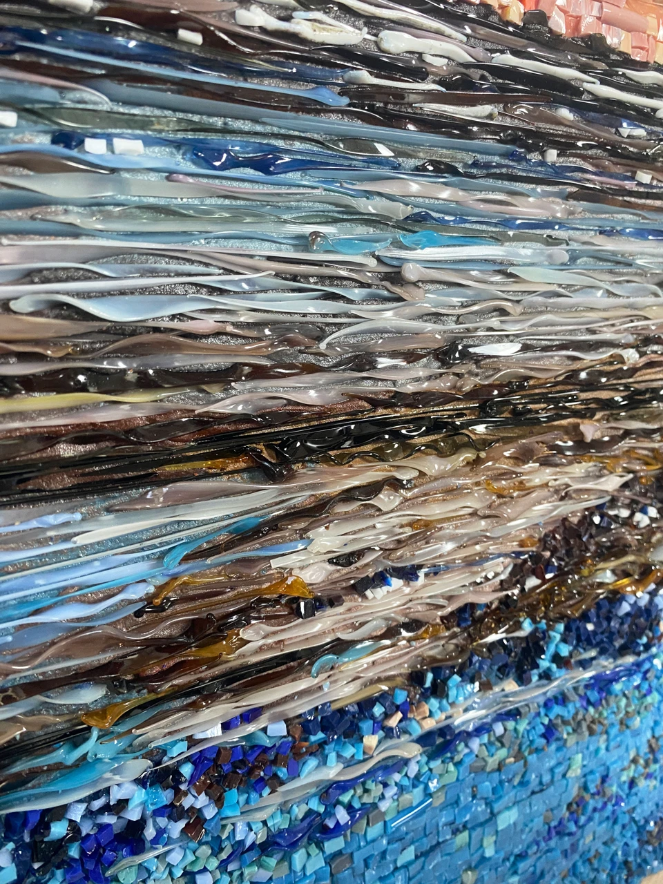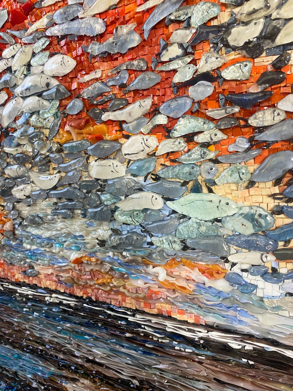 Объемное мозаичное панно выполнено в авторской технике мозаики из стеклянных элементов, каждый из которых выплавлен вручную.