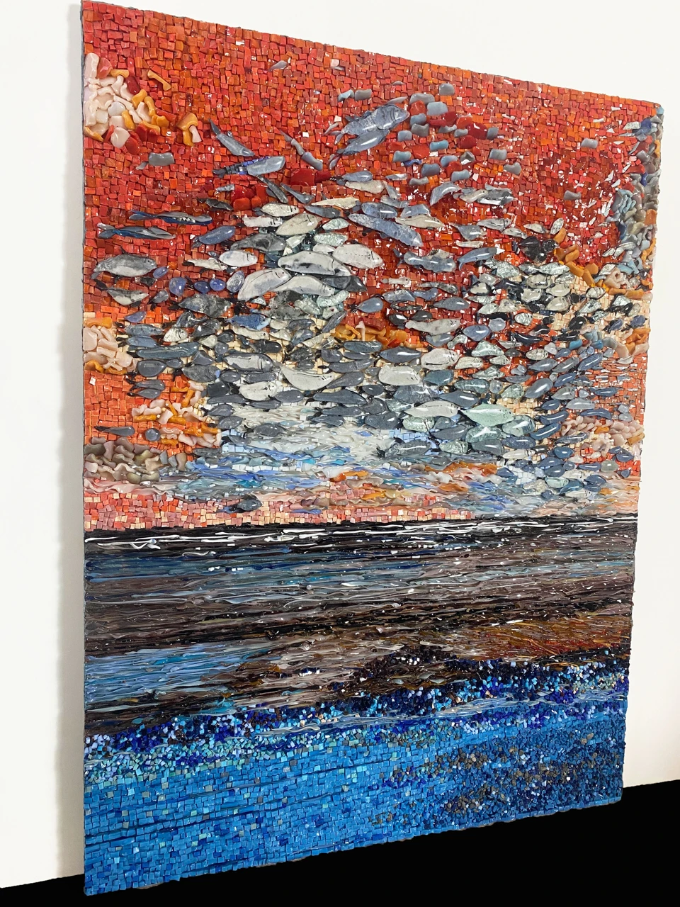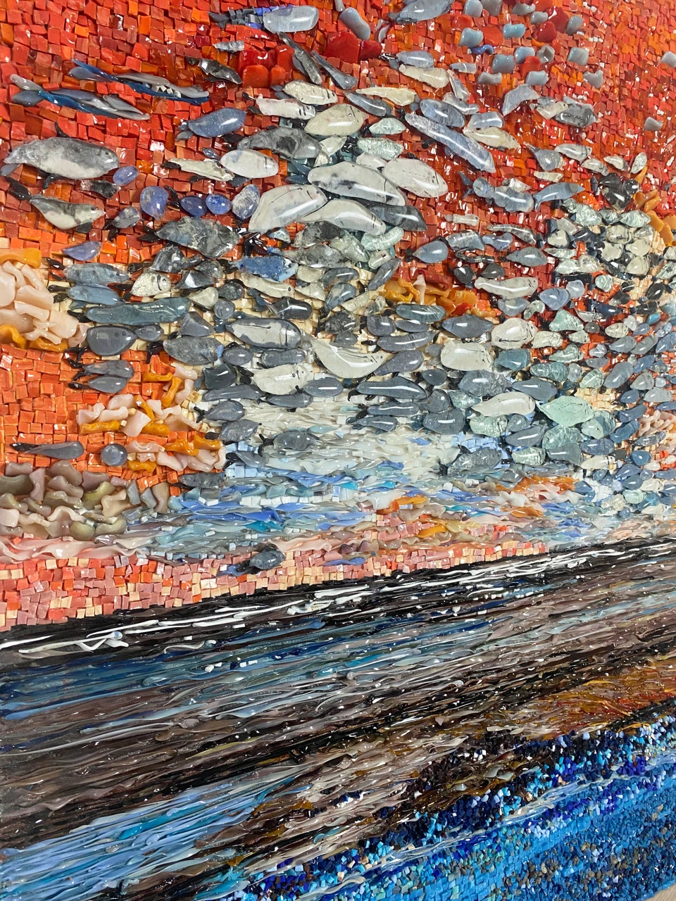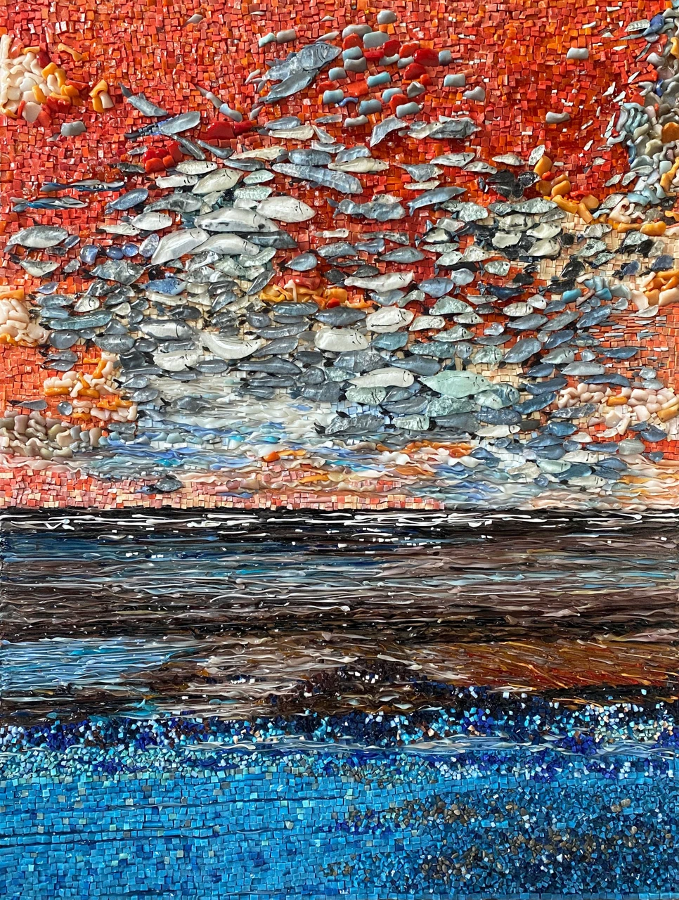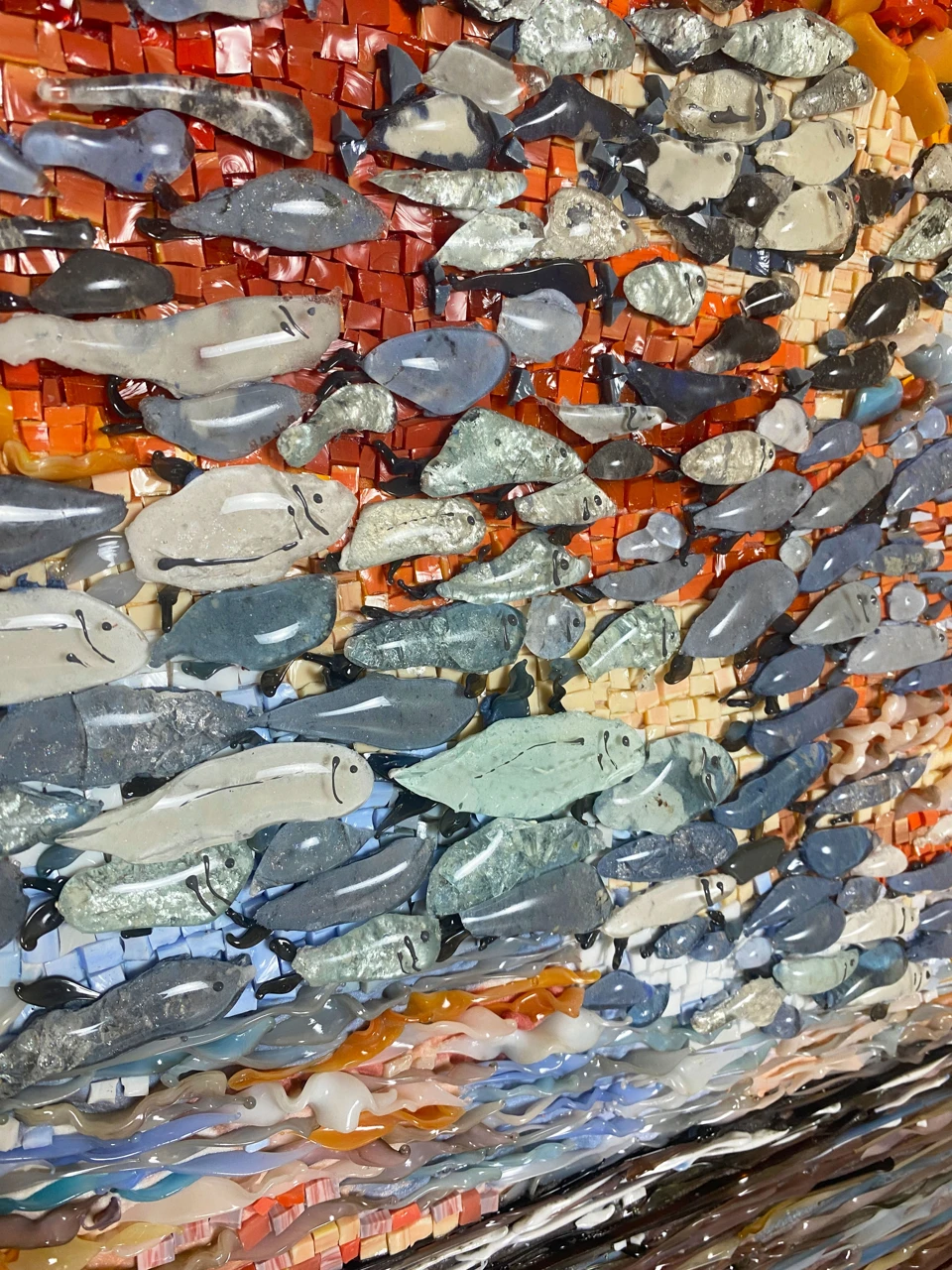 Объемное мозаичное панно выполнено в авторской технике мозаики из стеклянных элементов, каждый из которых выплавлен вручную.