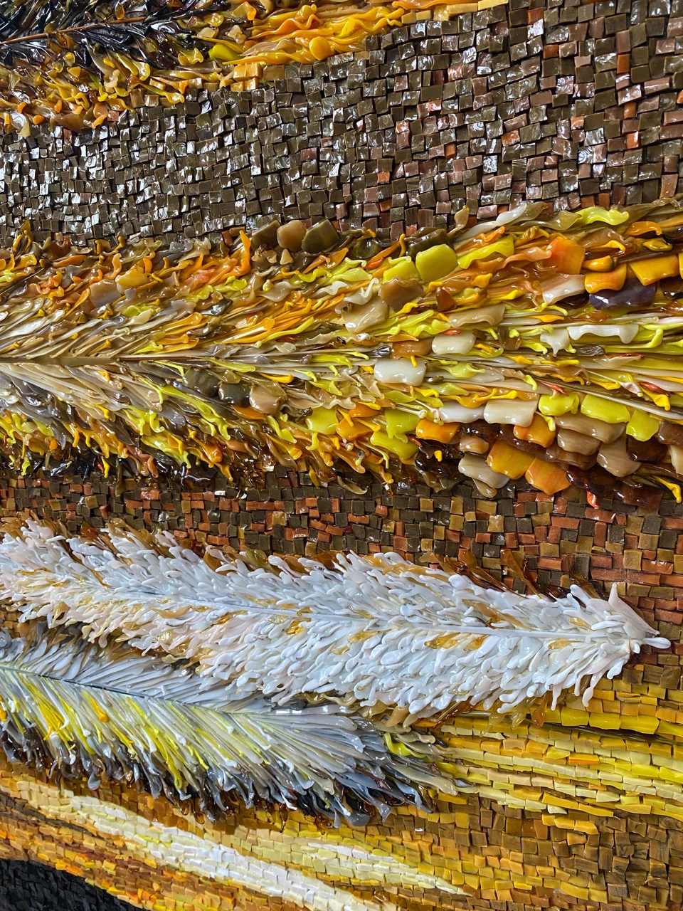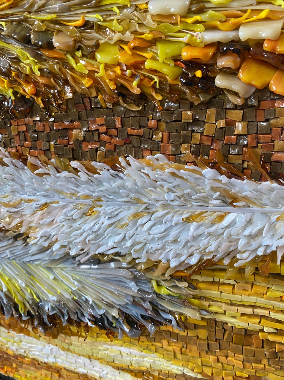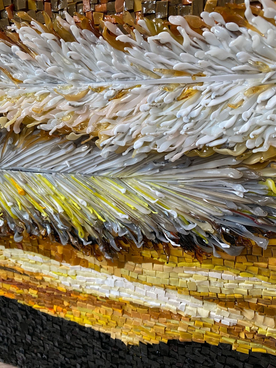 Объемное мозаичное панно выполнено в авторской технике мозаики из стеклянных элементов, каждый из которых выплавлен вручную.