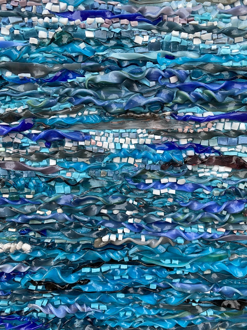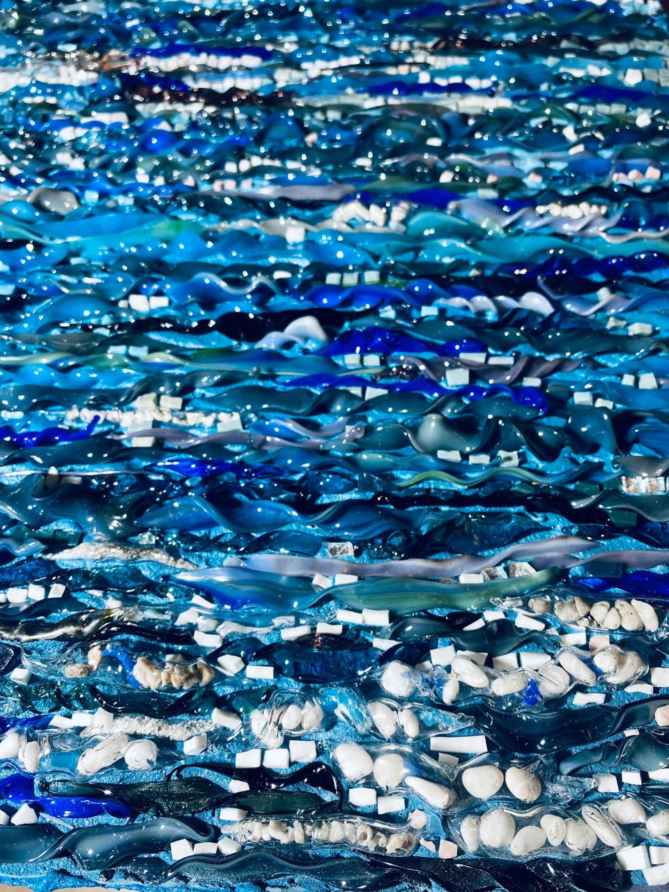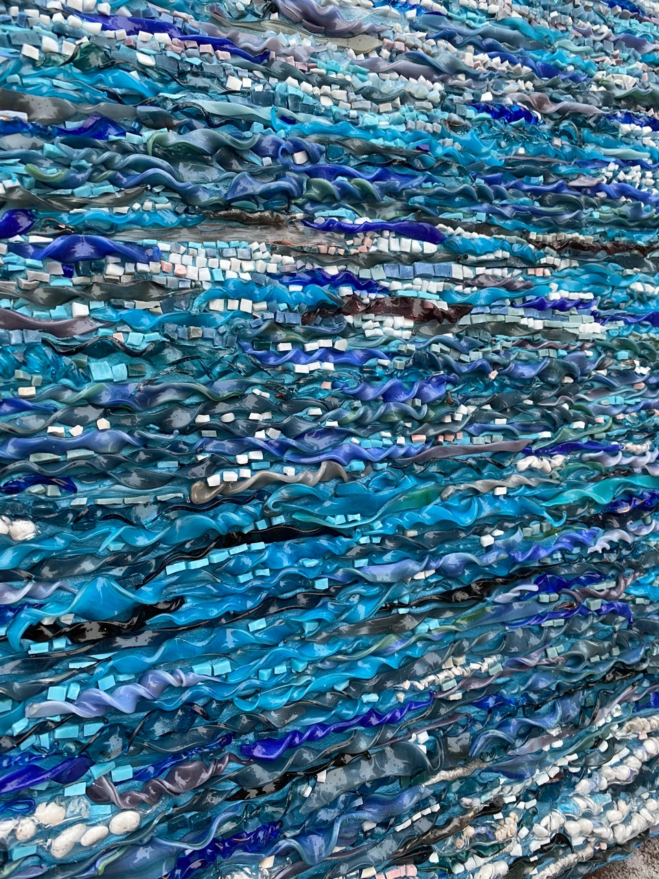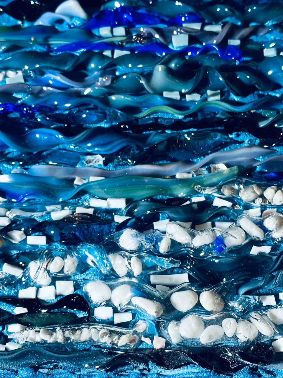 В этой работе также использована морская галька, которая собрана на разных берегах. Она запаяна ее в стеклянные трубки, так что теперь она не шумит.
