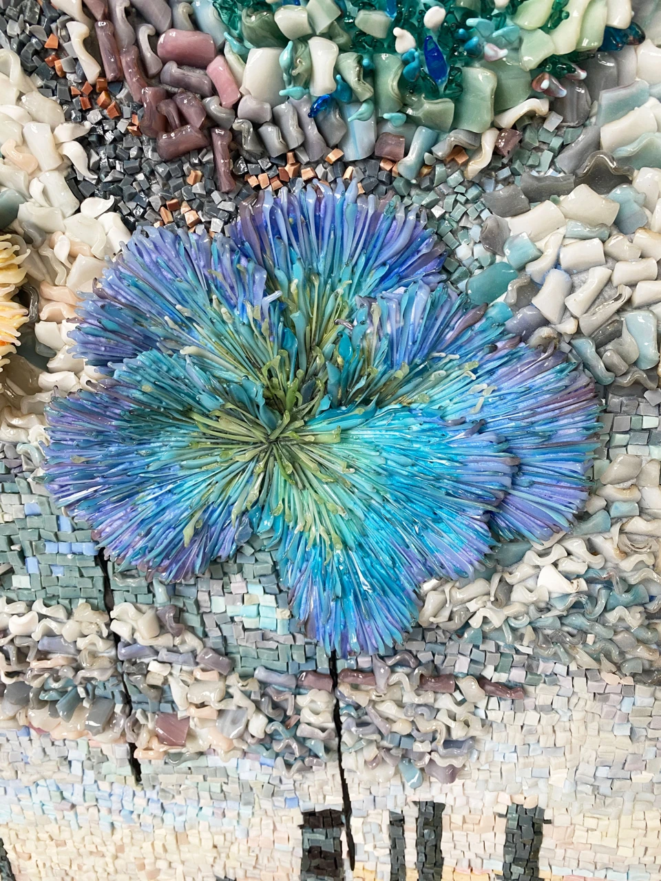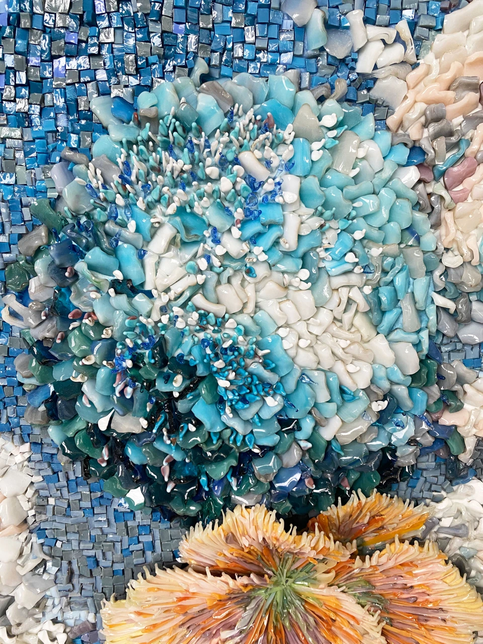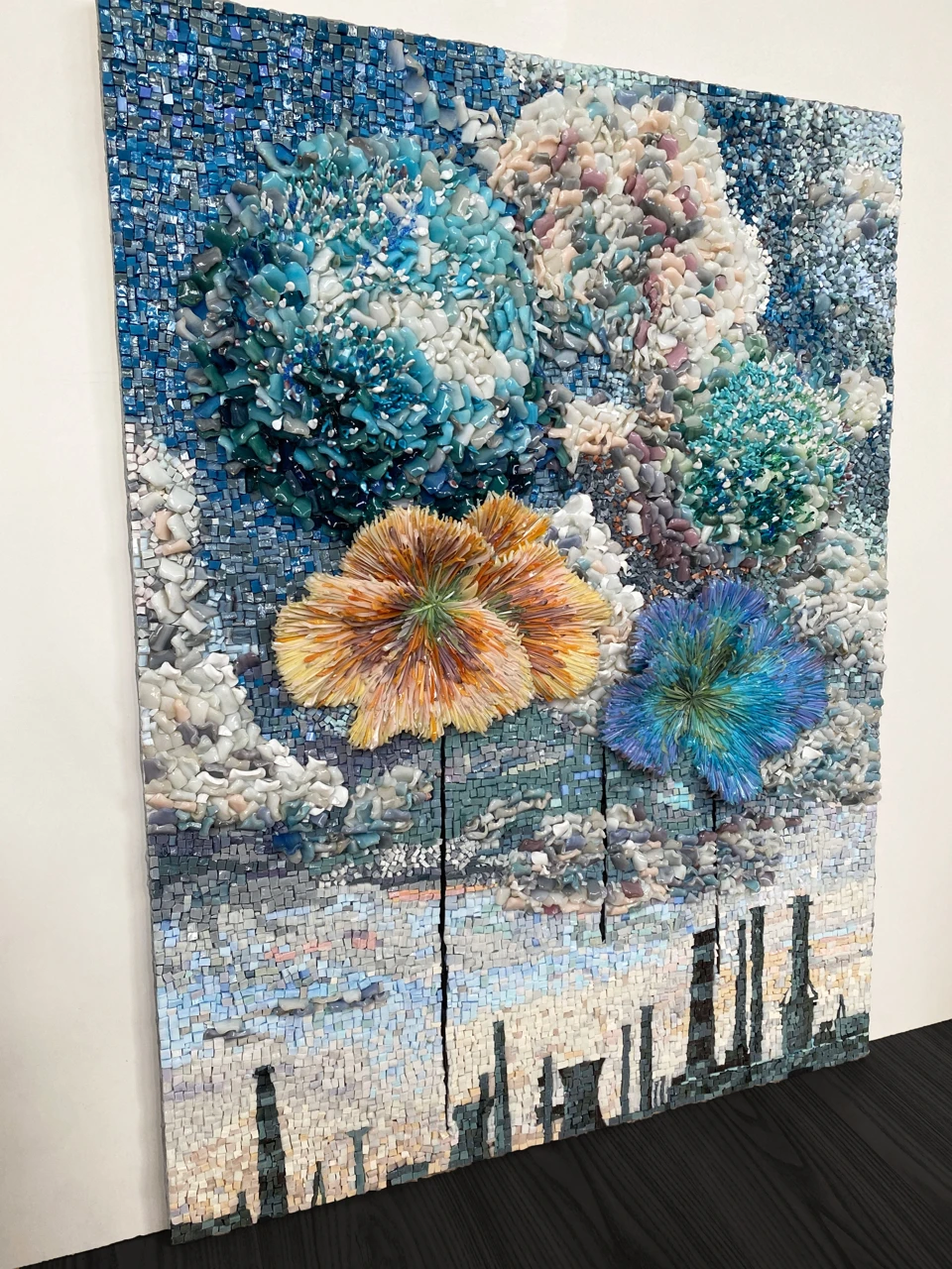 Объемное мозаичное панно выполнено в авторской технике мозаики из стеклянных элементов, каждый из которых выплавлен вручную.