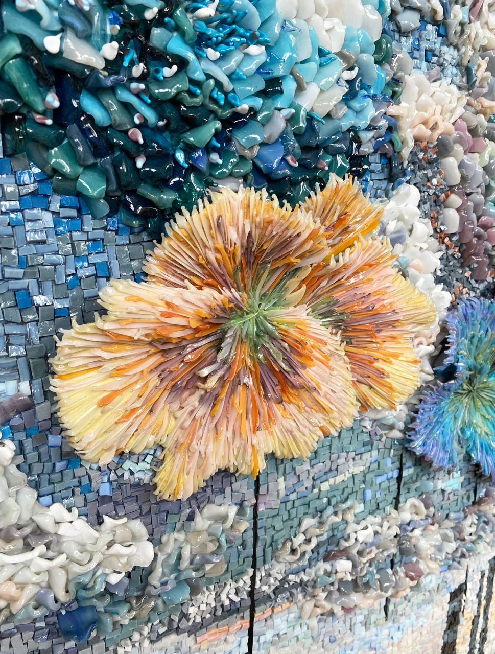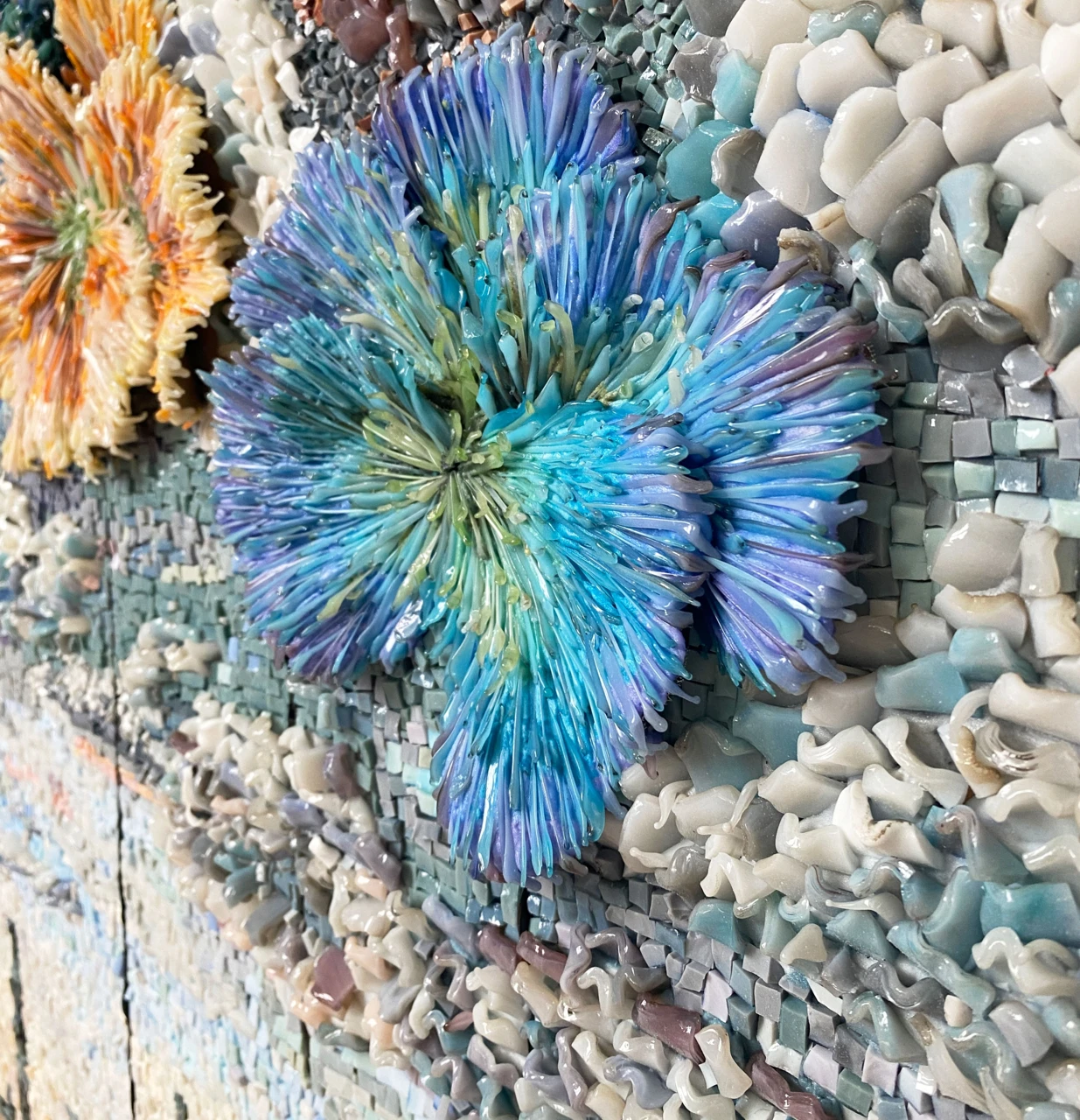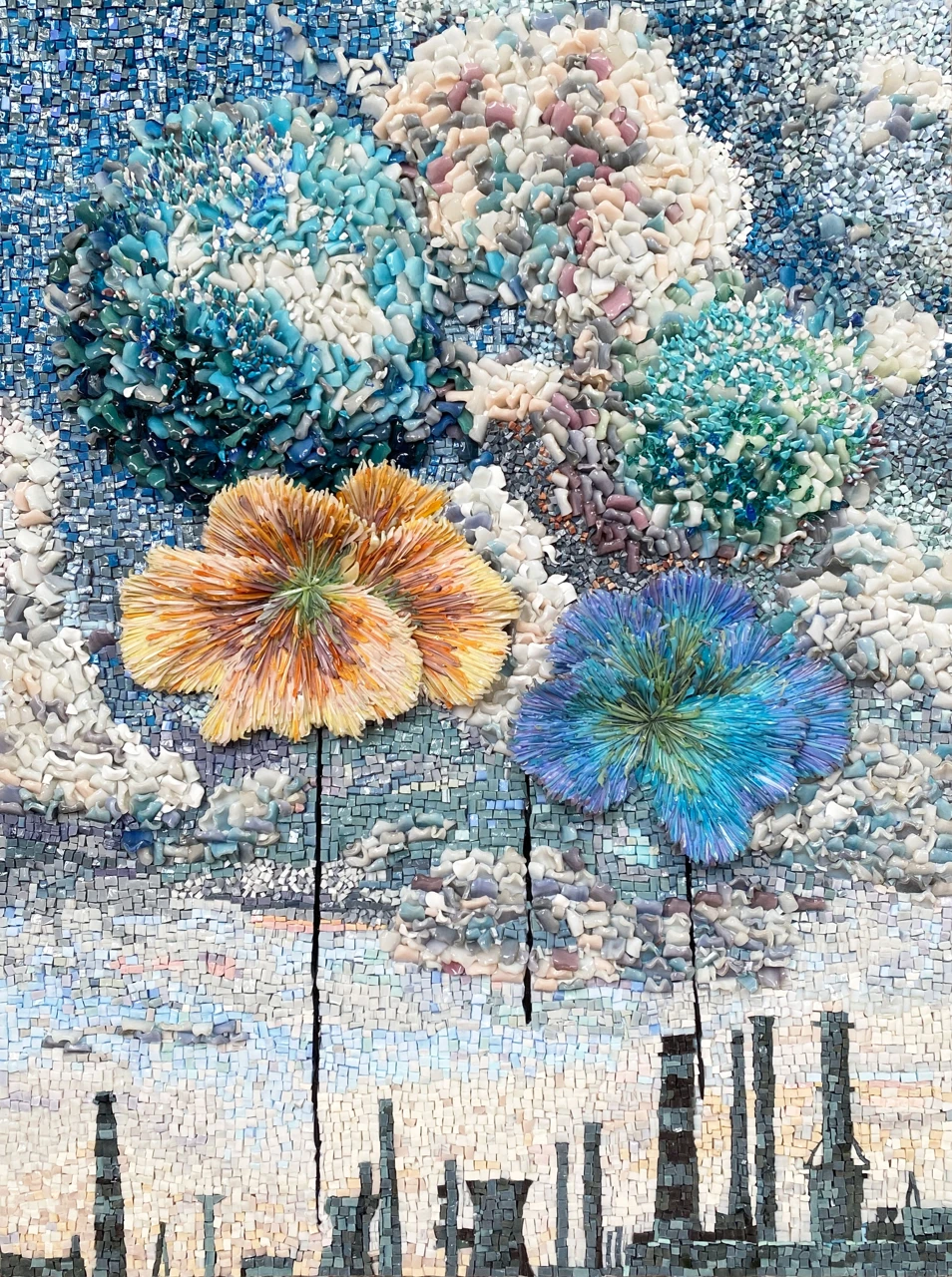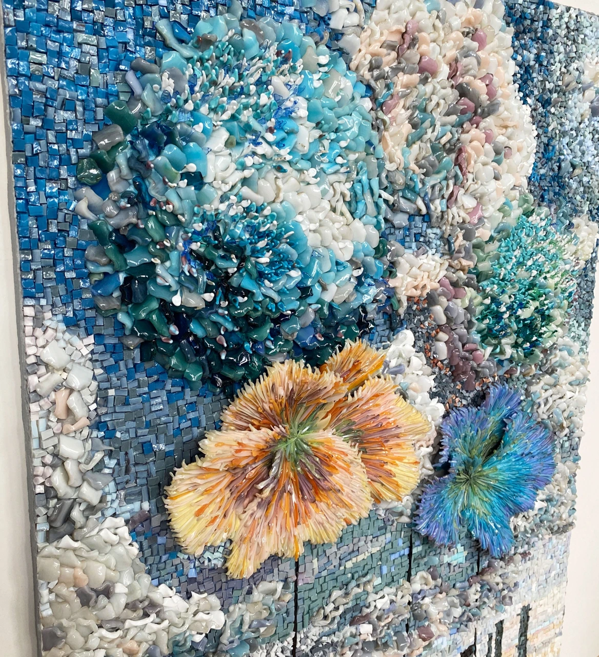 Объемное мозаичное панно выполнено в авторской технике мозаики из стеклянных элементов, каждый из которых выплавлен вручную.