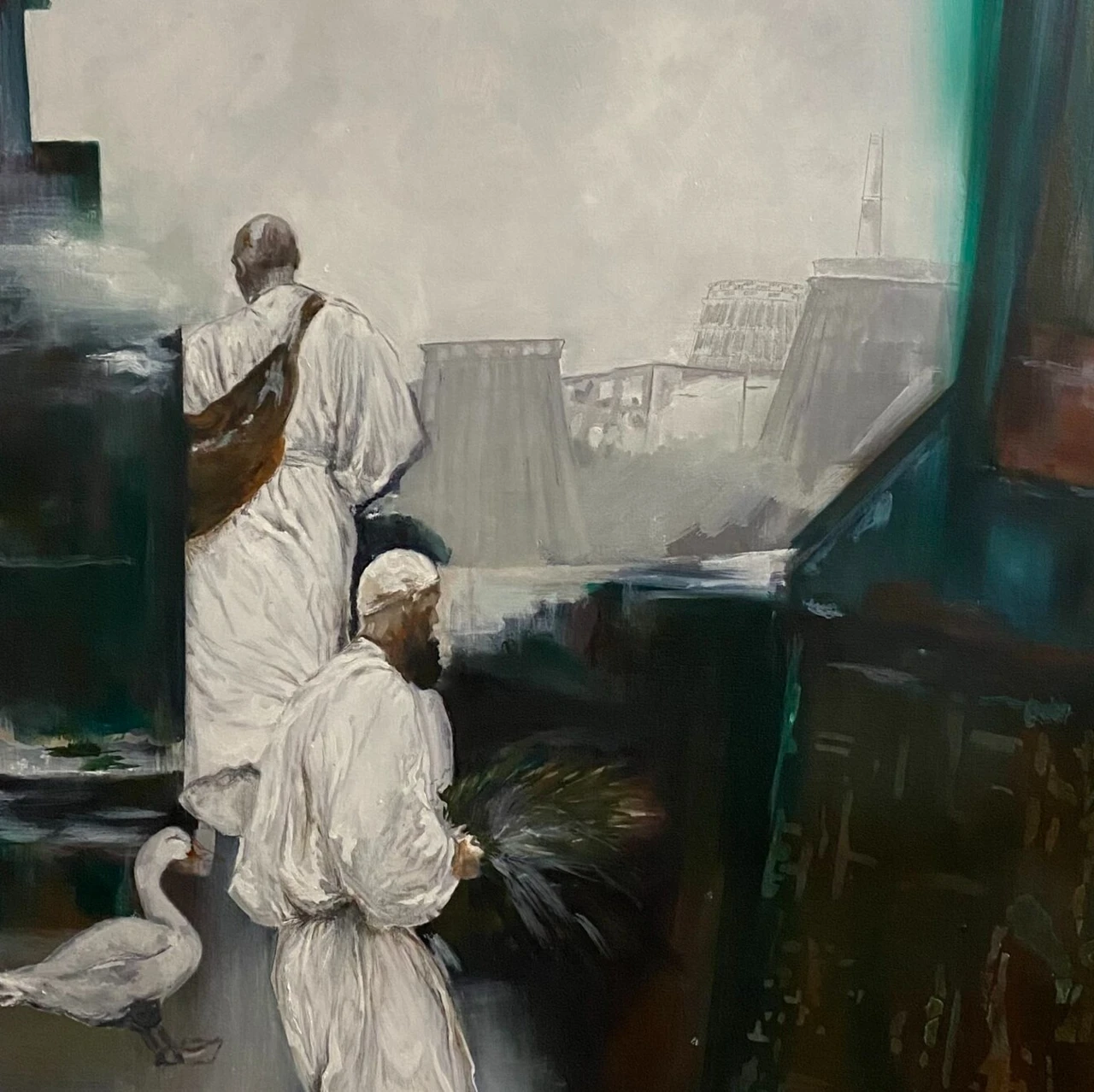 Картина раскрывает тему духовного пути через собирательный образ монахов, идущих в неизвестном направлении. Их фигуры символичны и лишены индивидуальности, подчёркивая идею внутреннего поиска и смирения. Пространство вокруг них расслаивается, словно мир разделяется на материальный и духовный уровни. На заднем плане появляются силуэты омских градирен — холодные индустриальные формы, контрастирующие с темой духовности. Этот контраст усиливает ощущение перехода от повседневной реальности к внутреннему преображению. Работа становится размышлением о сосуществовании материального мира и стремления человека к свету.