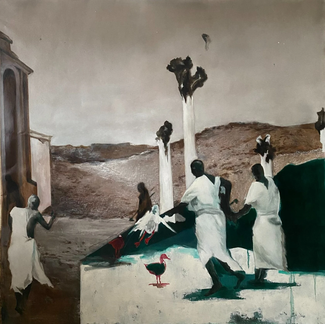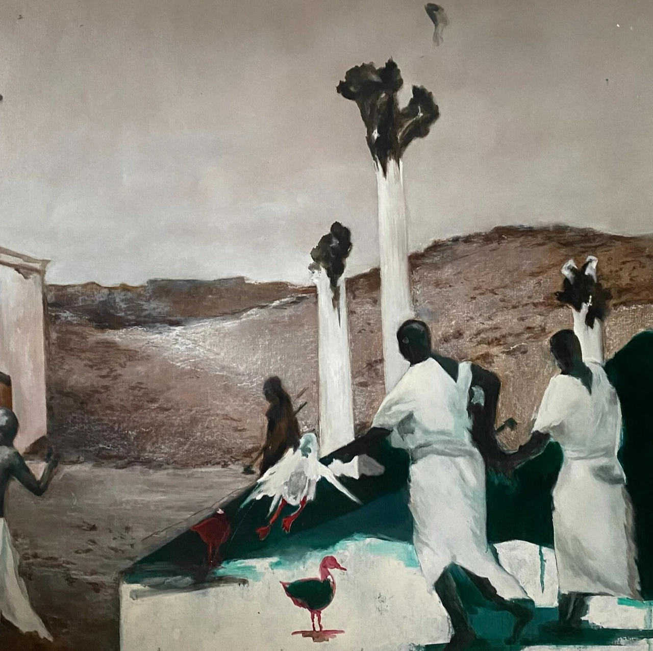 Композиция разделена на две части. Первая — светлая, монохромная, словно чистый лист, символ начала, потенциала и зарождения нового. Вторая — тёмная, графичная, представляющая образ старого, разрушенного мира. Из него выходят мужчина и женщина — как символы человечества, покидающего прежнюю реальность.