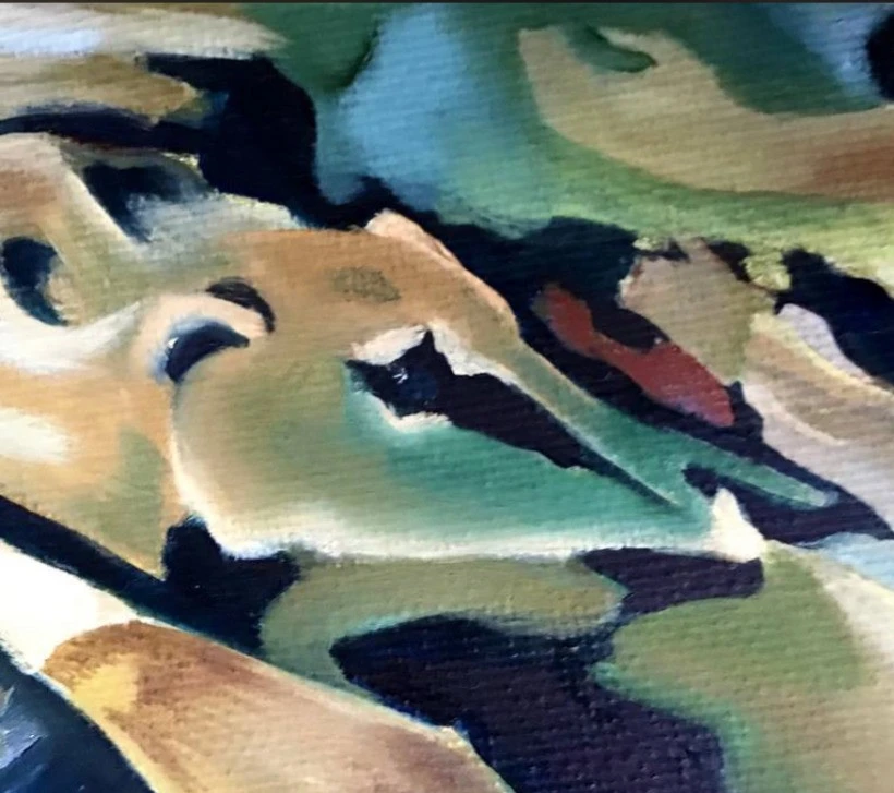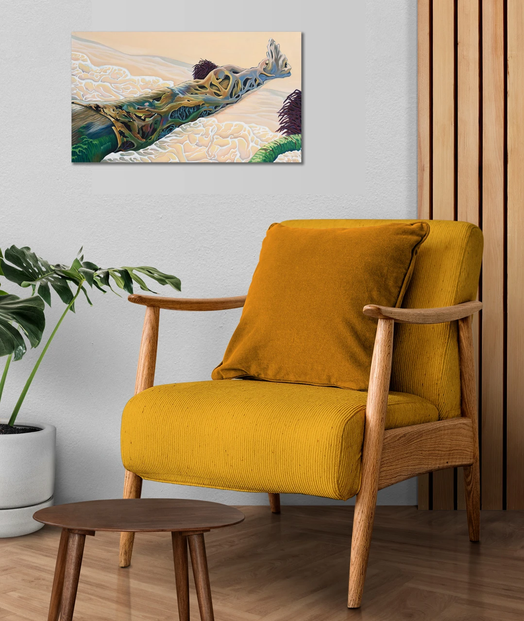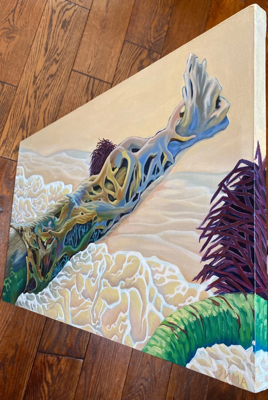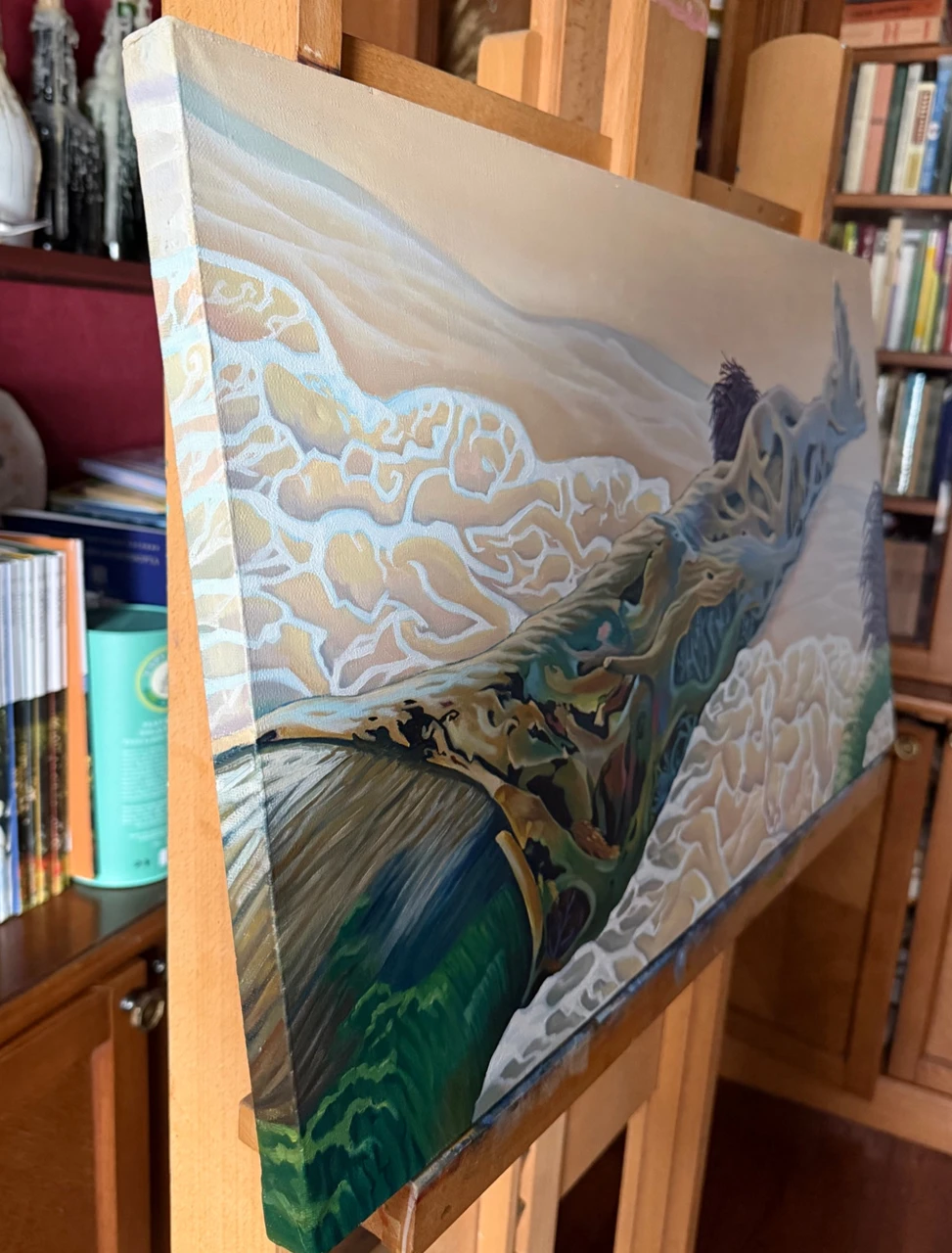 Картина написана в стиле магического реализма. В узор морской пены и в кору дерева вписаны многочисленные образы. Картину можно воспринимать на разных уровнях: как просто реалистичный пейзаж или читать как книгу, выискивая и рассматривая образы, складывающиеся в сюжет. Так в детстве, разглядывая облака, мы видели в них разные фигуры, а узор на бабушкином ковре выстраивался в хоровод туземцев, отплясывающих странные танцы.