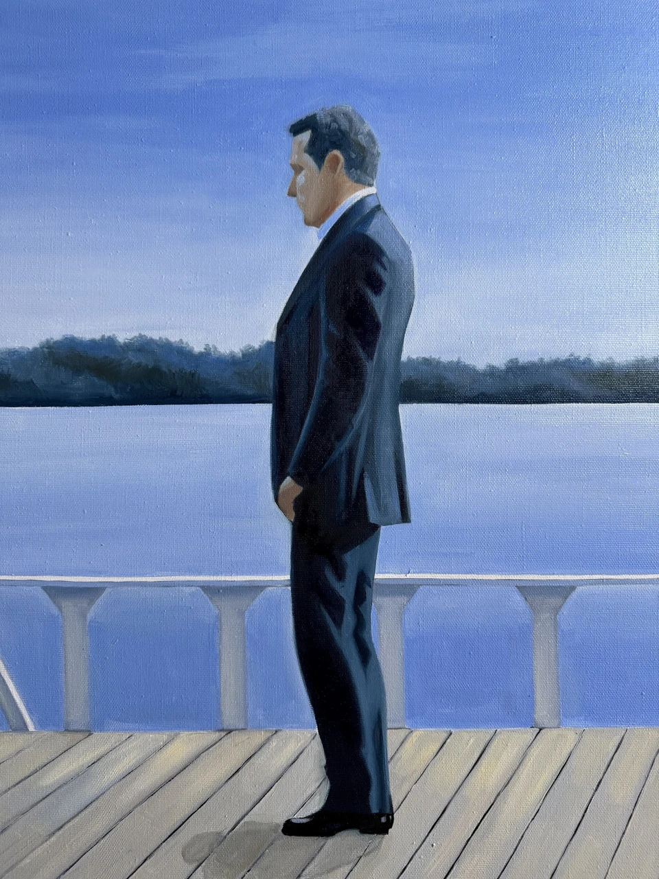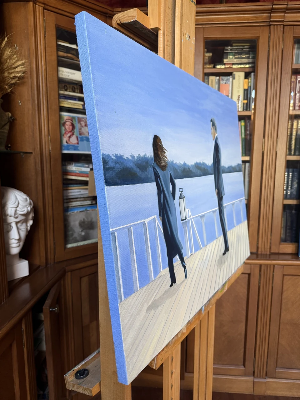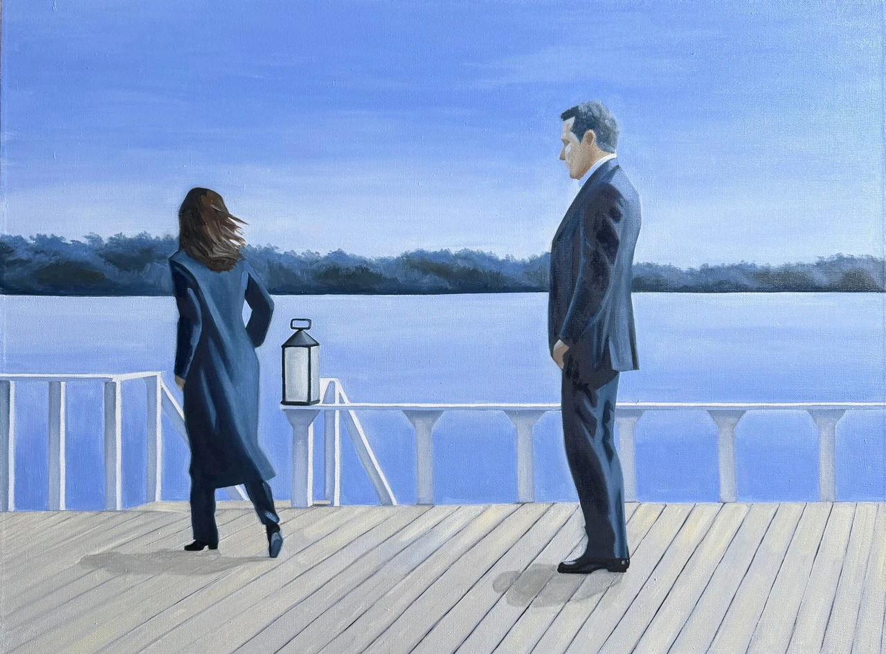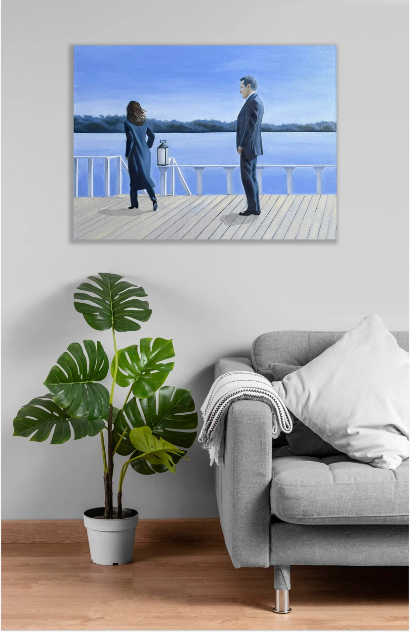 Картина из серии «Королевский голубой». В этой серии главенствует цвет — прохладный, немного меланхоличный, но благородный и оставляющий надежду, голубой. Сам сюжет картин этой серии пронизан иронией.
