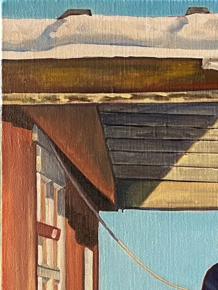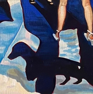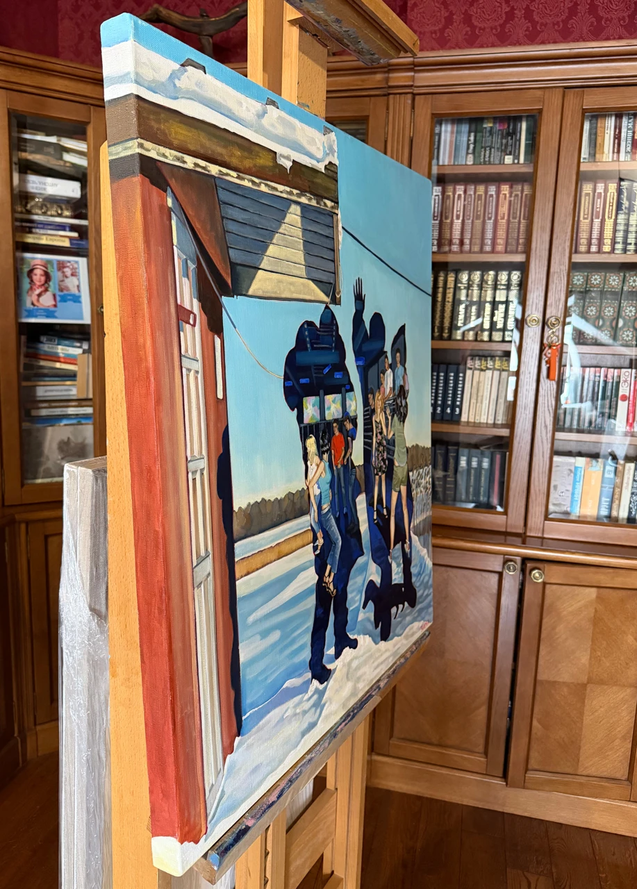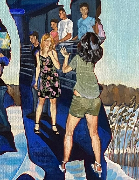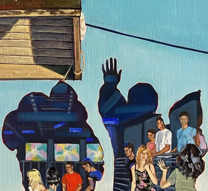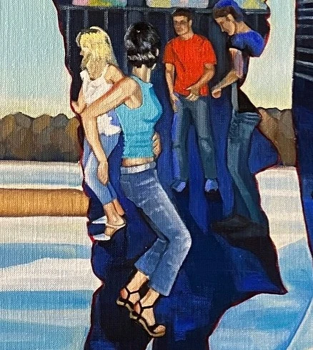 Картина из серии «Дуализм свойств». В философии теория дуализма свойств утверждает, что мир состоит из двух фундаментальных сущностей: разум и материя. Дуализм порождает столкновение физического и психического. И ставит вопрос: каковы причинные связи? Физическое обуславливает ментальные процессы или наоборот? Картины этой серии совмещают два пространства — внешнее и внутреннее. Таким образом, раскрывается нелинейность времени и пространства, несовпадение окружающего мира и внутреннего ощущения человека. Внутреннее состояние меняется в зависимости от настроения и влияния окружающих людей и событий. Оно может сильно отличаться от внешней обстановки. Не совпадать или резонировать самым неожиданным способом с внешним миром.