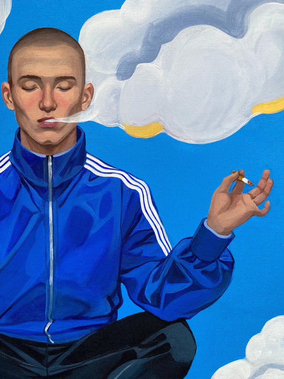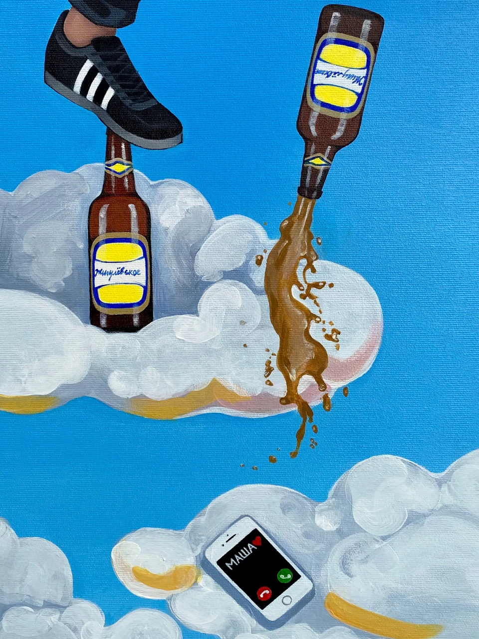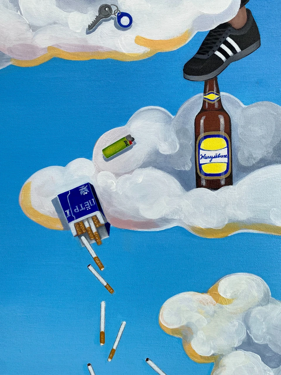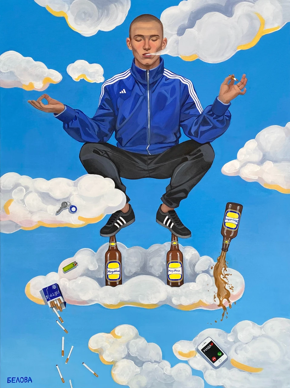 Это ироничное размышление о современном аскетизме, где юноша в спортивном костюме левитирует в облаках, достигнув просветления. Вокруг него парят сигареты, пиво, телефон и ключи ‑ символы земных привязанностей, которые он отпускает. Соединяя эстетику постсоветского быта с буддийской философией, художница превращает хаотичный набор предметов в метафору духовного поиска и внутреннего освобождения.