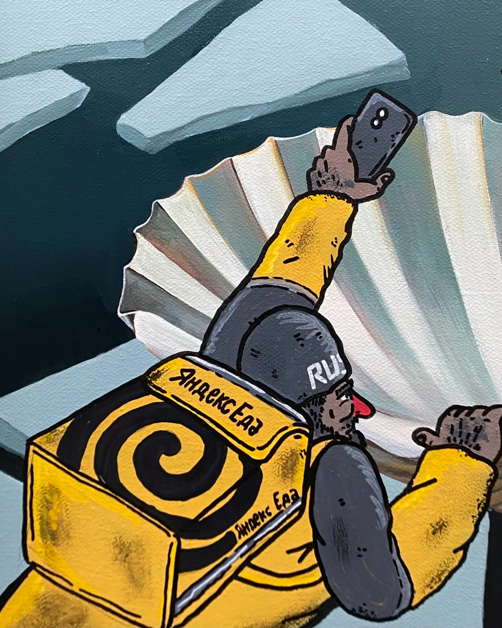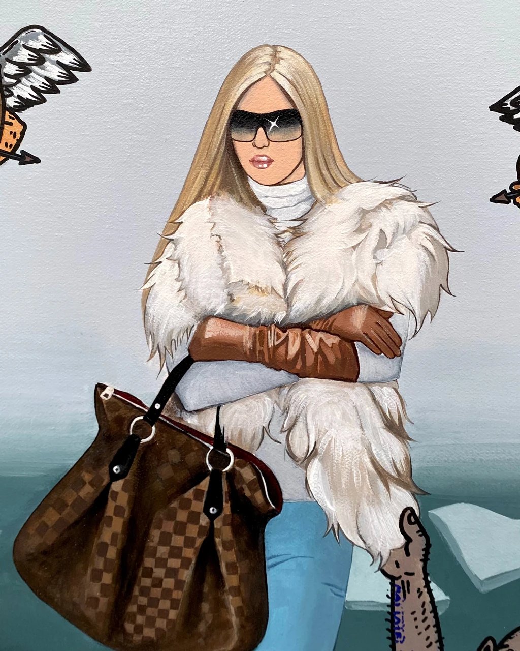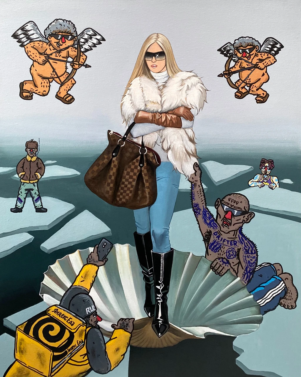 Картина строится на контрасте глянца и реальности: в центре — гламурная девушка, представленная как современная Венера, идеал красоты и недосягаемости. Её окружают «ухажёры»-маргиналы — курьер, гопник и рэпер, чьи образы подчёркивают разрыв между мирами. Мужские персонажи, выполненные уличным художником king24rus, добавляют работе дерзость и иронию.