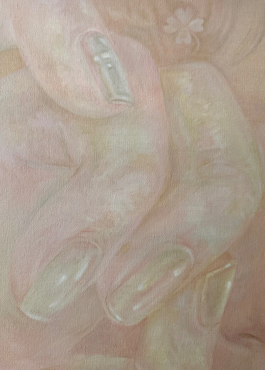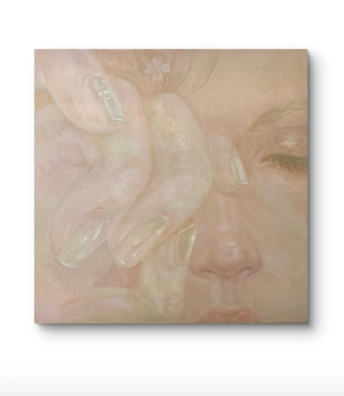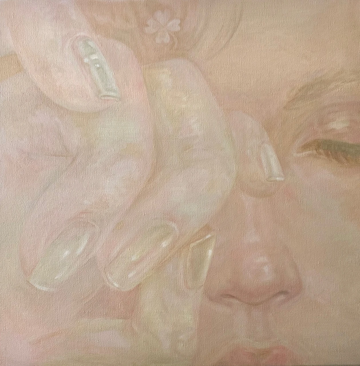 Данная работа – часть цикла живописных портретов с акцентом на композицию — плотное, приближённое изображение, фокусирующееся на деталях лица и эмоциях женщин через чувственную призму.