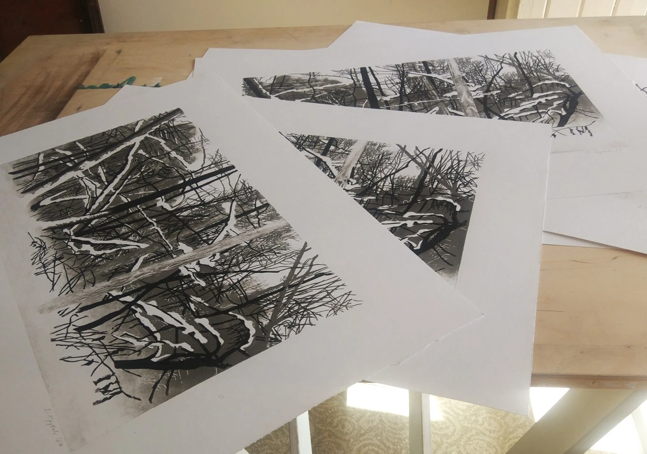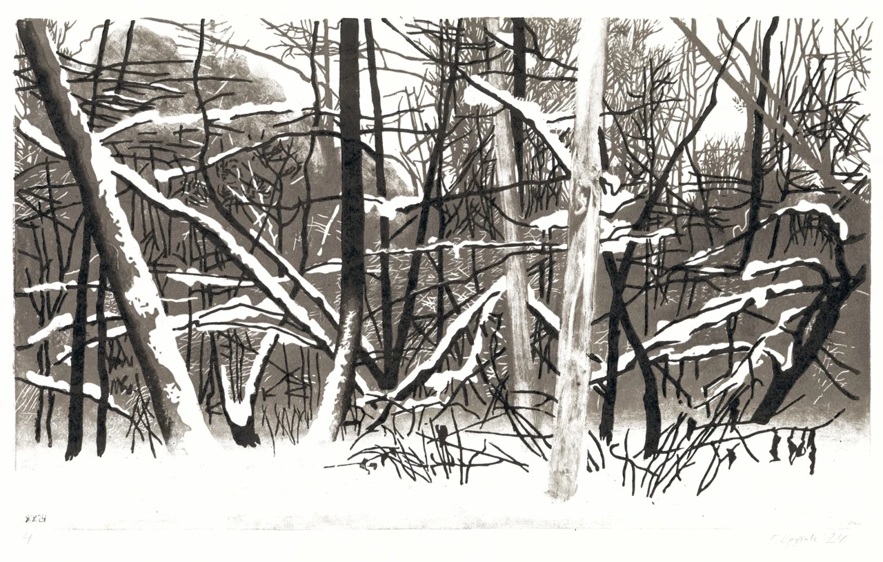 Линогравюра в две доски. На светлом слое есть элементы монотипии, так что все оттиски немного различаются текстурой деревьев и плотностью дальнего плана.