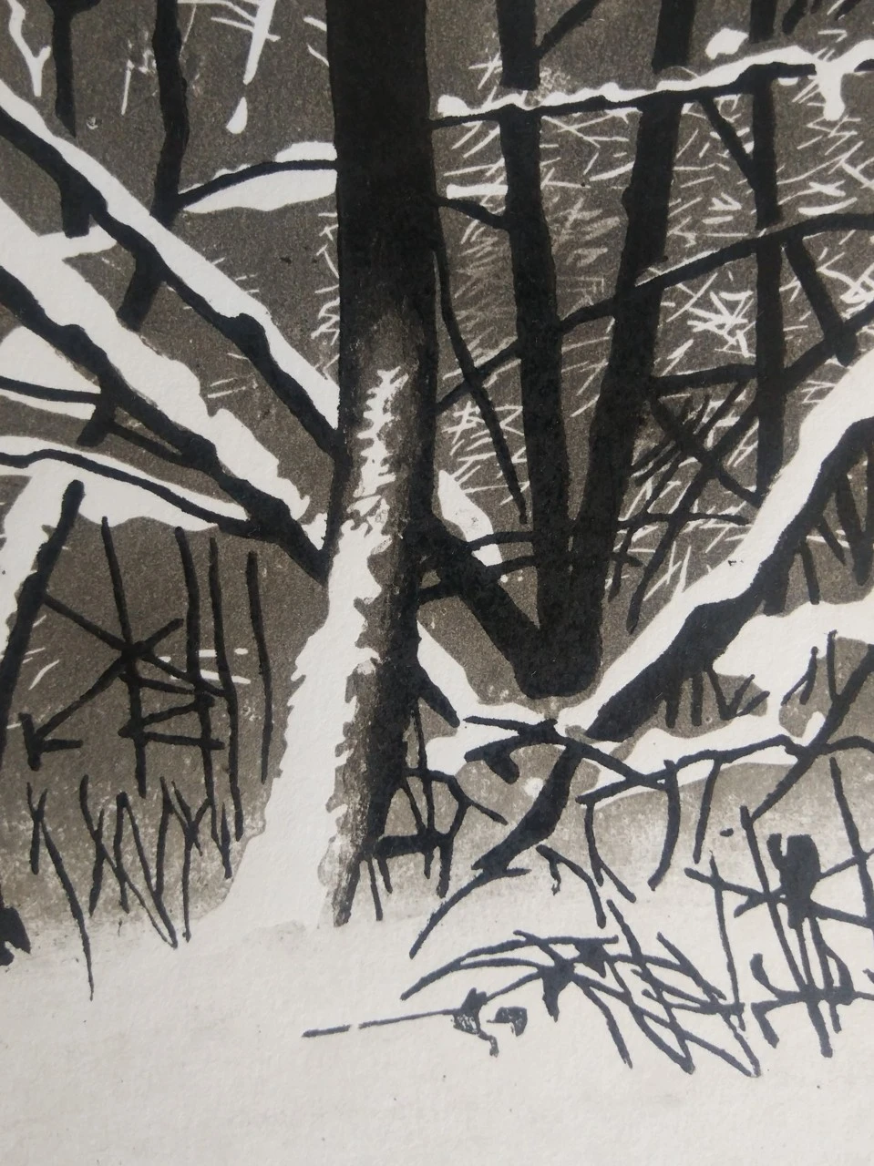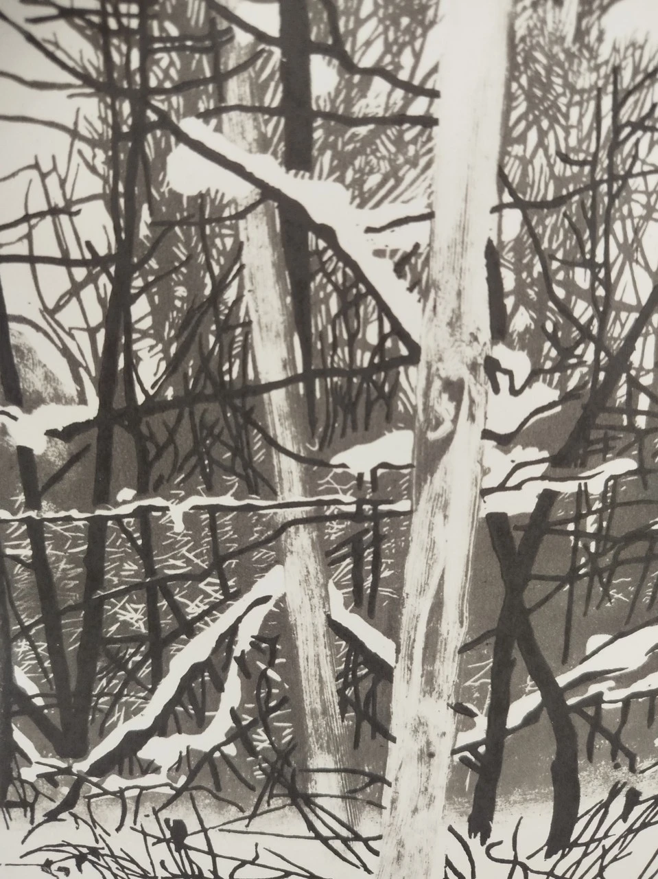 Заснеженные ветки в лесу составляют таинственный узор, похожий на неземное послание. В этой работе основной задачей для меня было проследить ритм светлых и тёмных линий и пятен. Я взяла из натуры самые выразительные переплетения и обострила их, сохранив природную пластику деревьев.