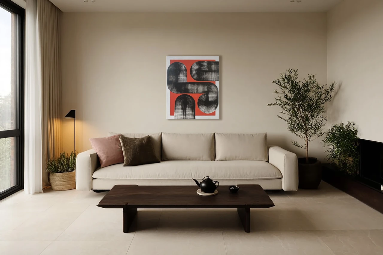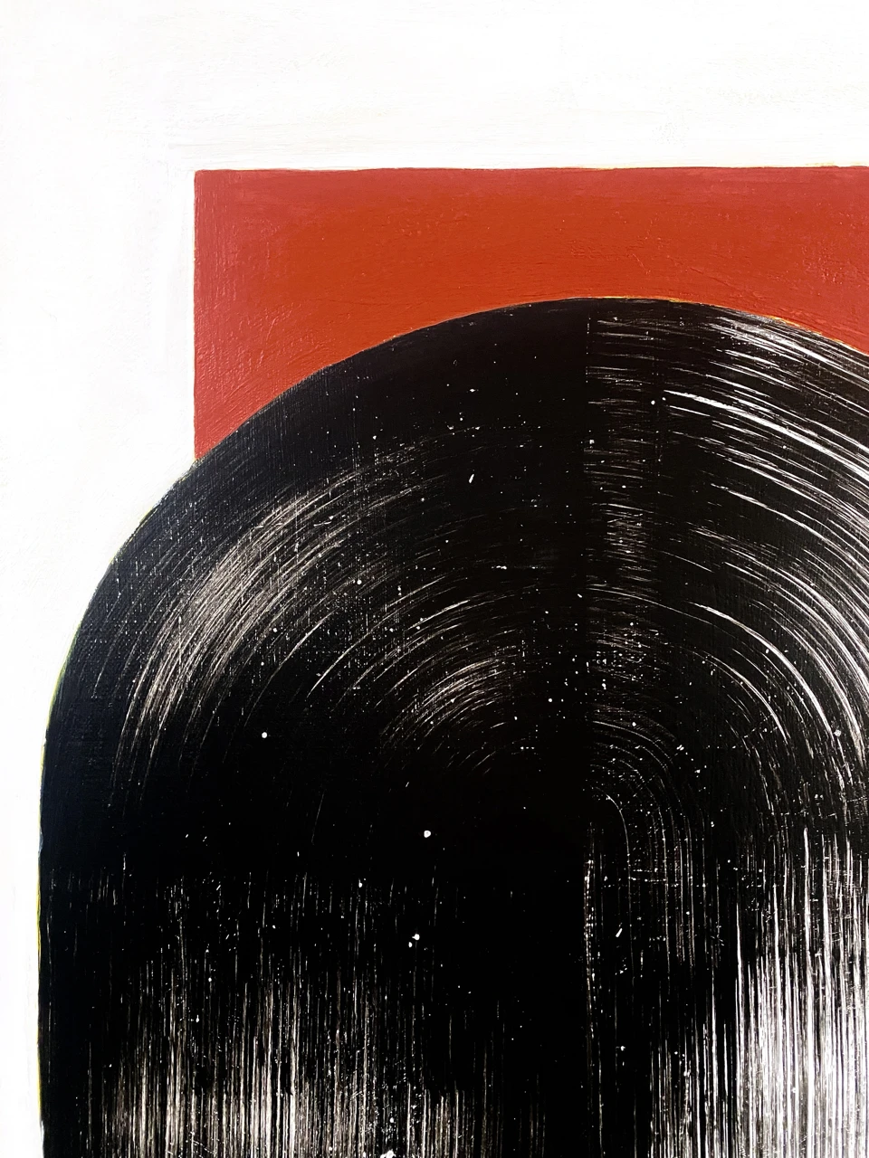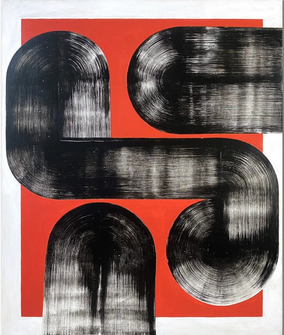 Жёсткая геометрия фона вступает в диалог с пластичными, почти органичными дугами — это напряжение порядка и потока, схема и импульс, техническое и человеческое. Картина оставляет пространство для интерпретации: маршрут, повторяющийся ритм жизни, или человеческая дружба, превращённая в поэзию формы.