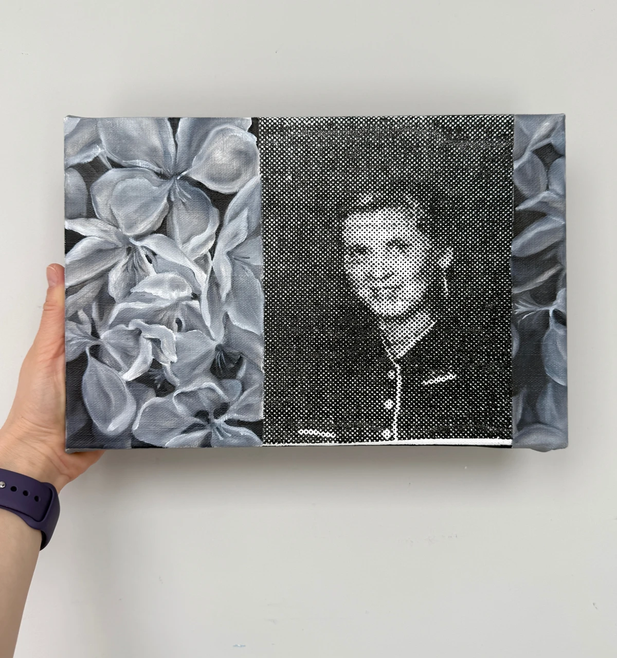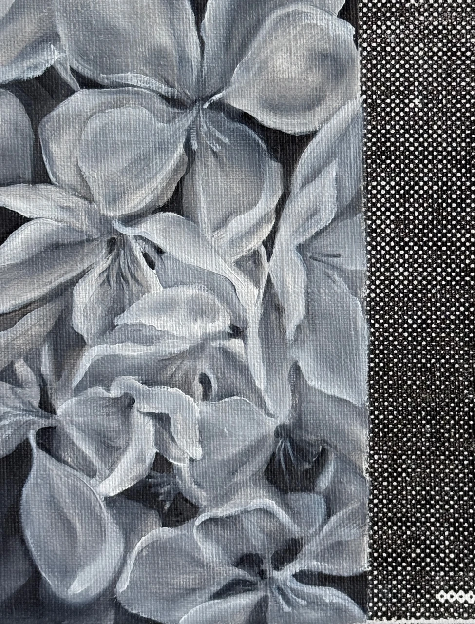 Серия «Сокрытое» — об утраченной связи с прошлым: используя архивные семейные фотографии, я размышляю о преемственности поколений, трансформации памяти, исследую механизмы передачи воспоминаний, а образ сада работает как символ родственных связей. Сочетая живопись и шелкографию, я противопоставляю опыт присутствия здесь и сейчас идее серийности тиражируемых образов памяти прошлого.