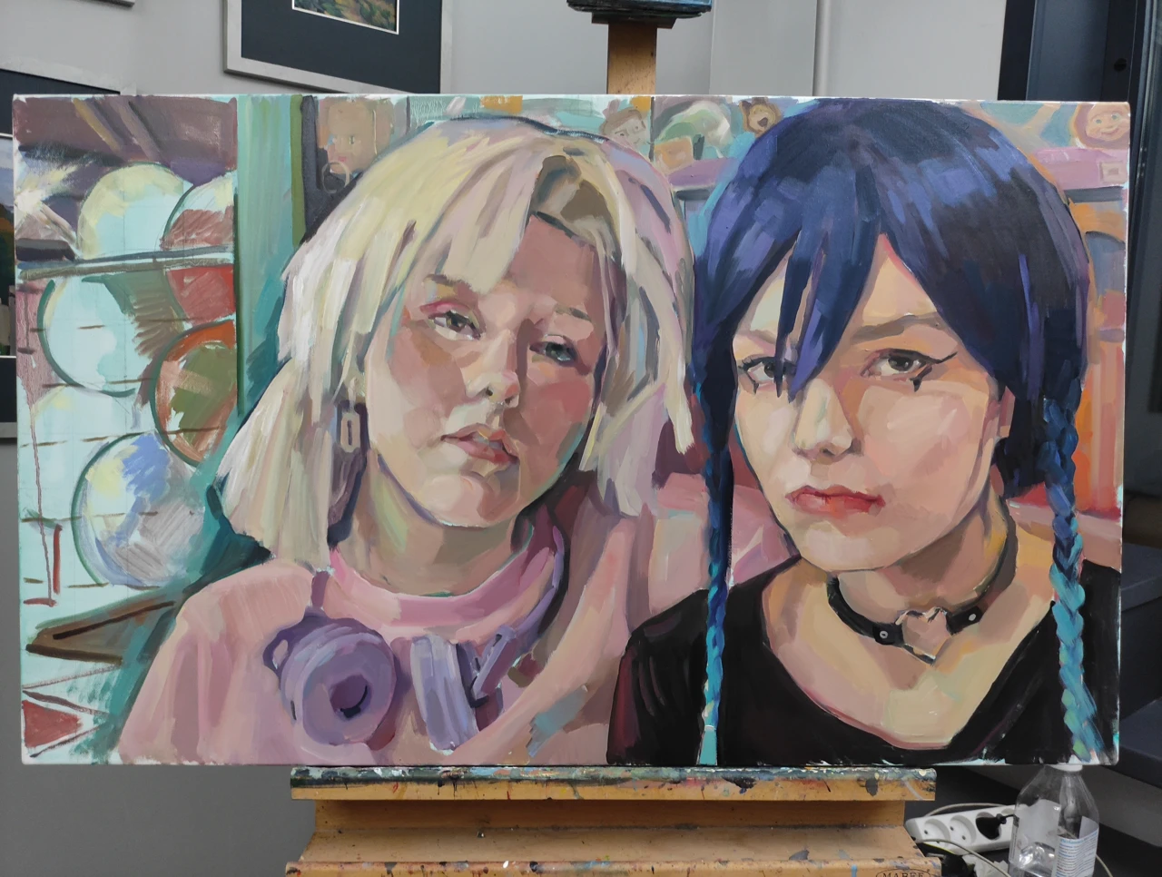 Девочки-подростки в кукольных париках делают селфи в магазине Детский мир. Но их «детский мир» отображают отстраненные выражения лиц, пограничное состояние еще не взрослых и уже не детей. Хотя «детский мир» им уже мал, но они продолжают играть.