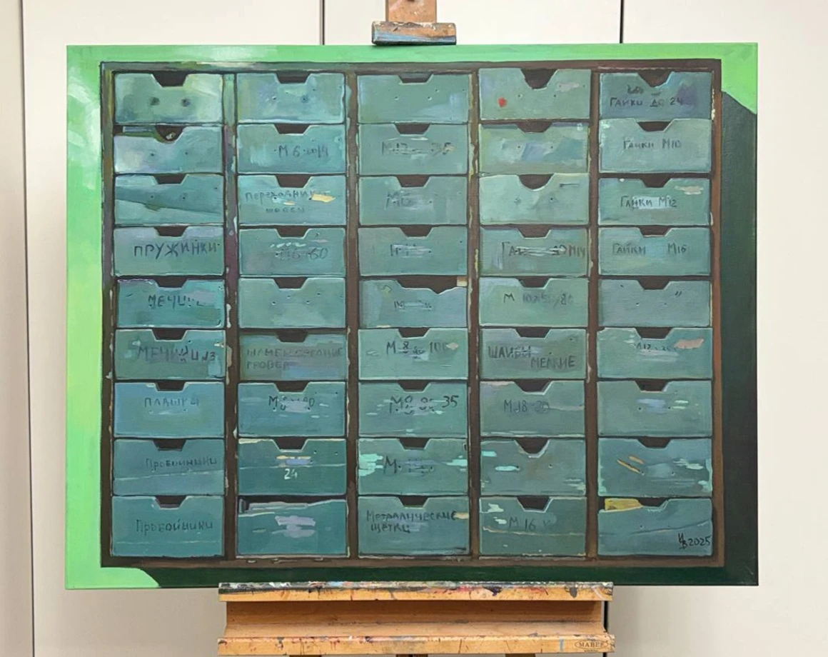 На картине изображен подвесной шкафчик с ящиками для хранения инструментов. Видно, что эти ящики использовались из поколения в поколение, так как они много раз перекрашивались, переписывались маркировки, откалывались кусочки дерева.