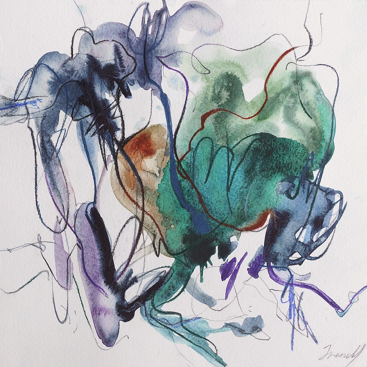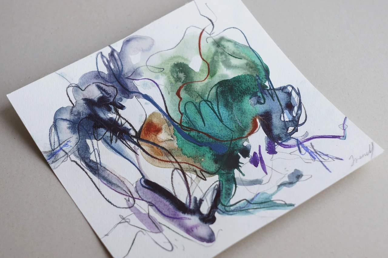 В моей практике независимо от медиума соединяются два подхода: импровизация в материале и внимательная проработка деталей. В работе с графическими материалами первична экспрессия, момент — именно это позволяет создать свободные линии и пятна, передать ощущение динамики и движения в плоскости листа. Я считаю, что такие композиции нужно именно чувствовать и не описывать словами.