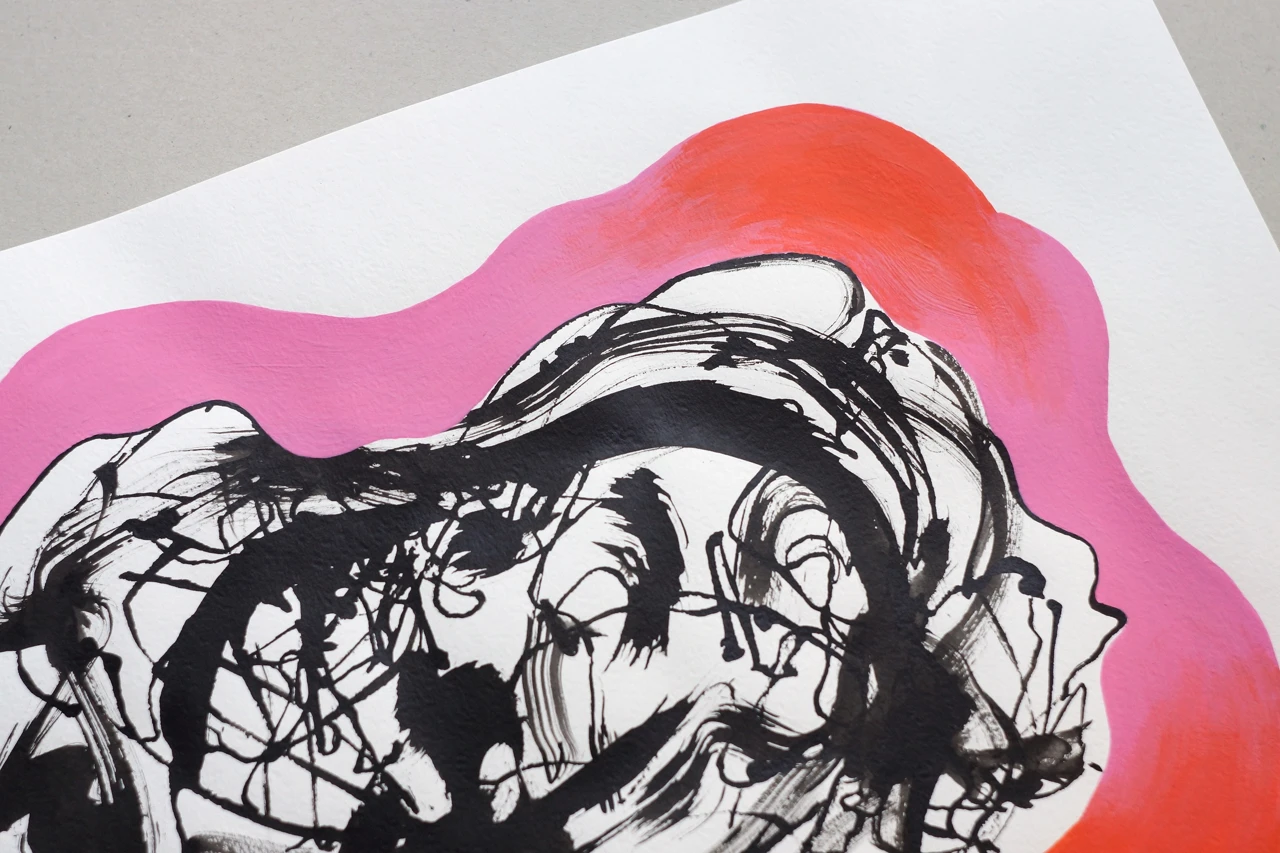 Третья работа серии "Сосуществование". Основа рисунка – хаотичная, замкнутая композиция, выполненная чёрной тушью, экспрессивно, без предварительного эскиза. Эта часть — метафора изменчивости и того, на что мы не в силах повлиять. Цветовые пятна органических форм, аккуратно прорисованные поверх первого слоя, символизируют зону влияния. Диссонирующие части не противостоят друг другу, а естественно сосуществуют в едином пространстве, представляя полную картину какого-либо события.