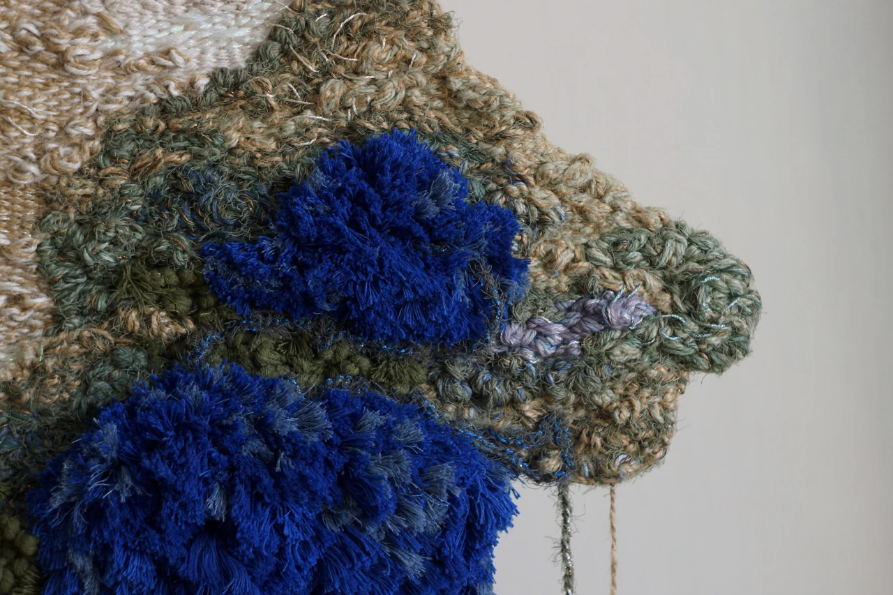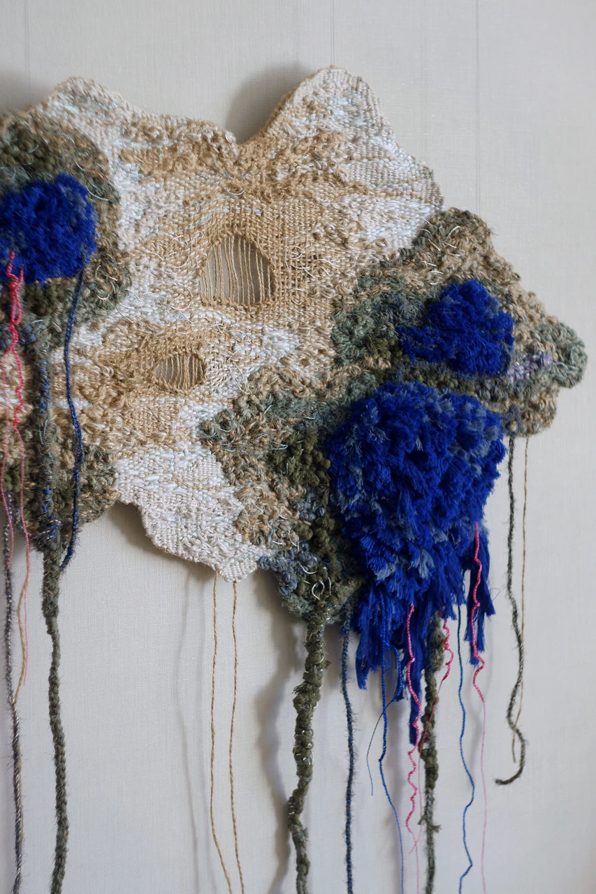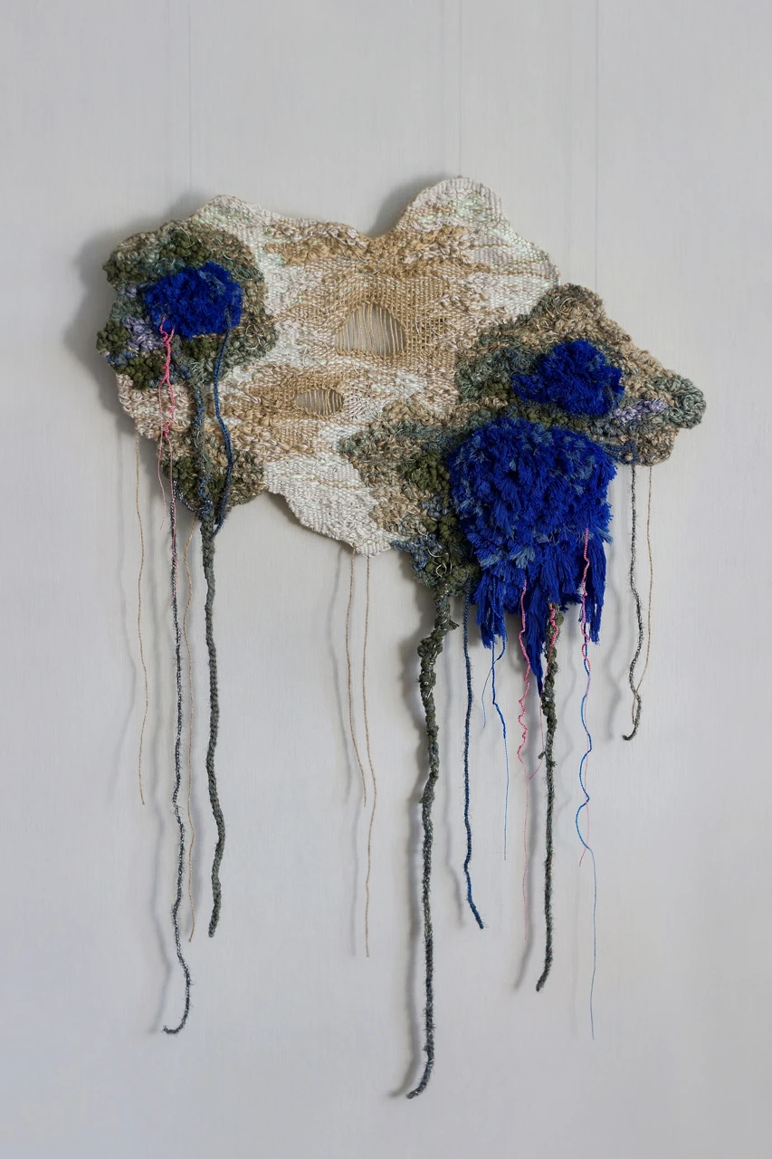 На фоне глобальных процессов я ощущаю себя уязвимой и разочарована тем, что не могу ни на что по-настоящему повлиять. Нуждаясь в пространстве, где смогу почувствовать себя защищённо и даже беззаботно — как в детстве, я создаю собственную утопичную историю. В ней есть место загадочным Сущностям, которые хотят привести людей и Землю к гармоничному сосуществованию. Они могут «поедать» — разрушать или преобразовывать — проблемные объекты и явления, а могут и «лечить» пространства, какое-то время располагаясь на повреждённой территории. Материал помогает рассказать историю. Зарождаясь из блестящей «субстанции», Сущности частично мимикрируют под земные растительные формы и набирают силу для преобразований, что выражается в цвете и объёме тканой поверхности. Пик развития Сущности — ярко-синий «мох», тонкие блестящие нити на котором говорят о том, что суперорганизм готов приступить к своей миссии. Разреженная поверхность, разрывы в полотне — следы борьбы, но сочетание «разрушенных» частей с «живыми» зонами символизирует регенерацию. А это значит, что хэппи-энд неизбежен.