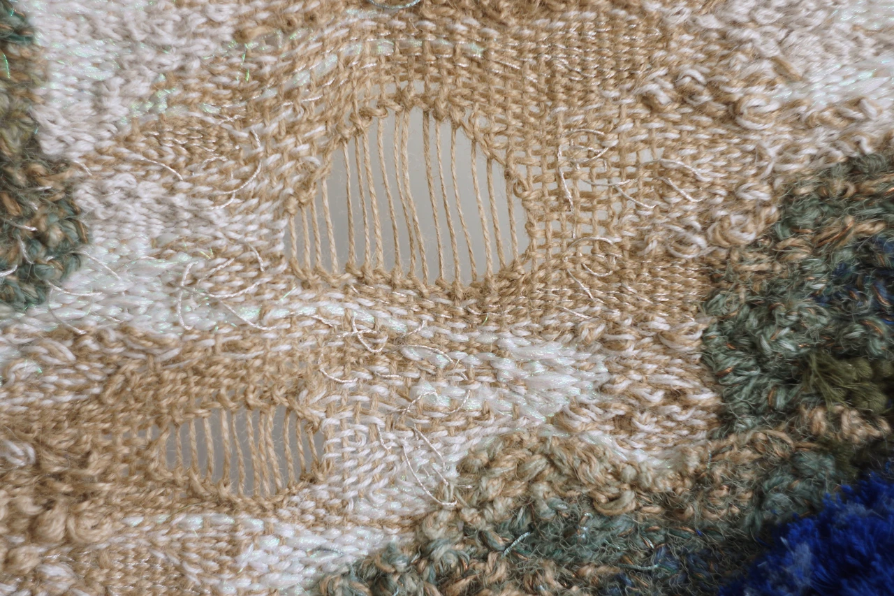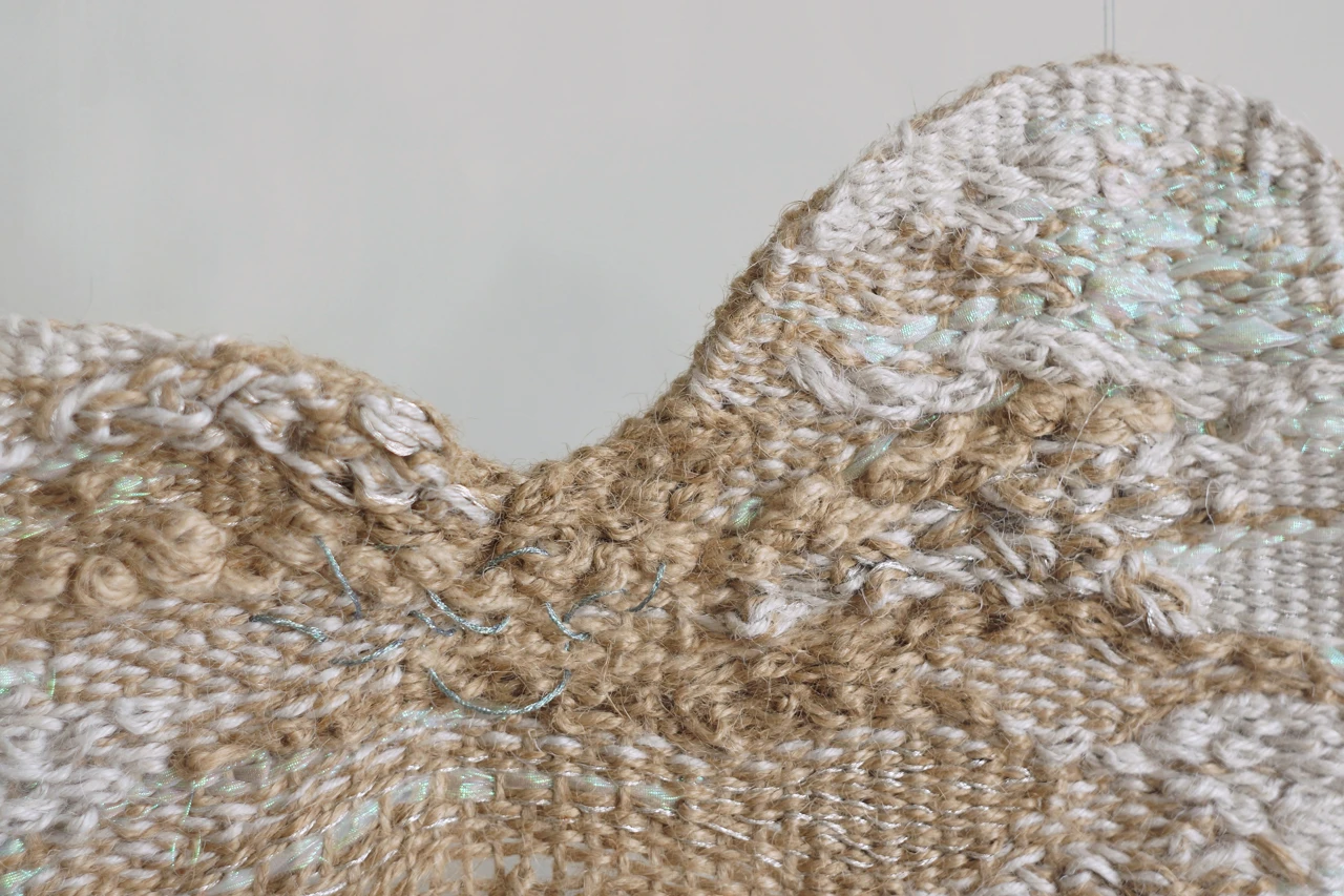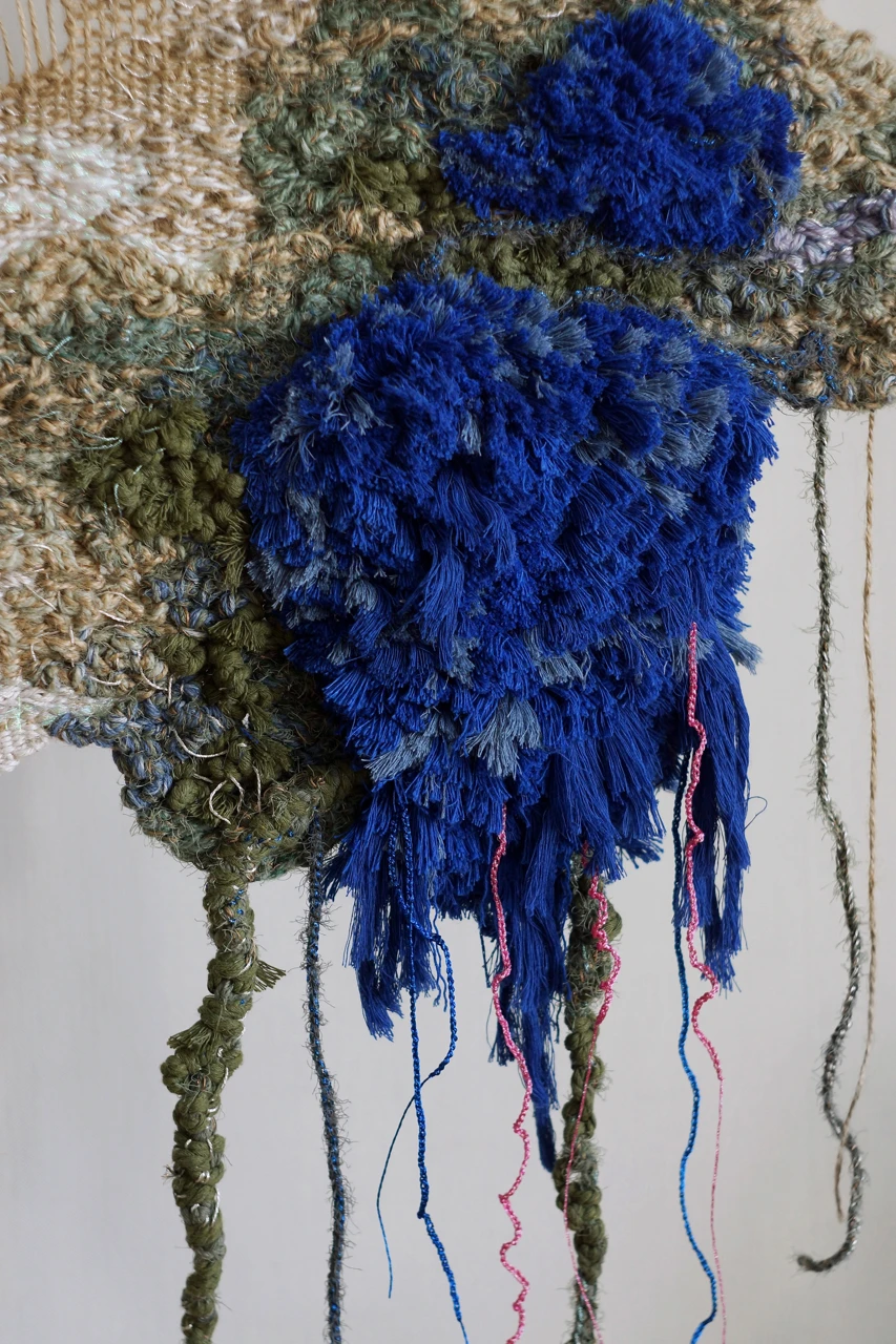 На фоне глобальных процессов я ощущаю себя уязвимой и разочарована тем, что не могу ни на что по-настоящему повлиять. Нуждаясь в пространстве, где смогу почувствовать себя защищённо и даже беззаботно — как в детстве, я создаю собственную утопичную историю. В ней есть место загадочным Сущностям, которые хотят привести людей и Землю к гармоничному сосуществованию. Они могут «поедать» — разрушать или преобразовывать — проблемные объекты и явления, а могут и «лечить» пространства, какое-то время располагаясь на повреждённой территории. Материал помогает рассказать историю. Зарождаясь из блестящей «субстанции», Сущности частично мимикрируют под земные растительные формы и набирают силу для преобразований, что выражается в цвете и объёме тканой поверхности. Пик развития Сущности — ярко-синий «мох», тонкие блестящие нити на котором говорят о том, что суперорганизм готов приступить к своей миссии. Разреженная поверхность, разрывы в полотне — следы борьбы, но сочетание «разрушенных» частей с «живыми» зонами символизирует регенерацию. А это значит, что хэппи-энд неизбежен.