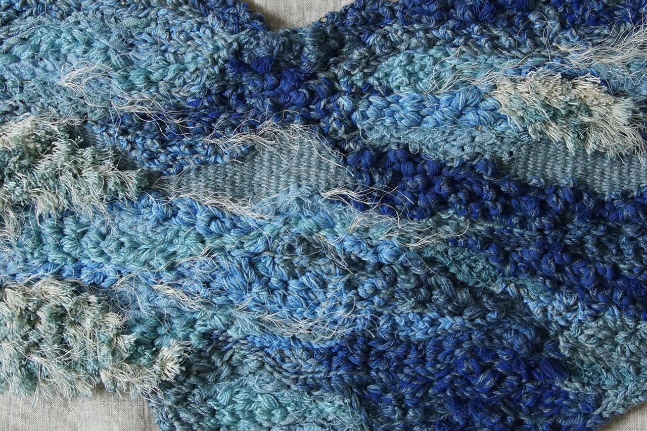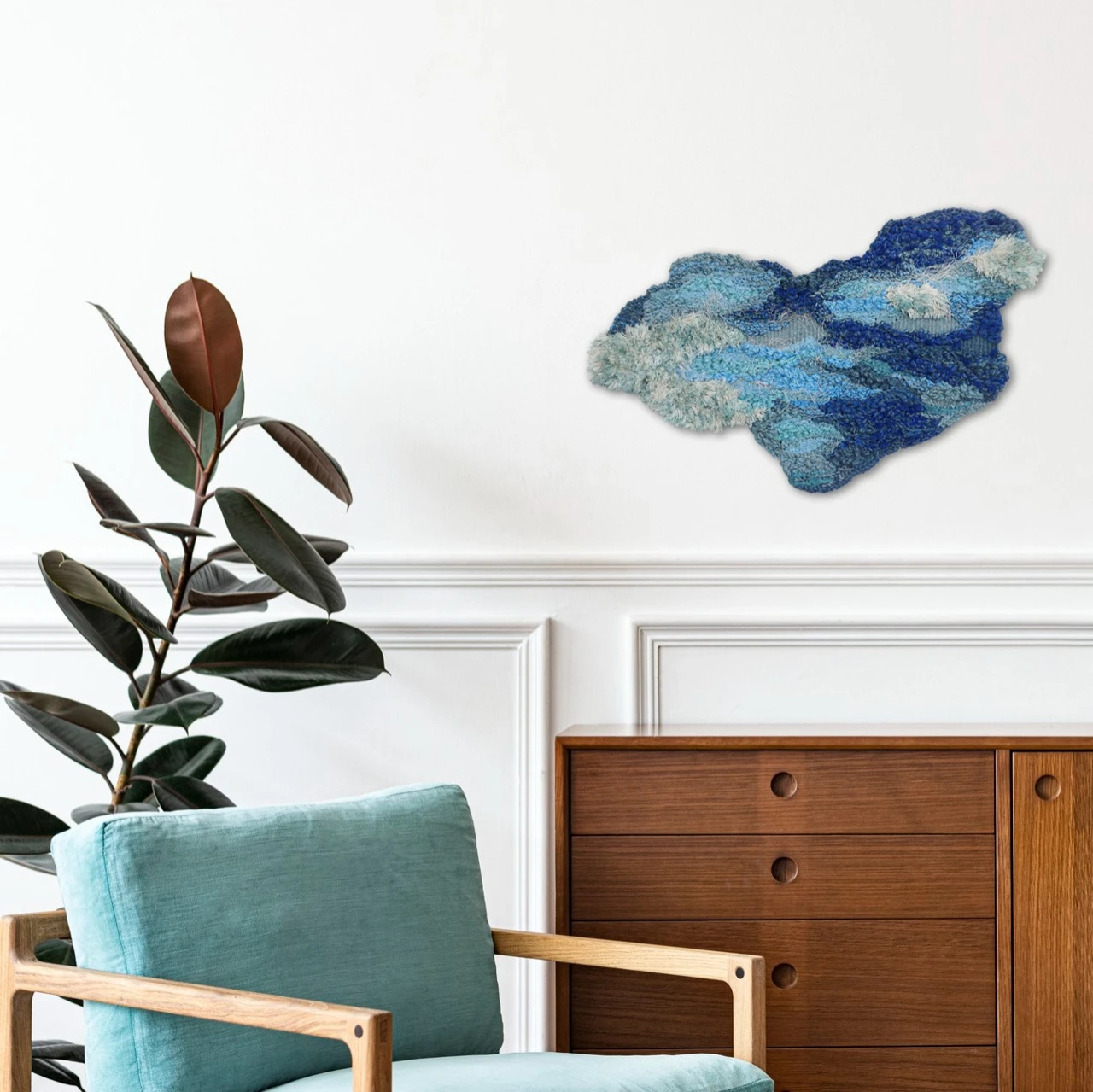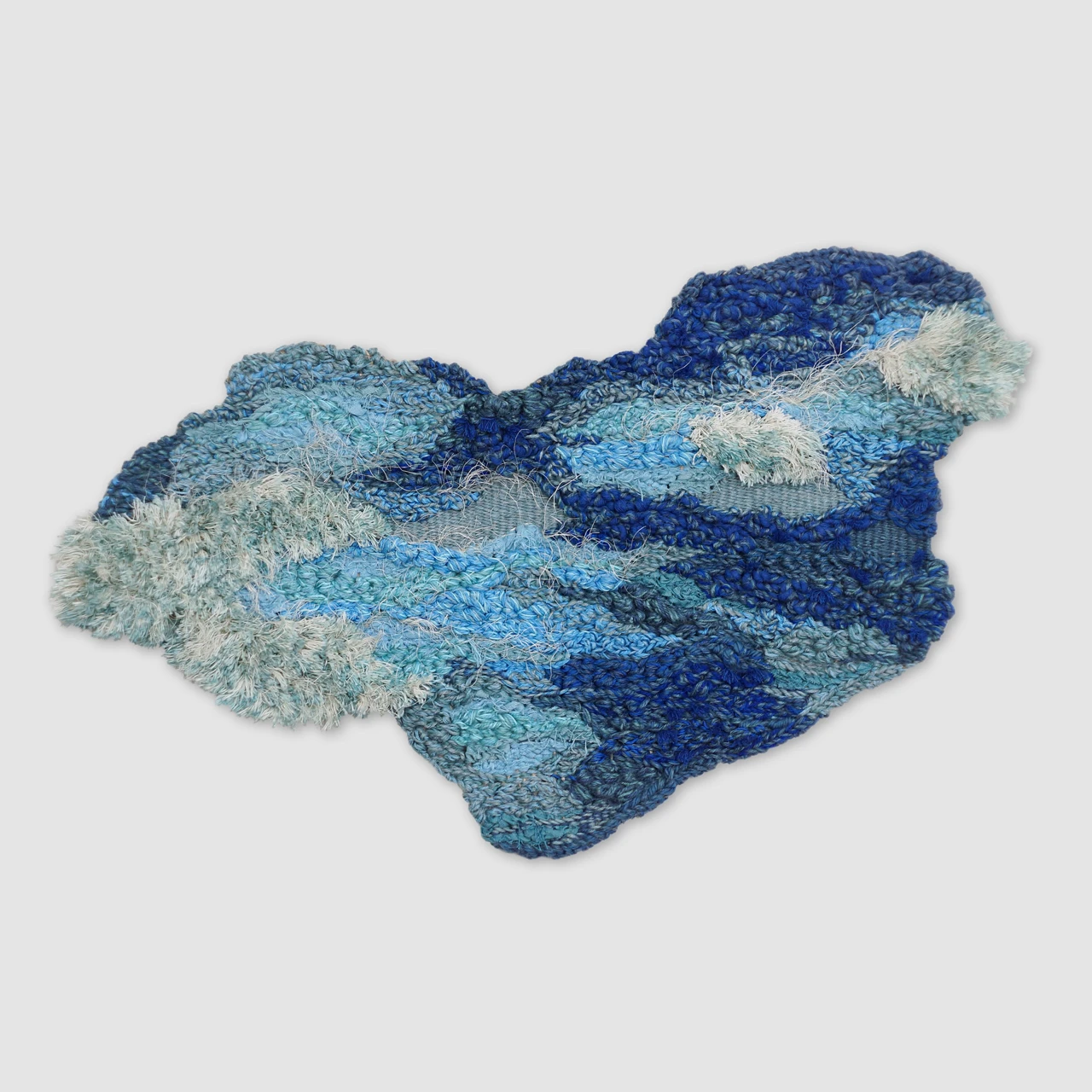 Гобелен "В глубину" соткан из оттенков тёплого моря — от яркой бирюзы до глубокого синего. На изнанке панно есть две петли для подвешивания.