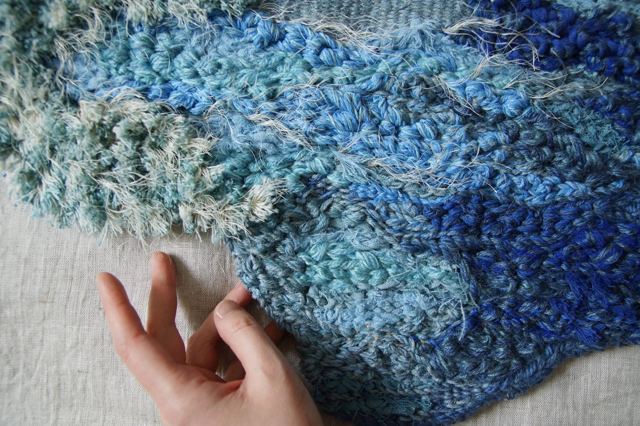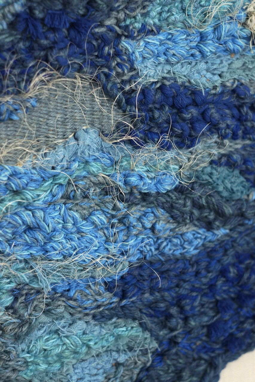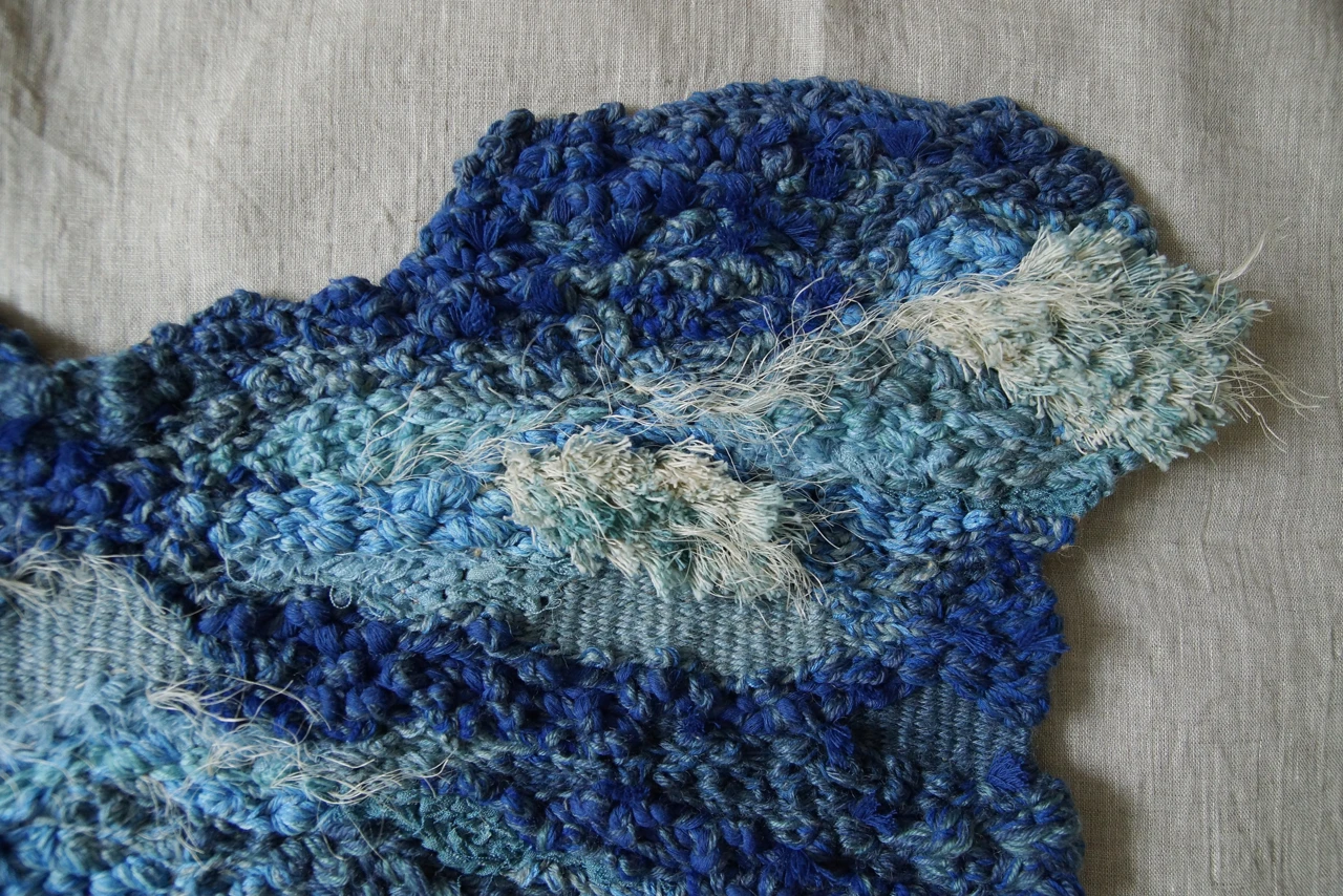 Гобелен "В глубину" соткан из оттенков тёплого моря — от яркой бирюзы до глубокого синего. На изнанке панно есть две петли для подвешивания.