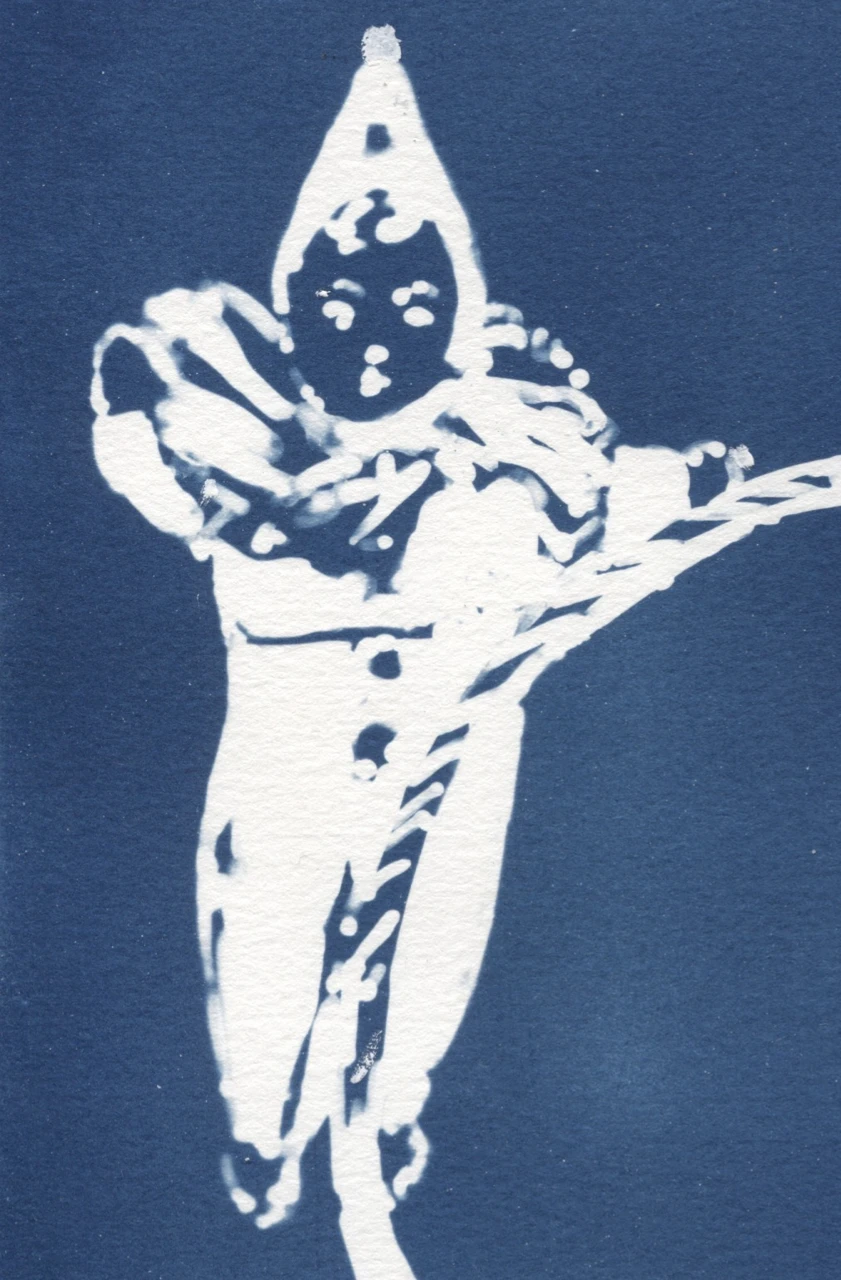 Цианотипный отпечаток выполнен на основе оригинальной акварельной работы с ватной игрушкой-арлекином. Негатив для отпечатка был выполнен вручную.
