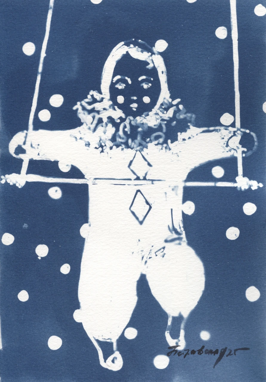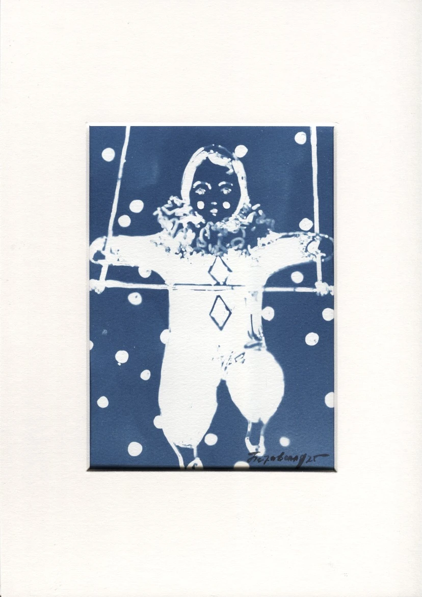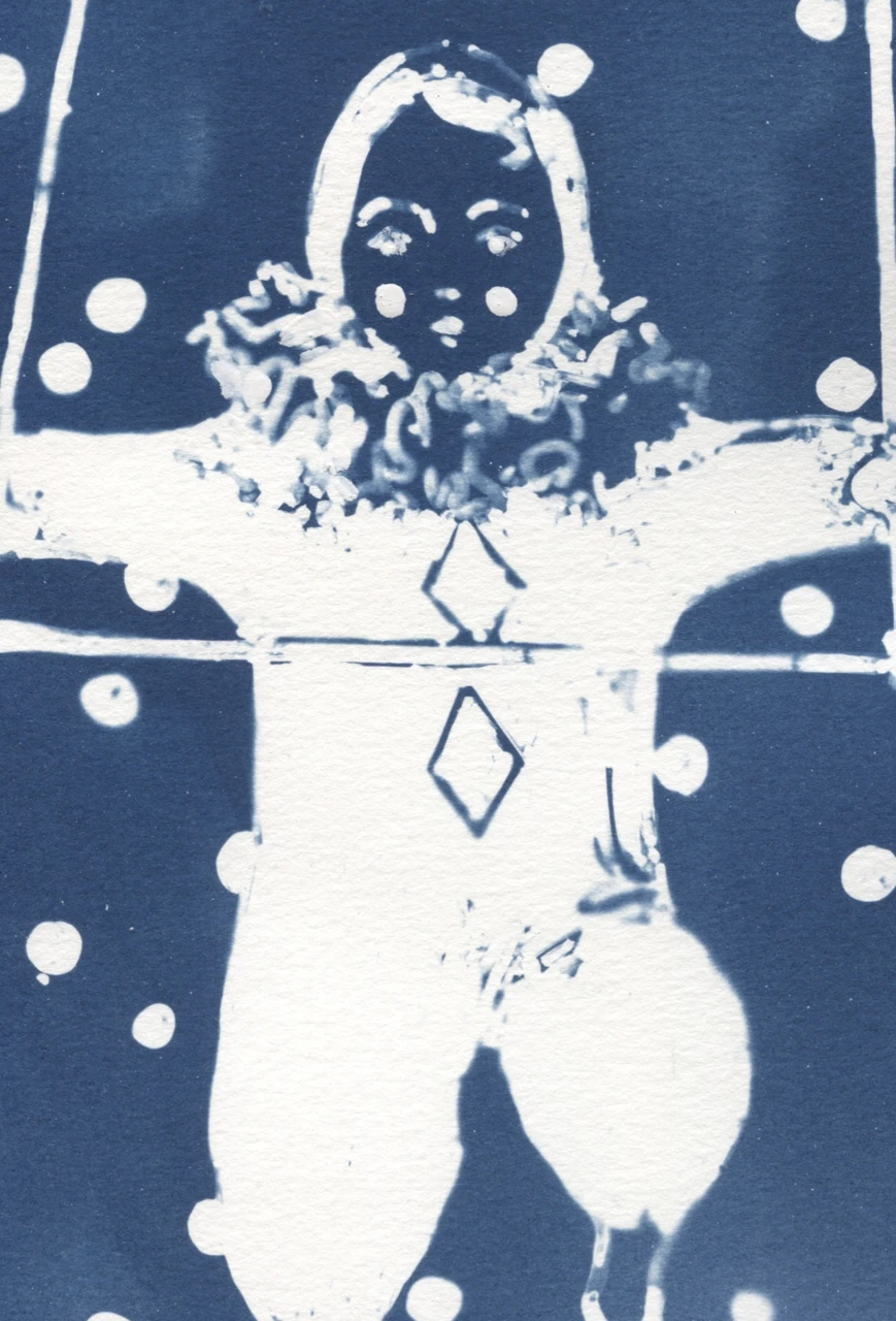 Цианотипный отпечаток с ватной игрушкой - Арлекином.