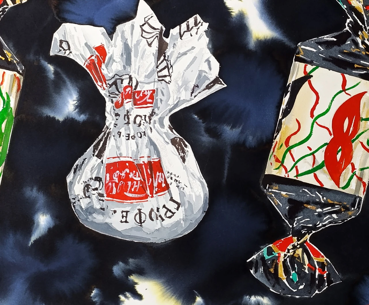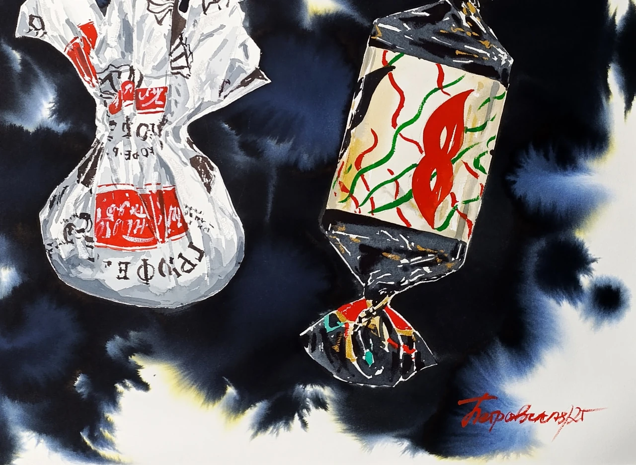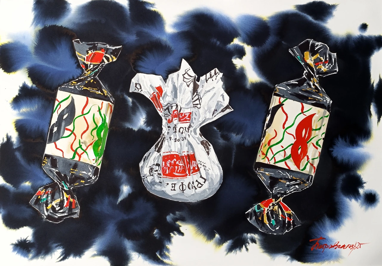 Графическая работа с любимыми конфетами в блестящих обертках.