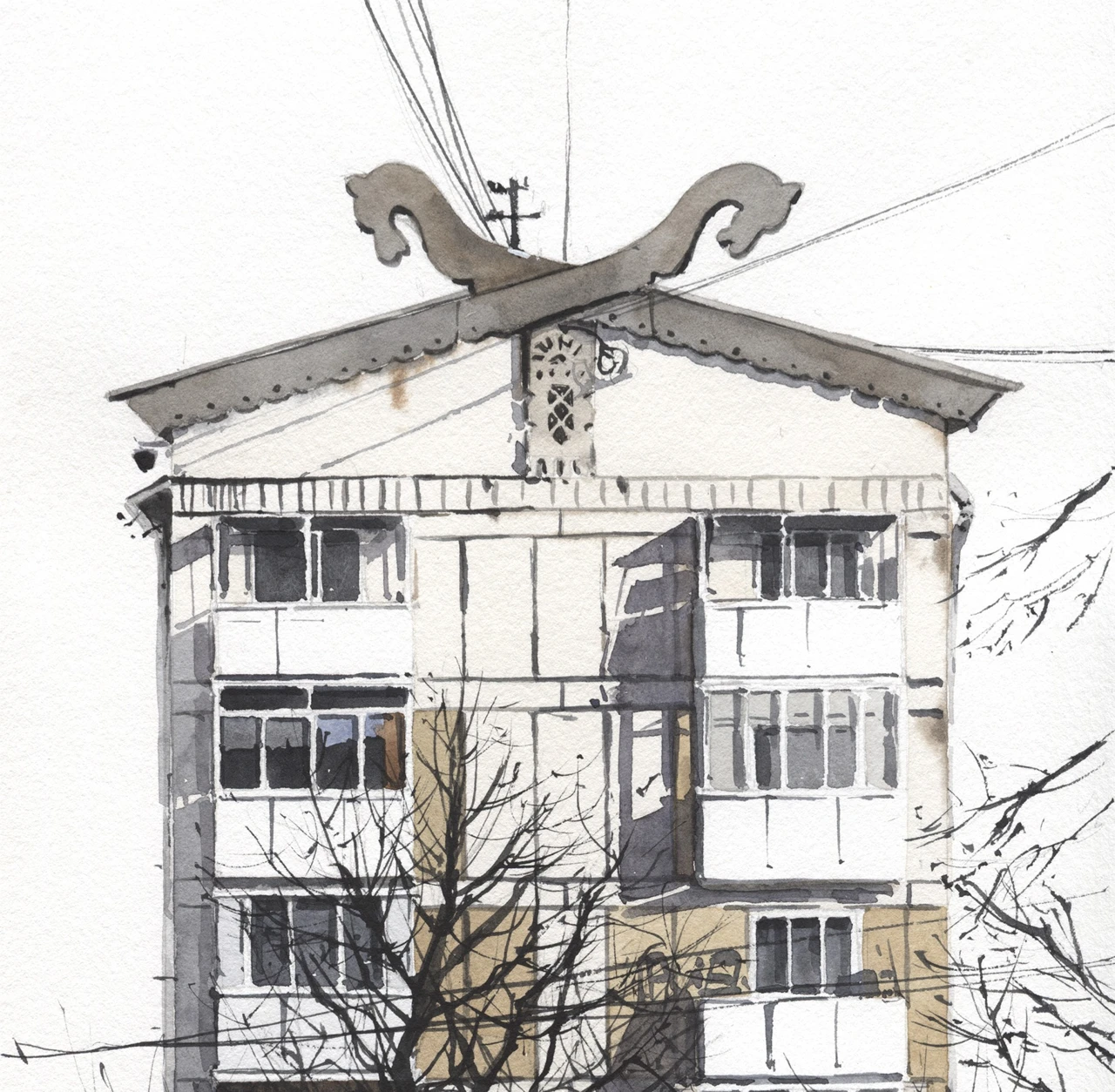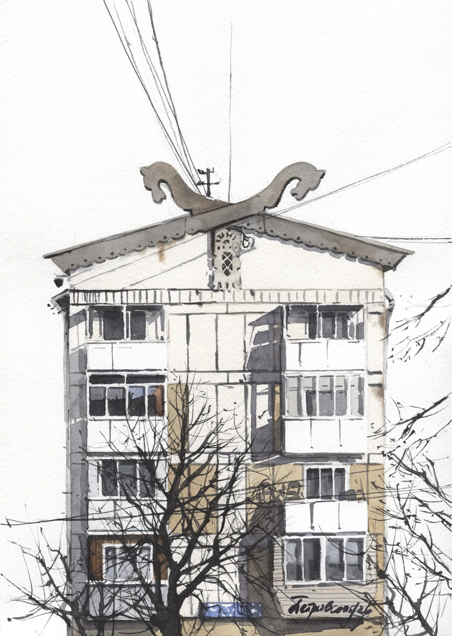 Размышления о том, как могла бы выглядеть стандартная панельная пятиэтажка если добавить ей старославянского колорита в виде конька на крыше.