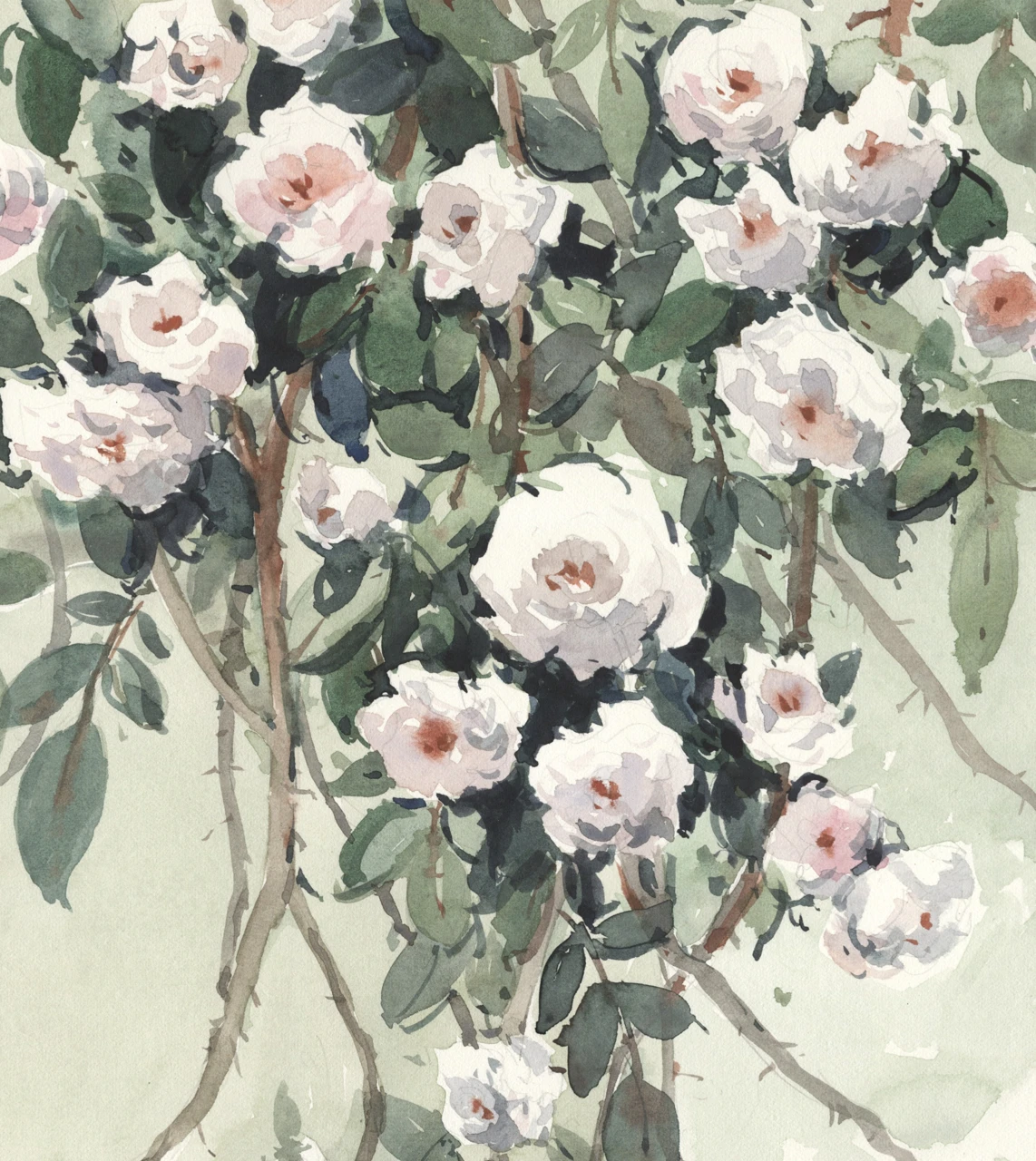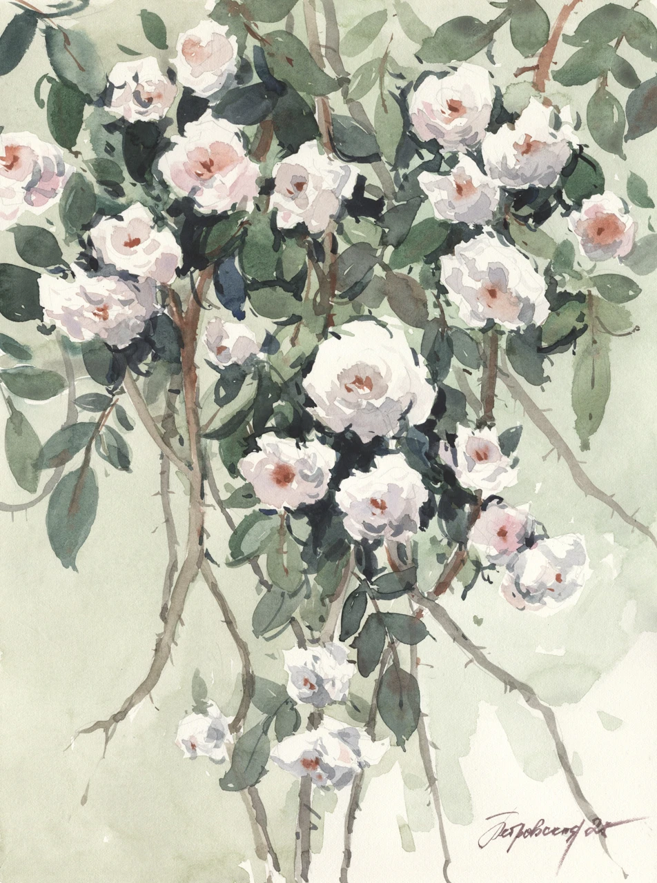 Акварельный этюд с дикими розами в саду.