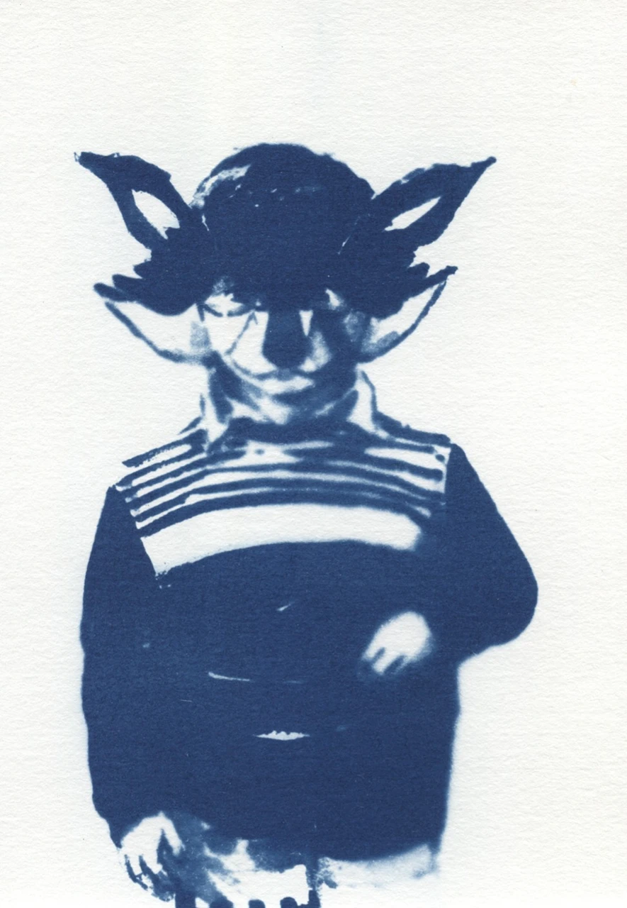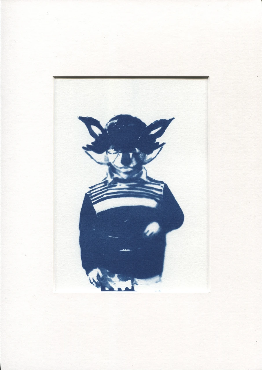 Работа выполнена в технике цианотипия с помощью негатива с оригинальной акварельной работы, светочувствительного раствора и УФ лампы.
