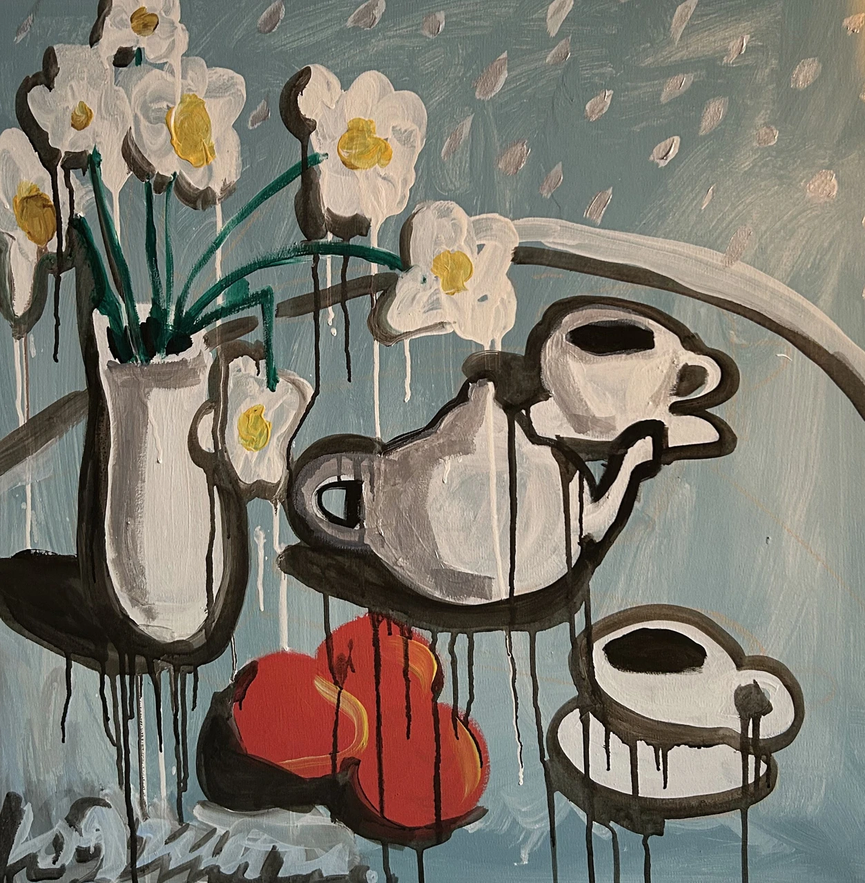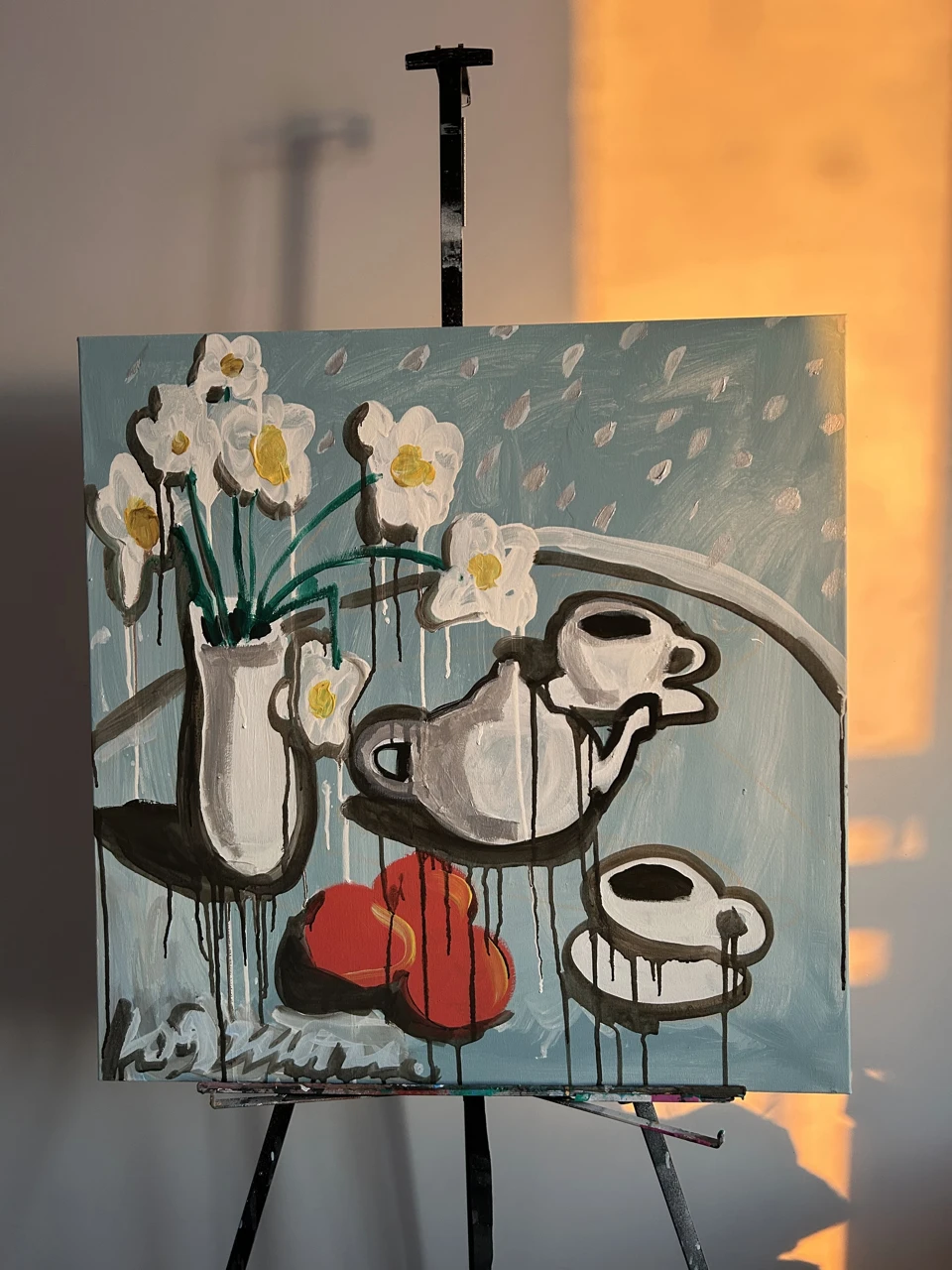 На картине — современный натюрморт с ромашками, построенный на контрасте нежности и выразительной. В высокой вазе распускаются белые цветы с тёплыми жёлтыми серединками — они словно светятся на холодновато-голубом фоне. Рядом на столе — чайник, чашка и блюдце: простые домашние предметы создают ощущение тихого утреннего чаепития. Особое настроение задают намеренные потёки краски и тёмные контуры: они придают композиции динамику и ощущение «живого» момента, как будто сцена ещё продолжается. Красный фруктовый акцент внизу усиливает теплоту и балансирует спокойные оттенки фона. В результате натюрморт выглядит одновременно уютным и смелым, что отлично дополнит любой интерьер.
