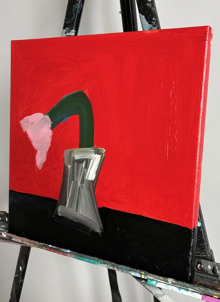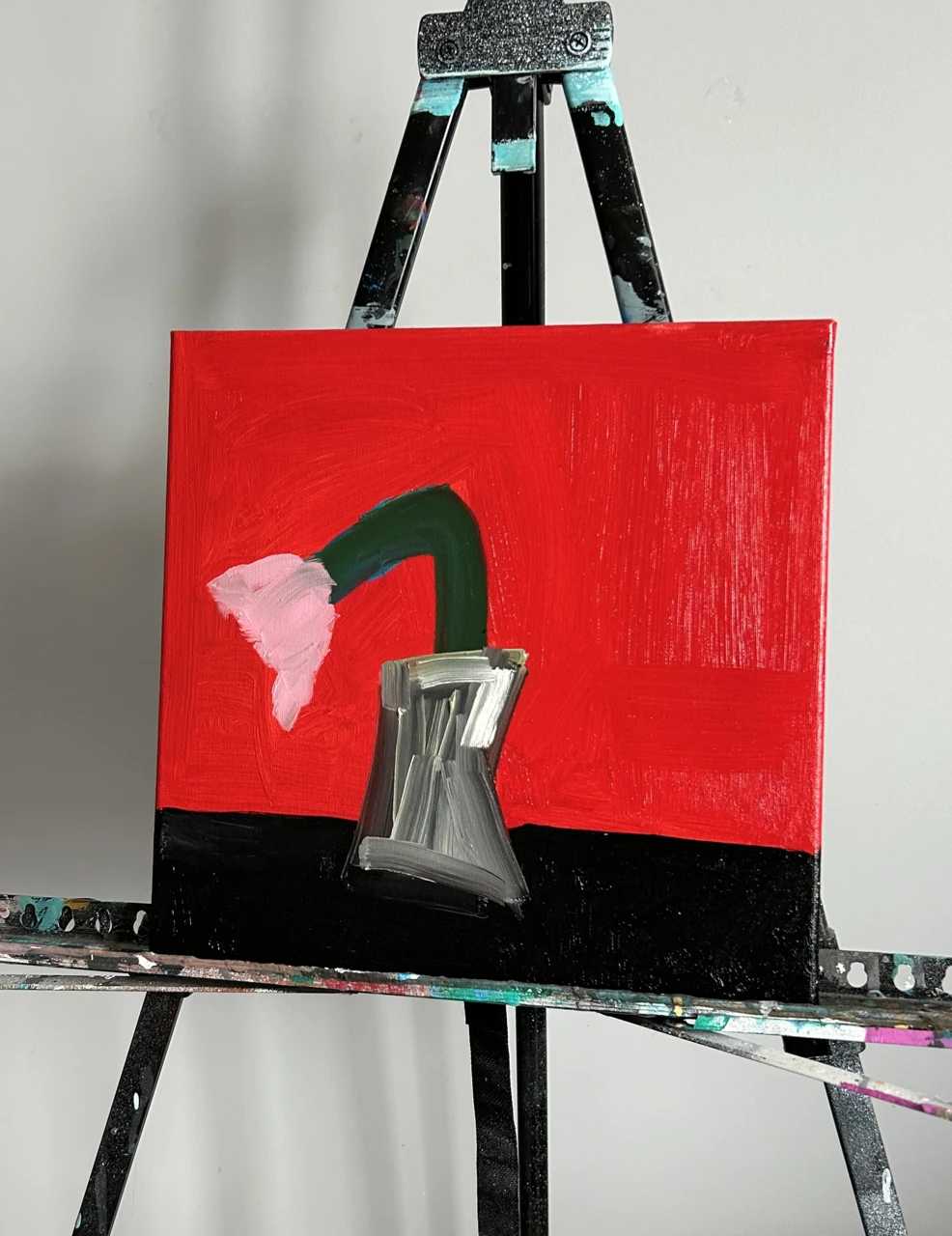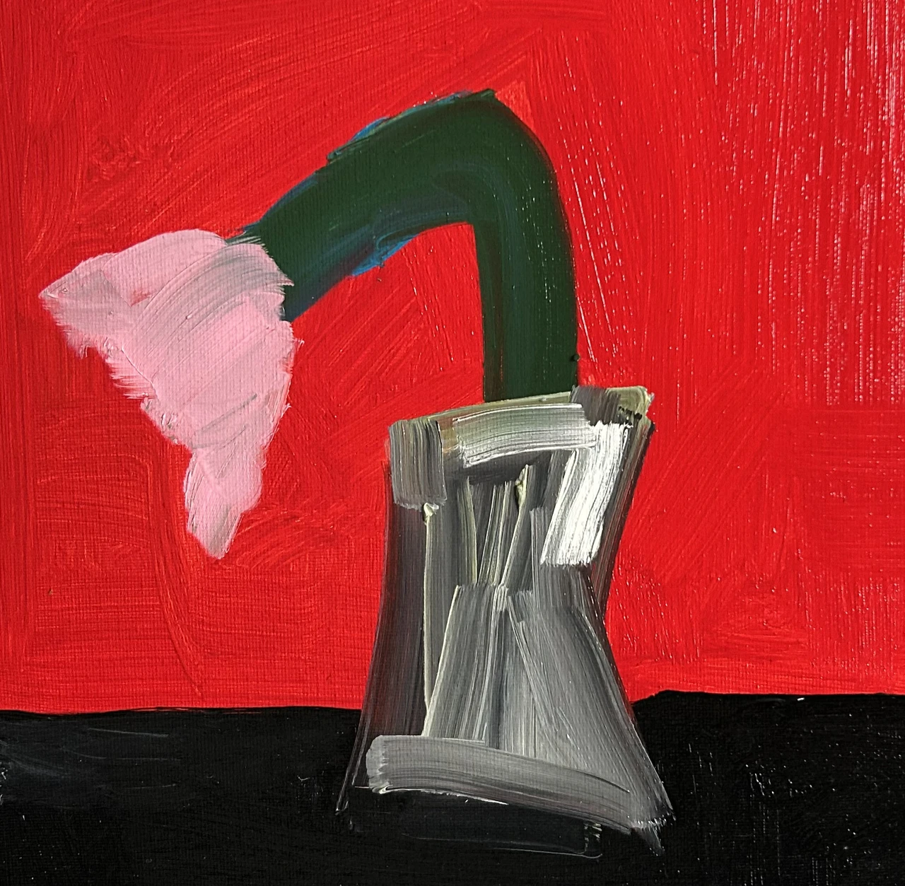 На ярко красном фоне, возникает лаконичный «цветок» — не ботанический образ, а знак. Изломанный зелёный стебель держит нежно‑розовый лепесток, а внизу — холодная серебристо‑серая форма, напоминающая вазу. Контраст плотных цветовых плоскостей и свободных мазков превращает композицию в диалог энергии и тишины: красный звучит как импульс, а светлые акценты дают ощущение хрупкой жизни, пробивающейся сквозь геометрию. Картина о том, как чувство становится формой — и как минимальными средствами можно сказать о нежности в мире строгих линий.