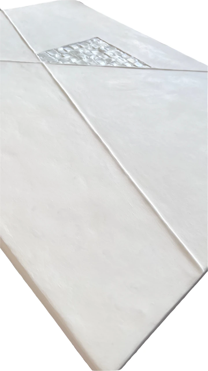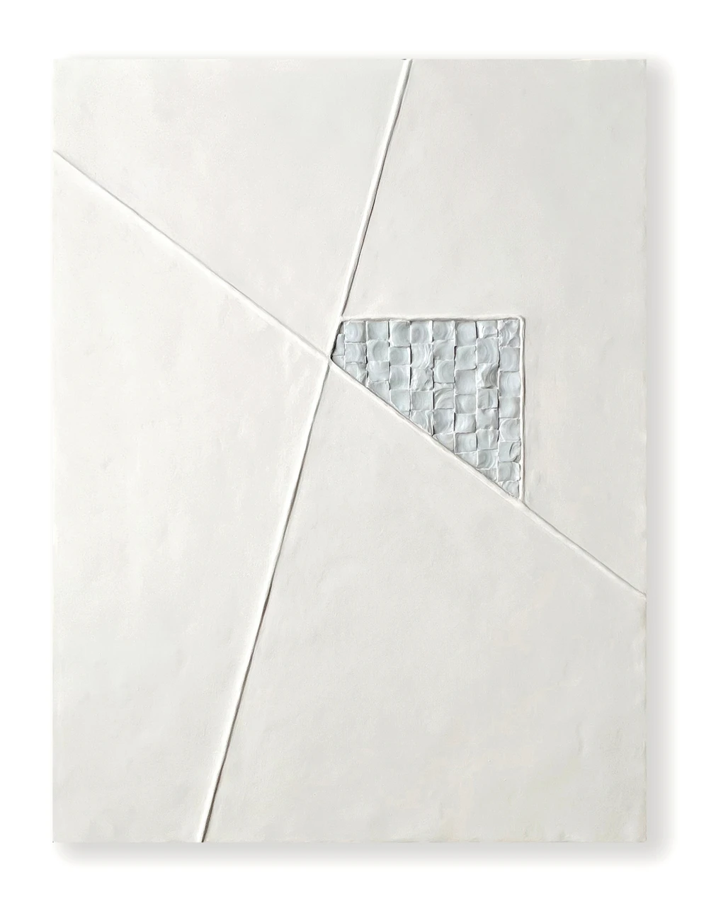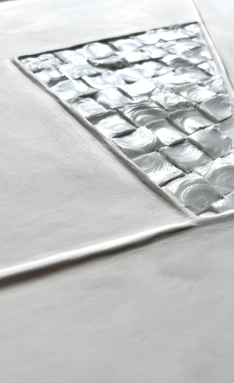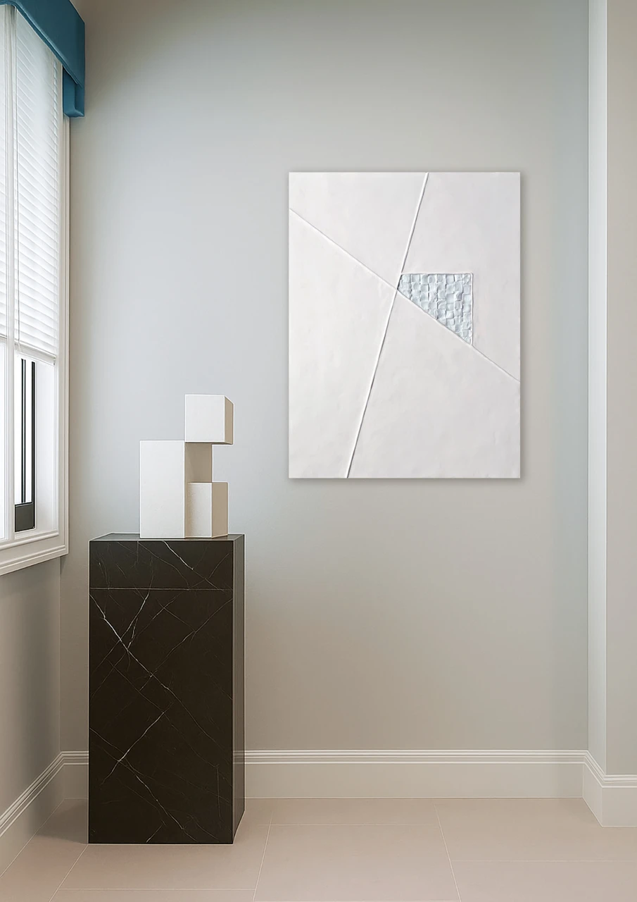 Работа исследует взаимосвязь формы и восприятия: как простые геометрические складки улавливают и перенаправляют свет, как небольшое отверстие (мозаичное «окно») меняет восприятие аскетичного поля. Работа предлагает тишину как свойство материала — тихую архитектуру, располагающую к пристальному рассмотрению и неспешному созерцанию.
