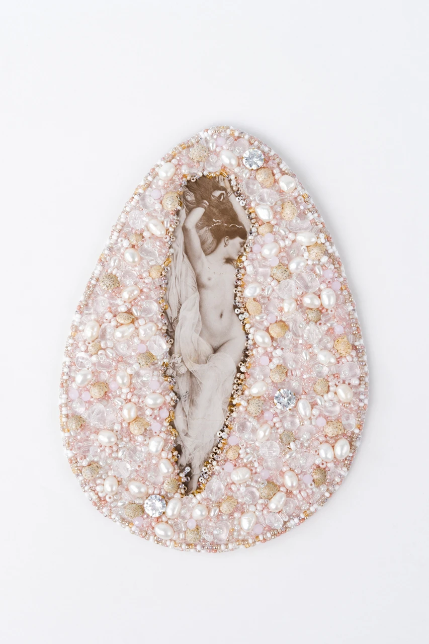 Настенный объект серии «Континуум сознавания» выполнен в форме яйца — символа хрупкости, защиты и цикличности. Объект вышит вручную и изображает контакт с миром. В центре — вырезка обнажённого человеческого тела из найденной старинной открытки — отсылка к прошлому и ощущению собственного тела.