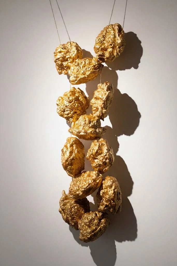 Объект выполнен из монтажной пены, которая позволила добиться уникальной «пухлой» и пористой фактуры, вызывающей ассоциации с фантастической выпечкой. Поверхность покрыта золотой акриловой краской, имитирующей драгоценный металл. Объект обильно инкрустирован стразами, что подчеркивает его сказочный, сновидческий статус и отсылает к эстетике «сокровищ» нежного возраста. Высота 109 см превращает «Фенечку» из аксессуара в полноценную скульптуру, доминирующую в интерьере.