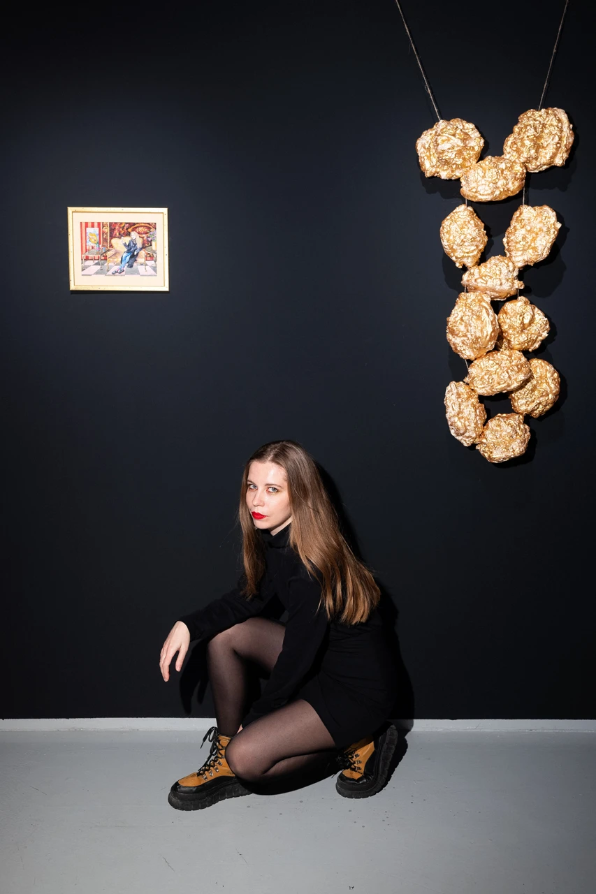 Гипертрофированная, искрящаяся сказочная «Фенечка» Юлии Шафаростовой — это загадочный артефакт, будто созданный из золотых космических пирожных, декорированных стразами. Работа напоминает о заветных детских увлечениях: искусство плетения браслетов из бисера, известных как «фенечки», увлекало Юлю днями, а ночами являлось во снах в виде величественных объектов.