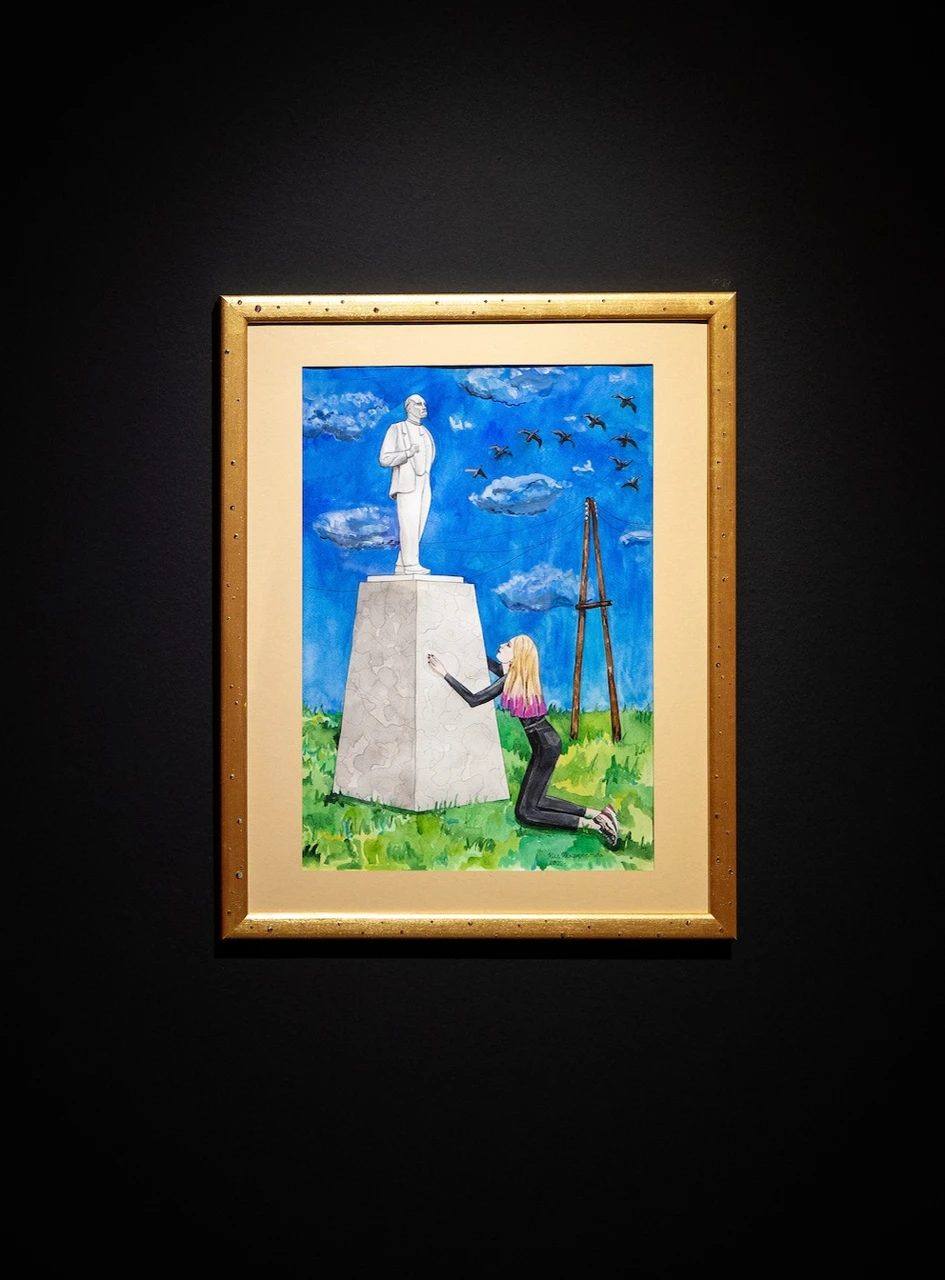 Эта работа — ироничное исследование того, как суровые символы прошлого превращаются в уютные детали повседневности. Художница изображает себя в «молитвенной» позе перед типовым памятником Ленину, который можно встретить в любом российском городе. Для автора такие монументы стали «маркерами дома»: их повсеместность дарит чувство узнаваемости и безопасности. Работа переосмысляет анахронизм советской утопии, превращая «идеологическую бомбу» в объект доброго умиления и личного мифа.