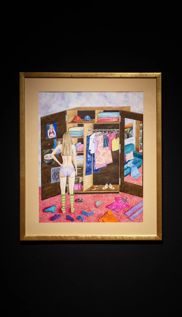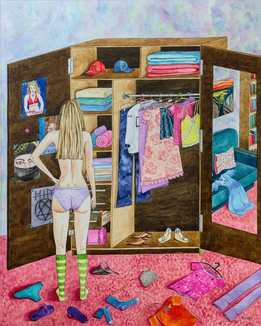 Это «археологическое погружение» в эстетику и самоощущение начала нулевых. Художница запечатлела интимный момент подросткового самопознания: героиня стоит перед шкафом-алтарем, обклеенным постерами Бритни Спирс, Наталии Орейро и кумиров из сериала «Клон». Работа иронично осмысляет моду эпохи «картонных примерочных» на рынках — от подделок D&G до остроносых туфель, которые тогда казались пределом мечтаний. Это размышление о том, как массовая культура, экранные образы и рыночный китч формировали идентичность целого поколения. Отражение репродукции «Крика» Мунка в зеркале шкафа добавляет работе глубины, намекая на экзистенциальную тревогу, скрытую за глянцевыми плакатами.