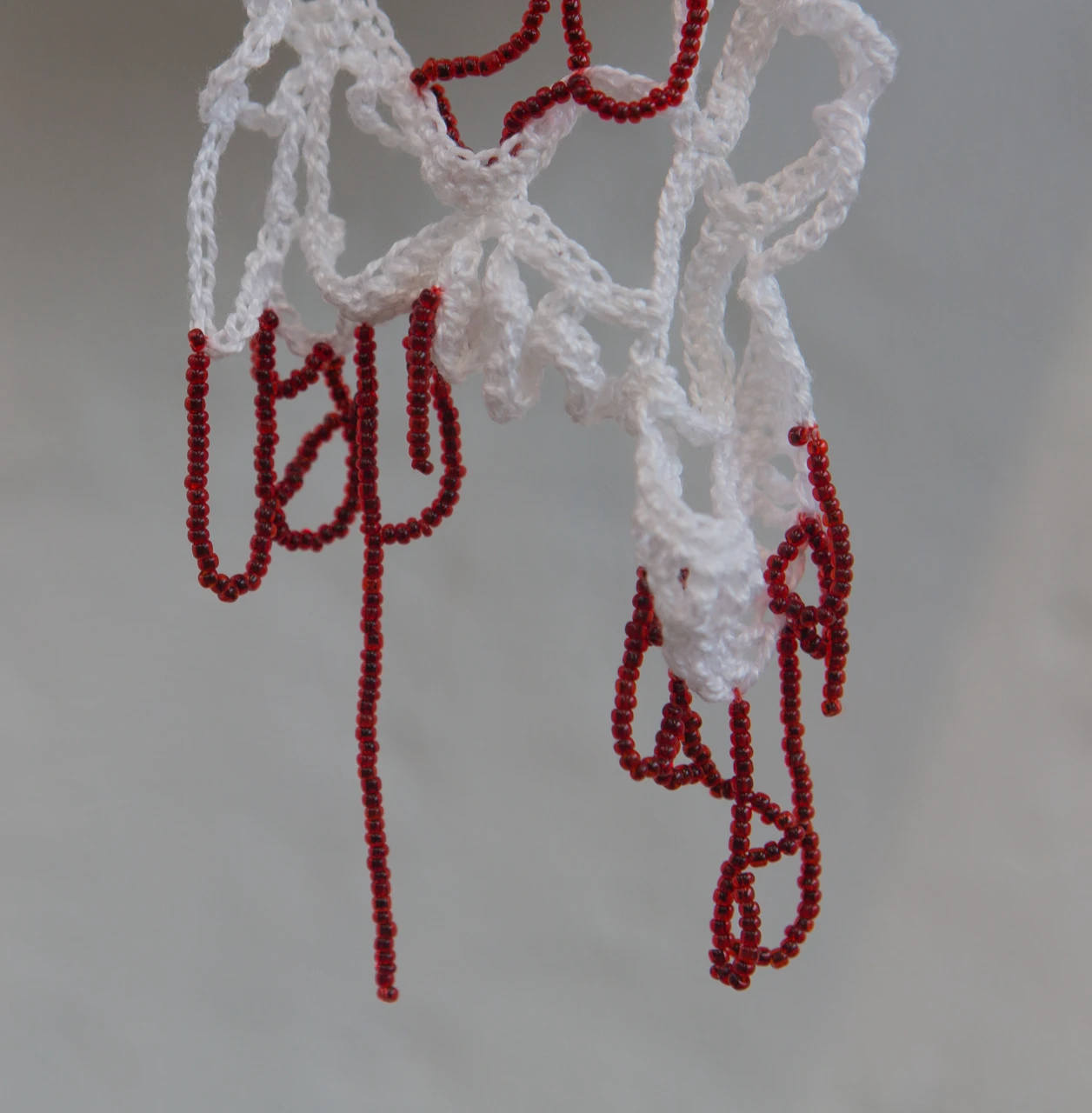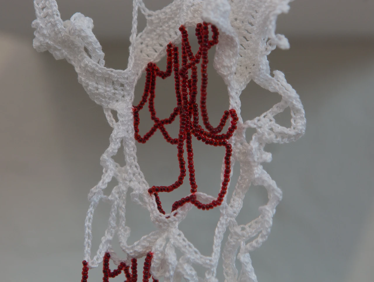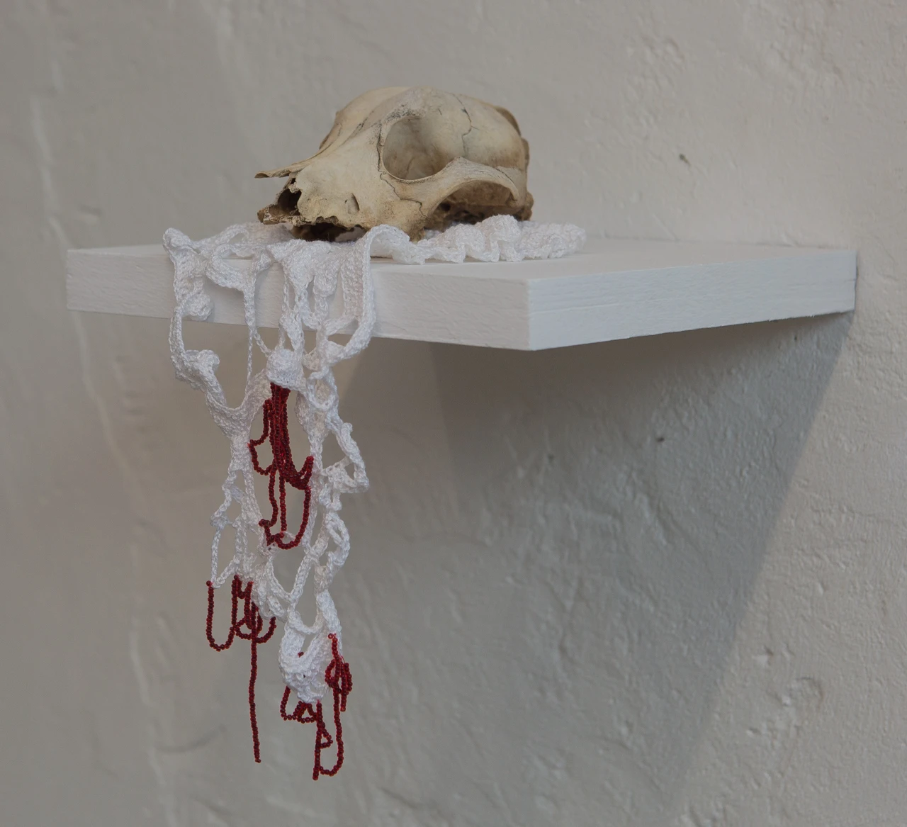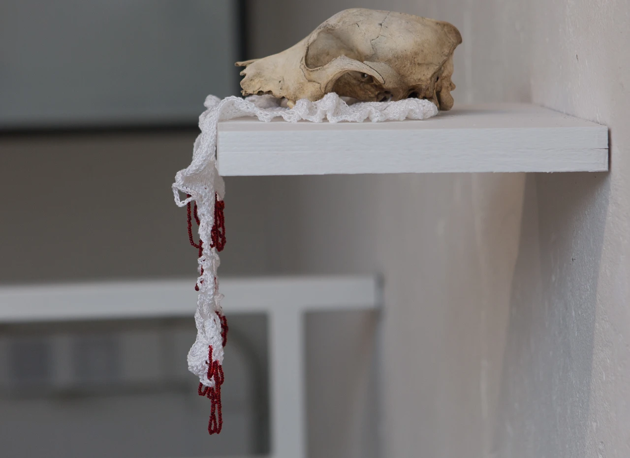 Найденный в лесу череп размещен на специально связанную для него стекающую салфетку с бисером, имитирующим кровь. Работа в духе memento mori.