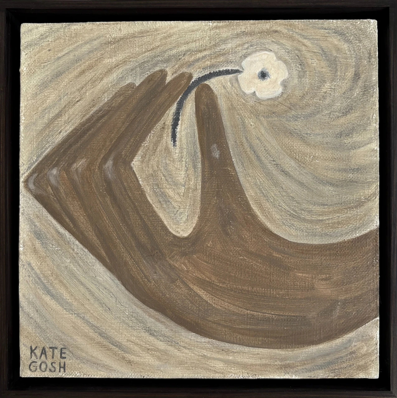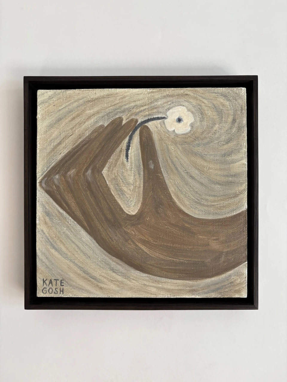 Работа «Цветок в руке» (из серии «Хрупкие вещи») представляет собой авторскую работу, выполненную в смешанной технике. Композиция фокусируется на изображении руки, держащей тонкий стебель с небольшим белым цветком. Цветовая палитра работы сдержанная, преобладают оттенки коричневого, бежевого и серого, создавая ощущение спокойствия и интимности. Линии фона выполнены в виде спиралевидных мазков, которые подчеркивают центральный элемент композиции и придают ей глубину. Текстура холста и мазки краски создают тактильное ощущение, усиливая восприятие хрупкости объекта. Эта авторская работа станет выразительным арт-объектом для интерьера, добавляя нотку утонченности и размышления.