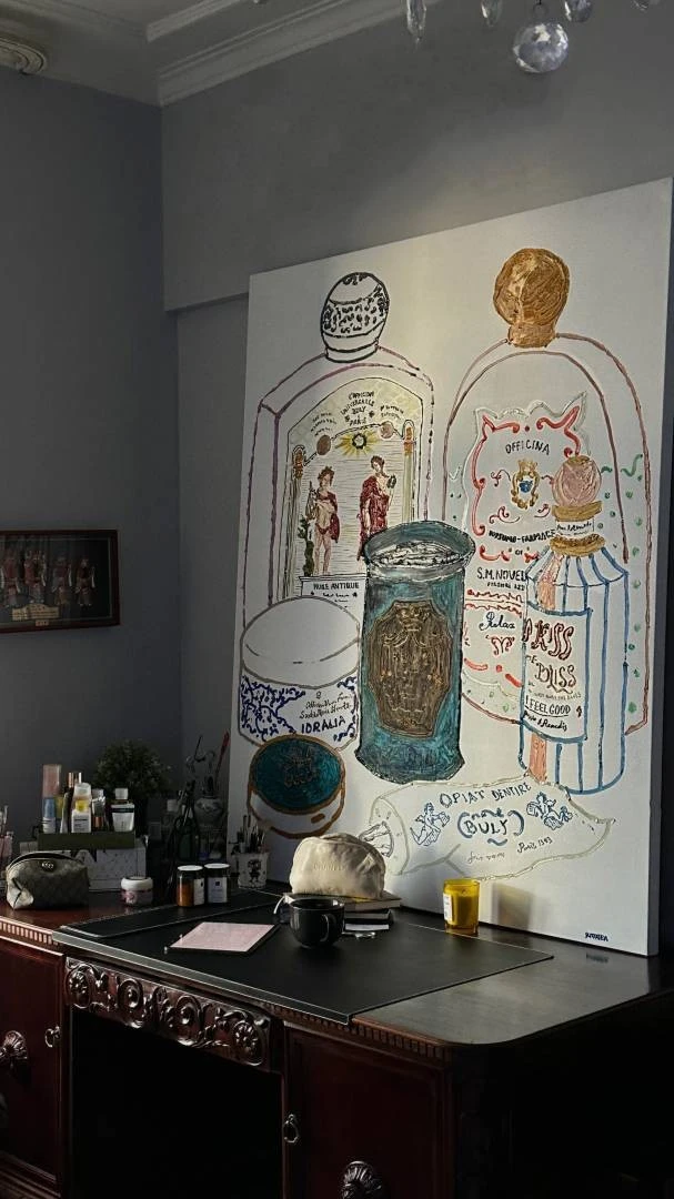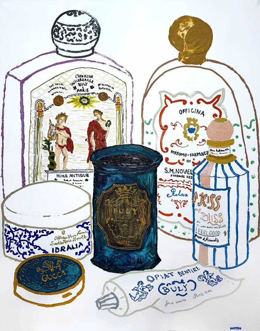 Холст из серии работ «Essentials», в которой художница создает портреты людей через их вещи, опираясь на теорию общества потребления.