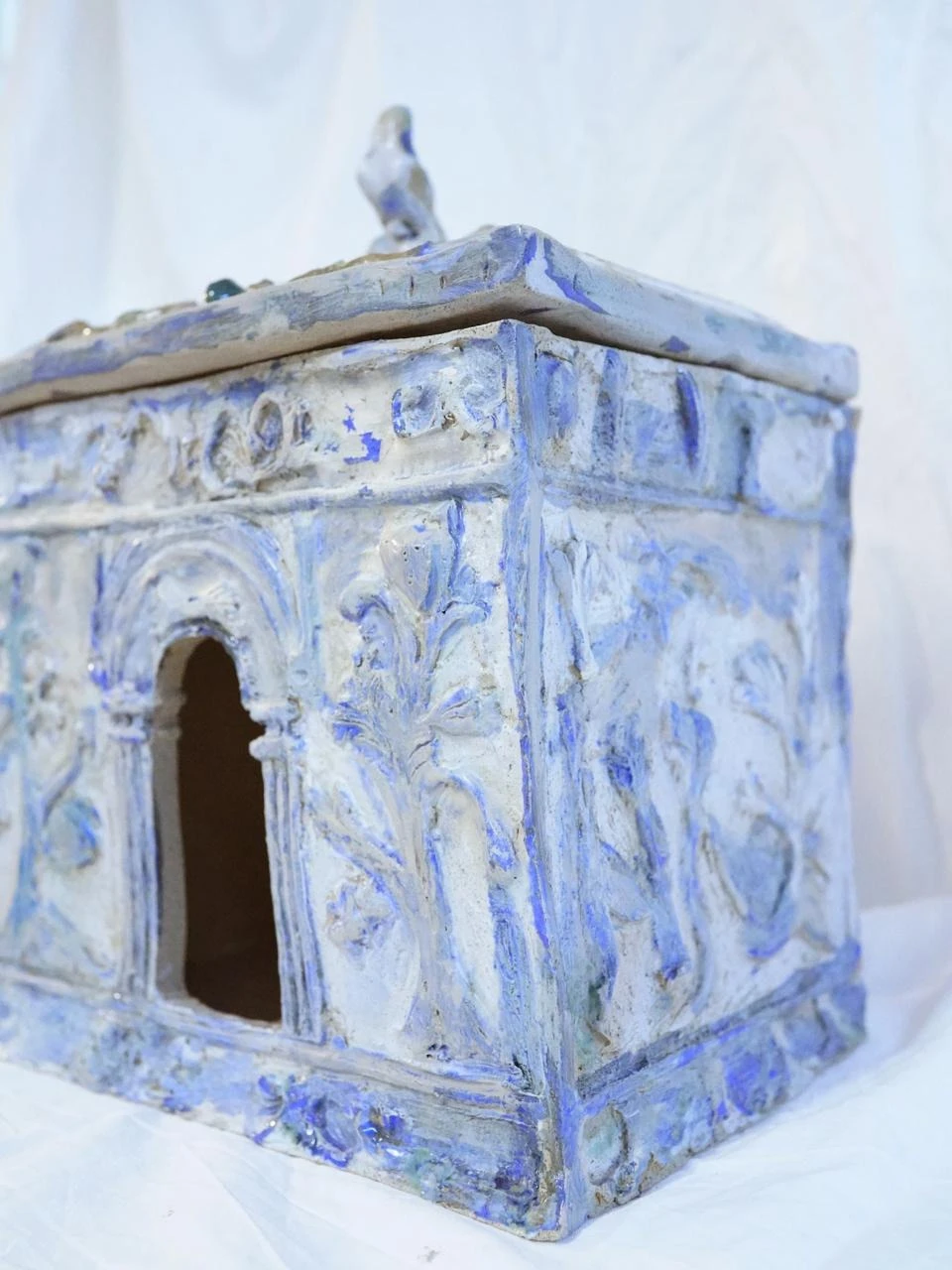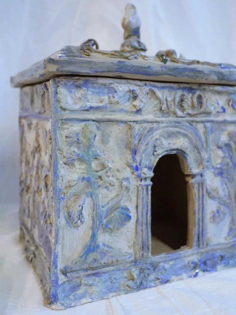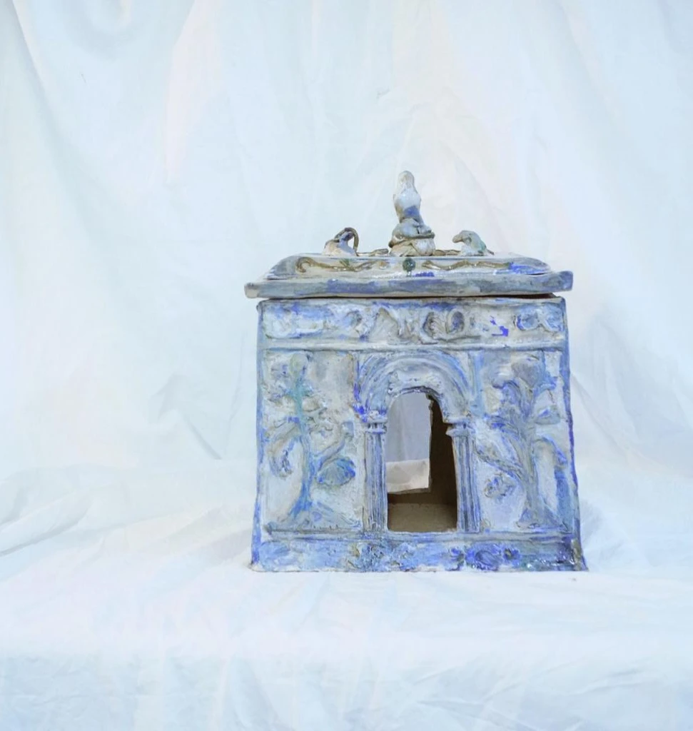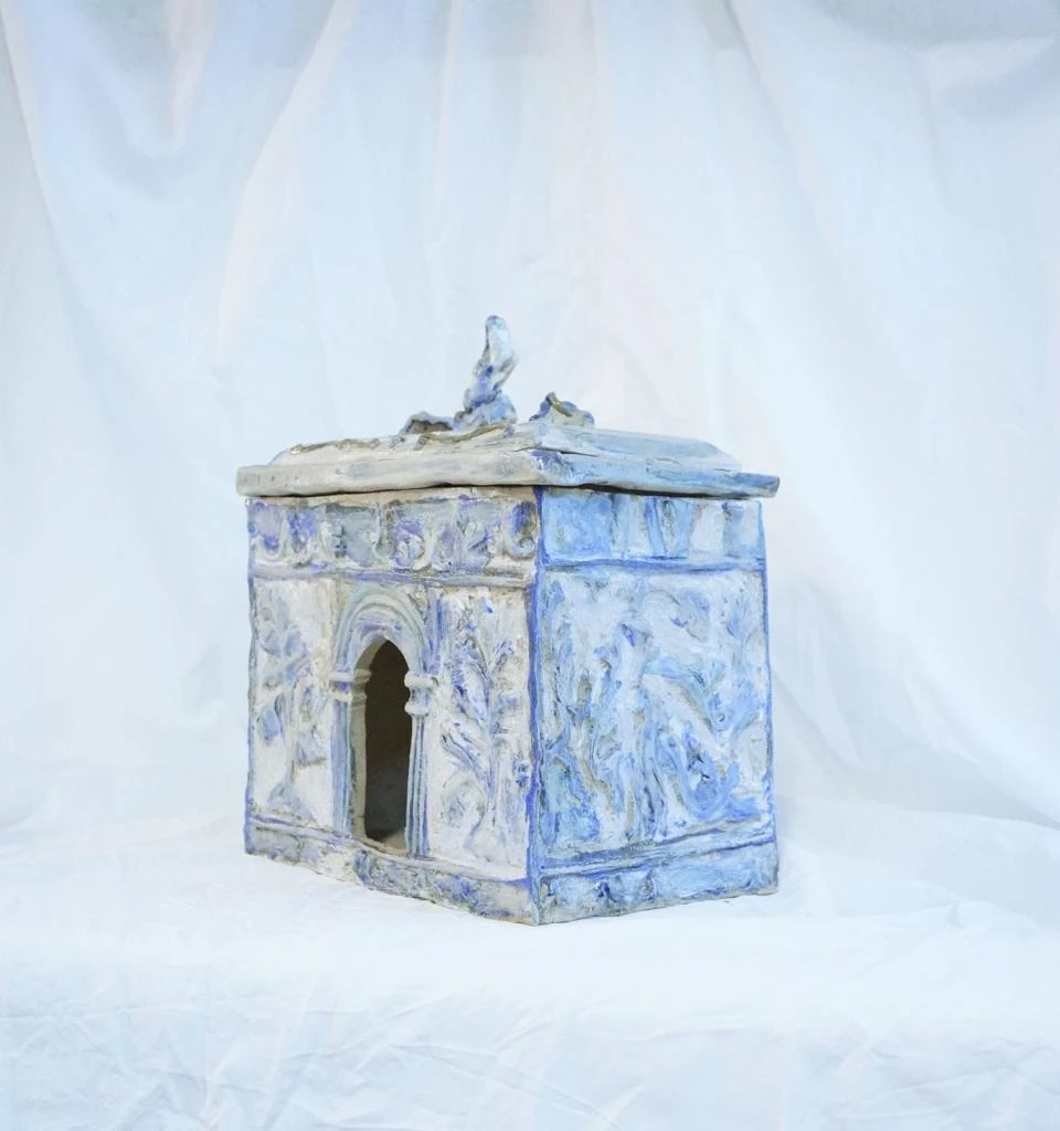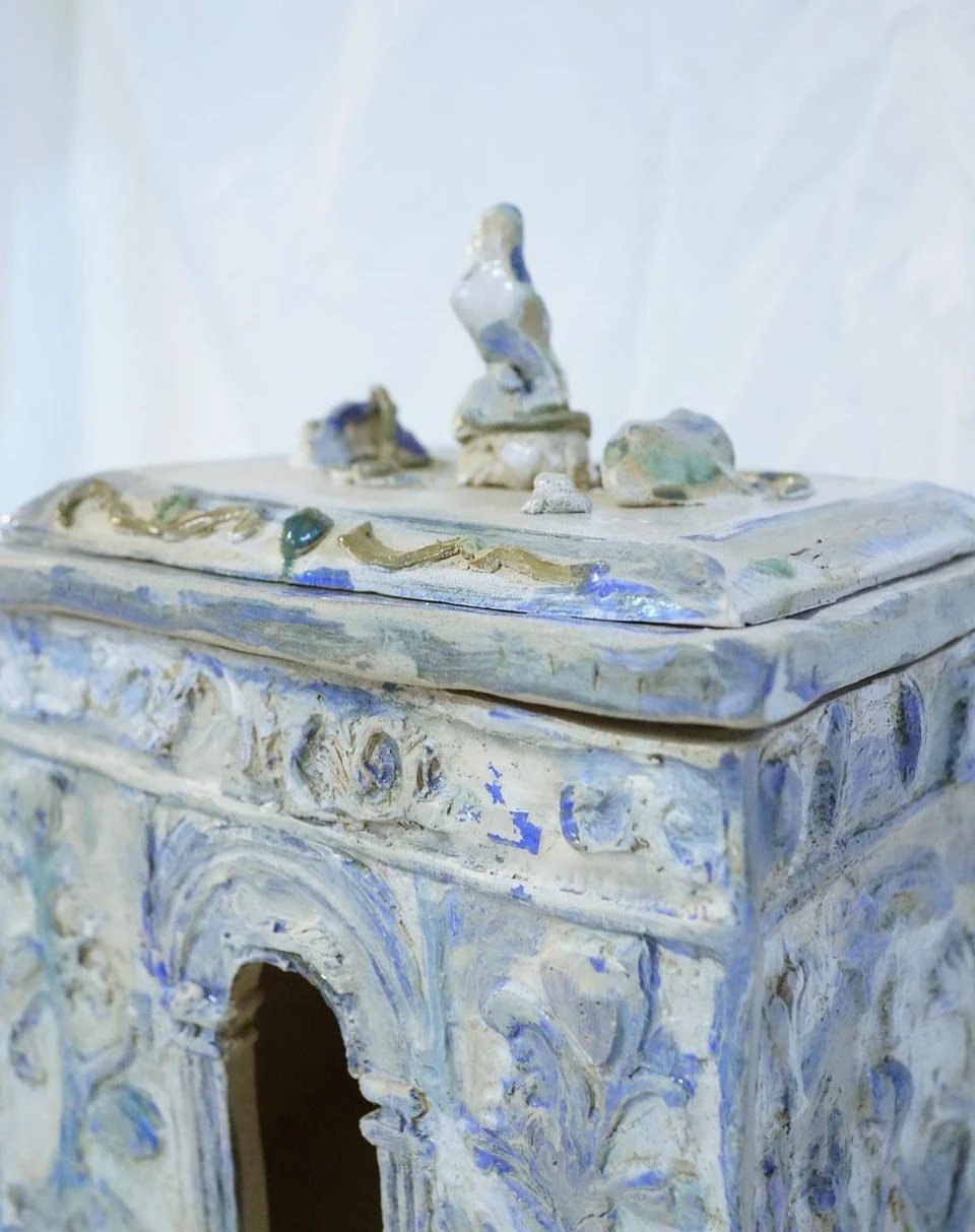 В серии ларцов, созданных из керамики, художница Катя Афонина рассуждает о хрупкой логике хранения в эпоху, где сама возможность удерживать что-то становится редким ресурсом. Эти объекты функционируют как контейнеры не только для материальных следов, но и для психологической нагрузки вещей, чья «ценность» формируется опытом и памятью. Обращаясь к форме артефакта и руинированности, автор подчеркивает: новое невозможно создать без опоры на прошлое, которое одновременно хранит и ограничивает нас.