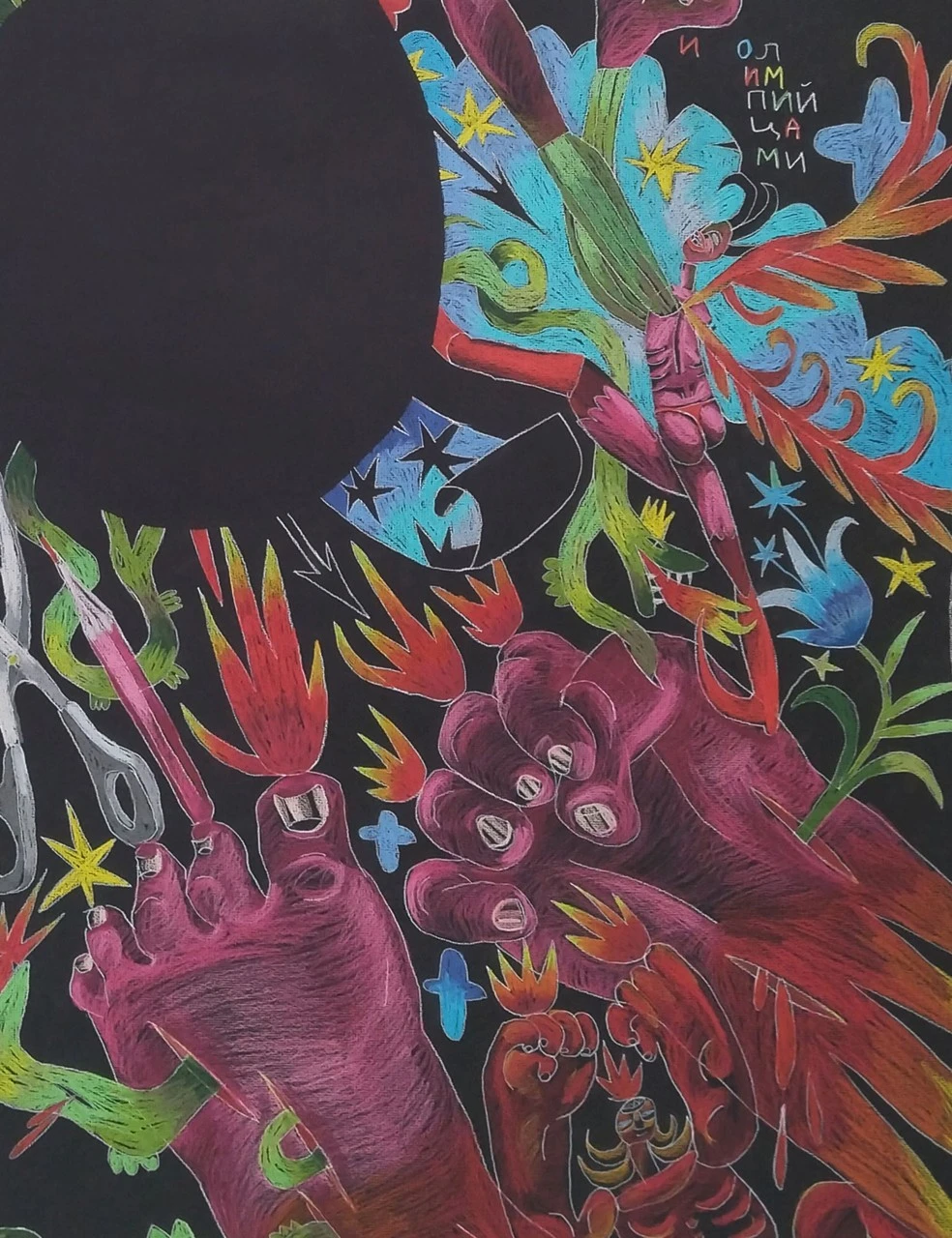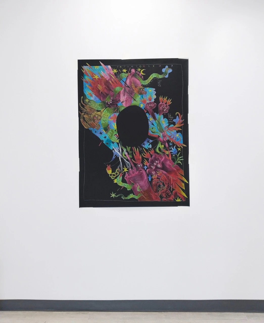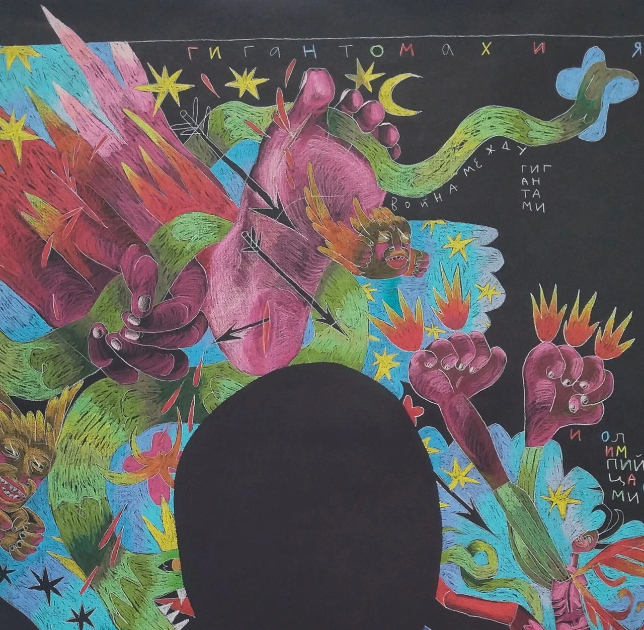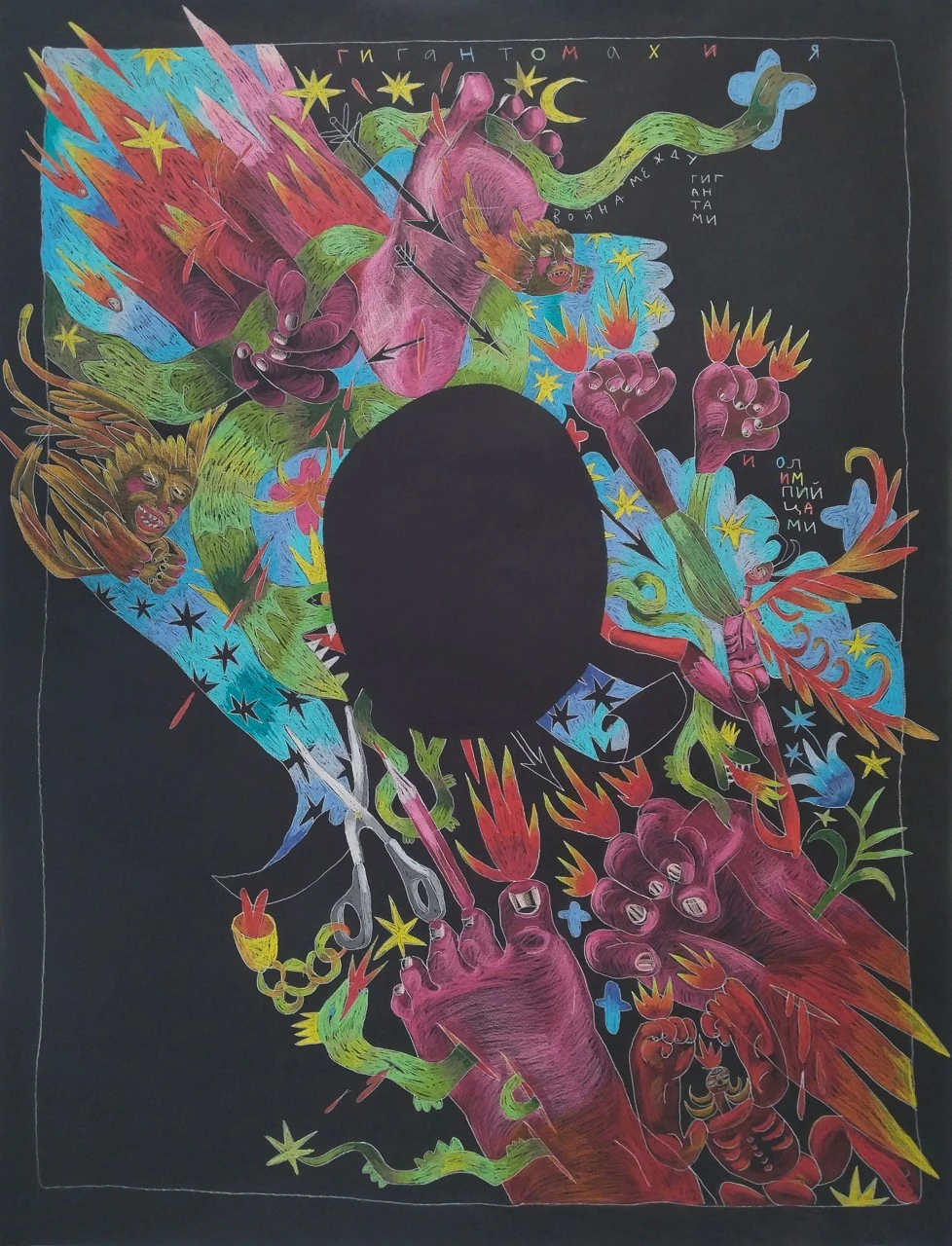 Графический лист из серии «ICON», в которой я работаю с классическими образцами средневековой и иконографической живописи, упрощая и трансформируя ее. Сюжет этого листа повествует нам о древнегреческом мифе: Битве олимпийских богов с гигантами.