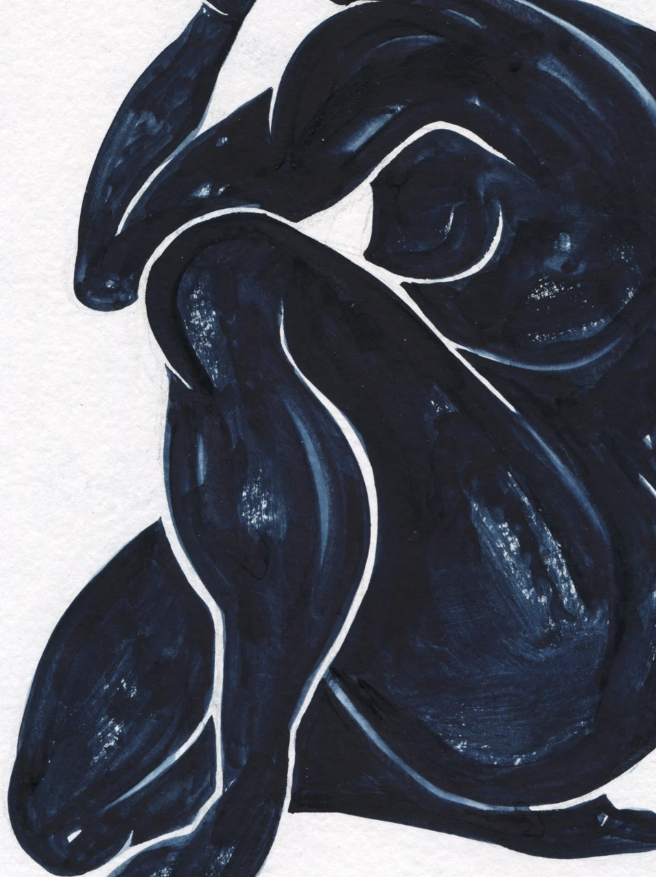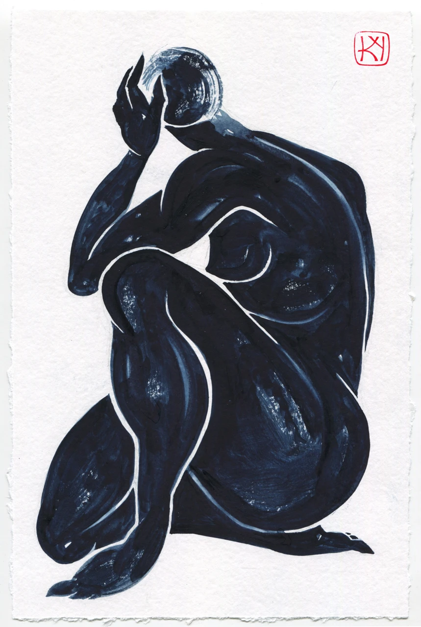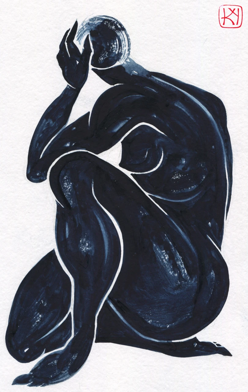 Катя Улитина. Темный Индиго. Обнаженный женский силуэт. Акварель, ручной штамп. В комплекте сертификат и фирменная упаковка от автора.
