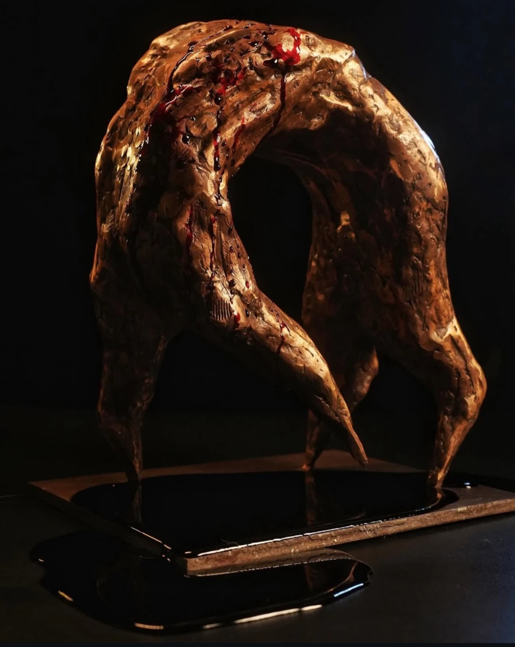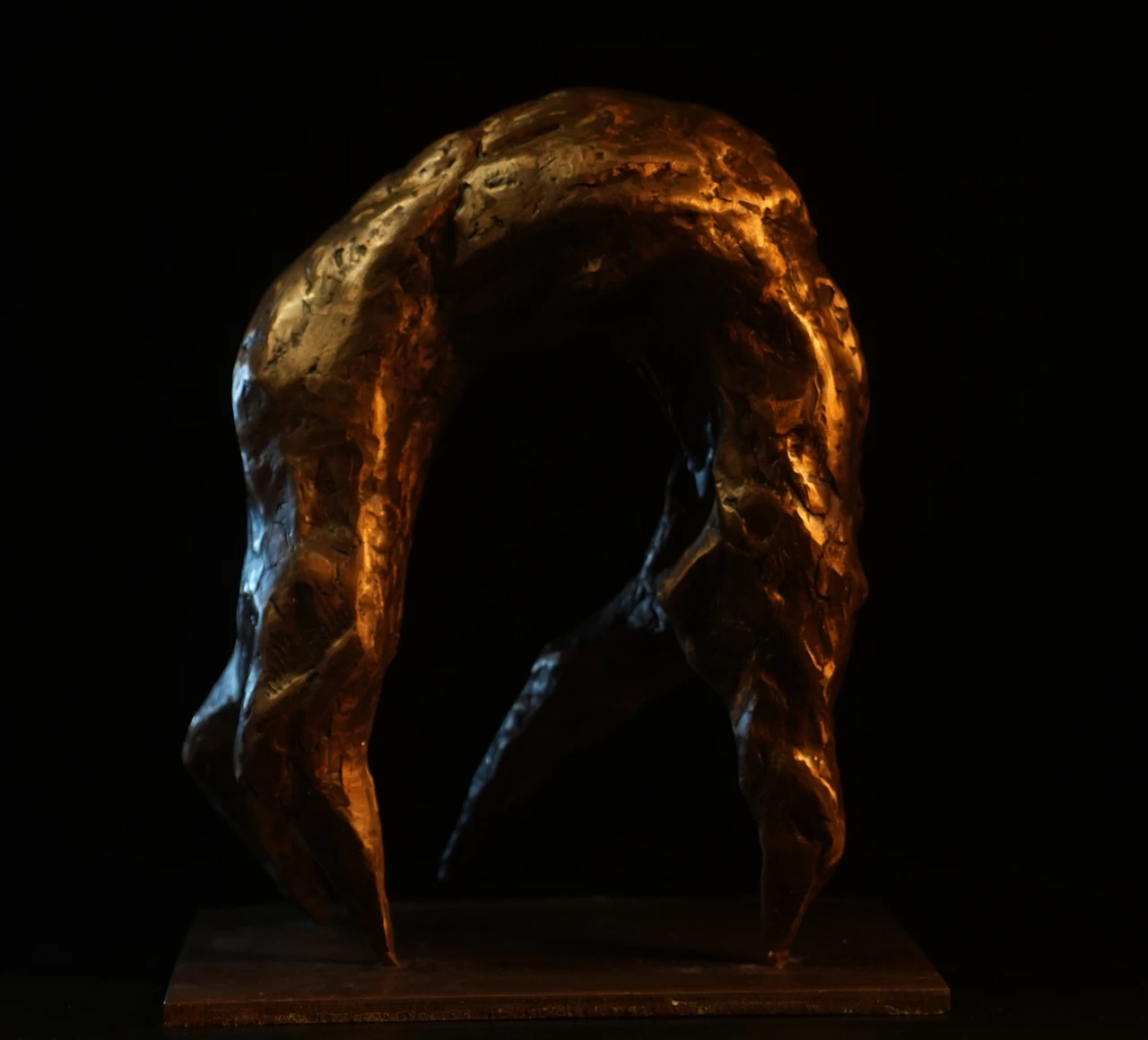 Одна из первых работ этого цикла. Производилась в несколько этапов: после разработки эскизов, слеплена из пластилина, отформована, отлита из воска, далее по восковой модели была изготовлена выплавляемая форма в которую уже непосредственно заливалась бронза. После изготовления бронзовой модели была очищена пескоструем, тщательным образом обработана пневматическим и ручным инструментом, обезжирена и окислена японской патиной "ohaguro". Для консервации патины использовался воск.
