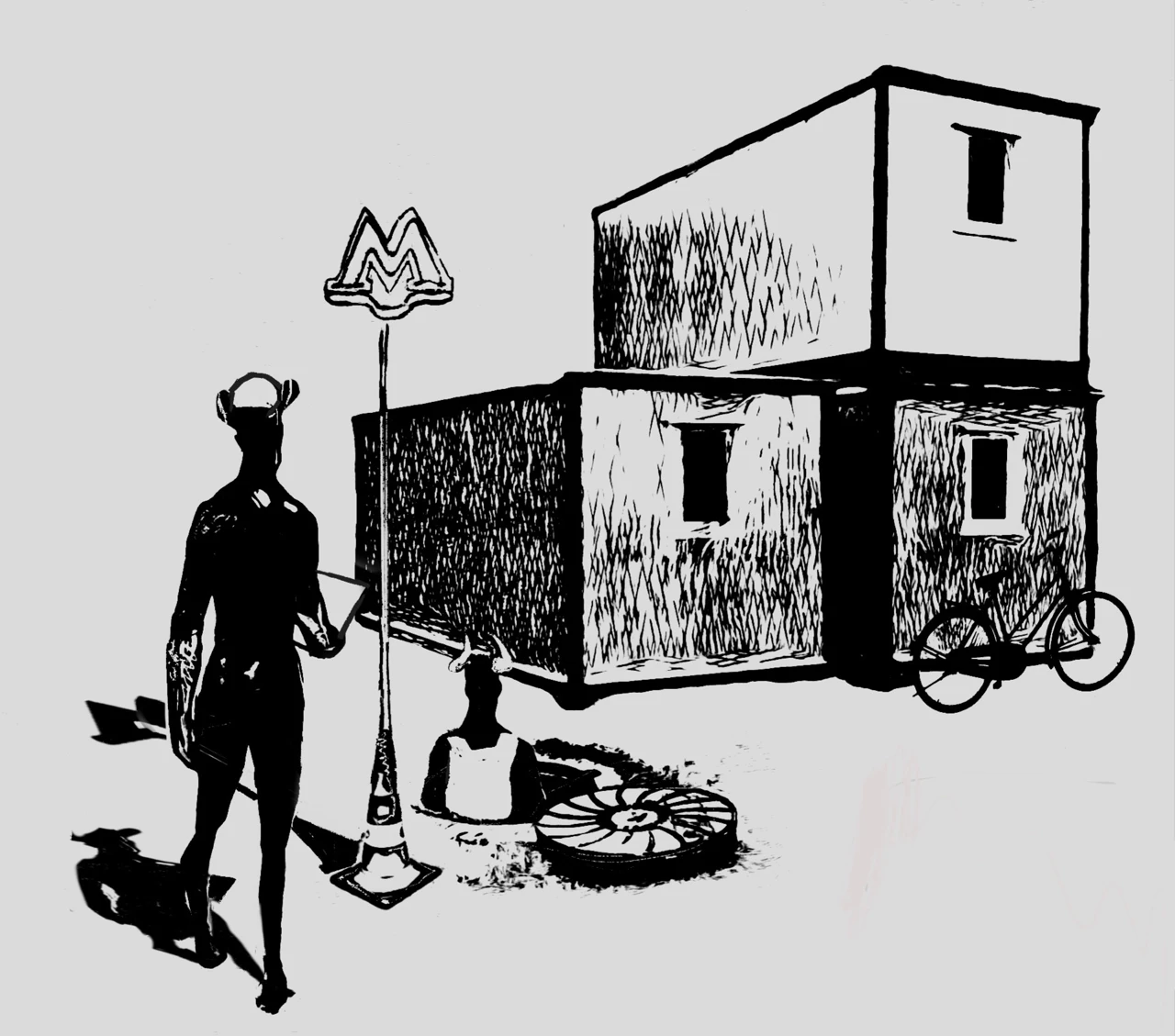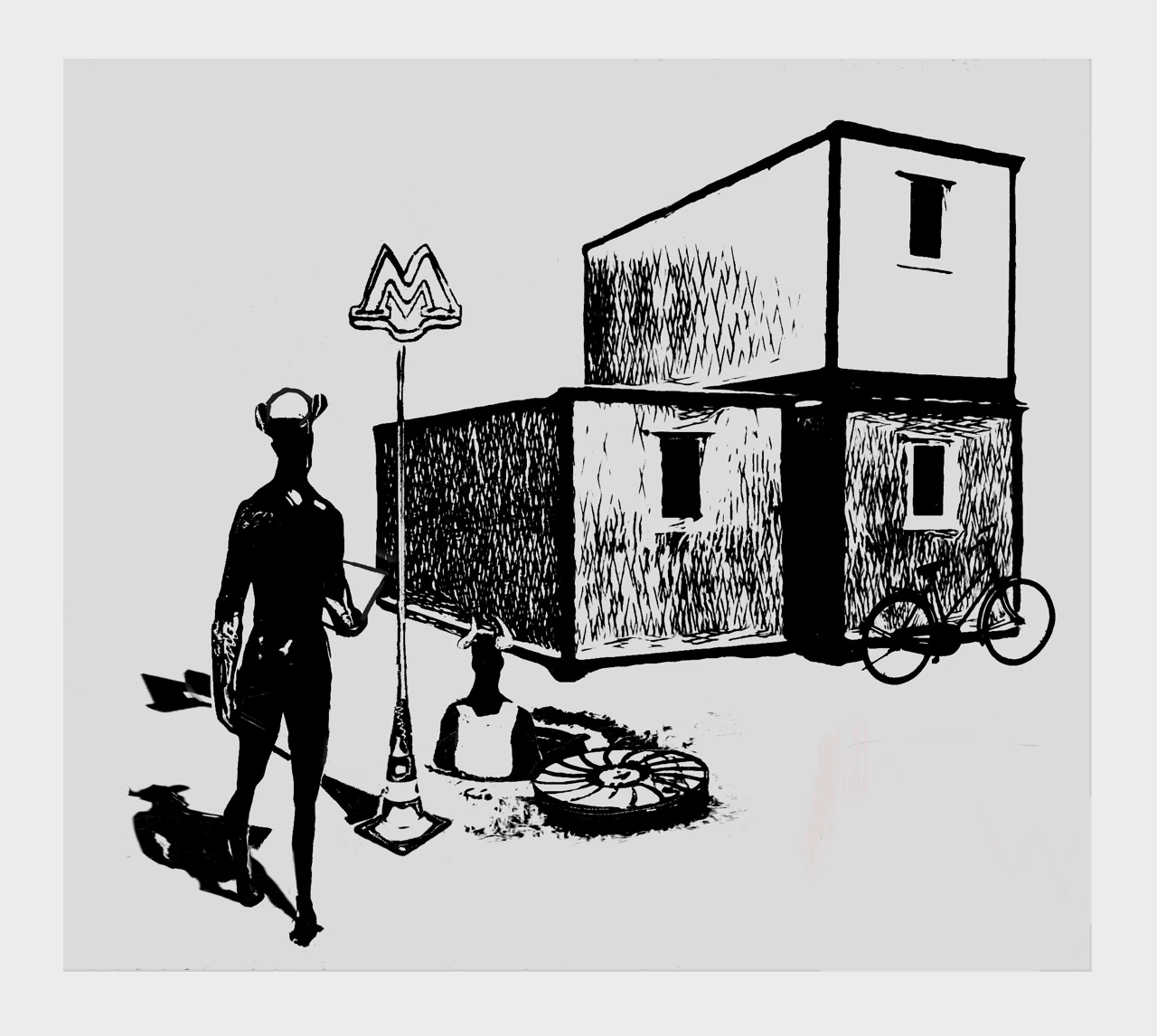 Одна из цикла работ "Метро". Черти в метро, на стройках и железных дорогах — не злодеи и не духи — они часть бессознательного. Графическая сатира о том, как ад стал повседневностью.