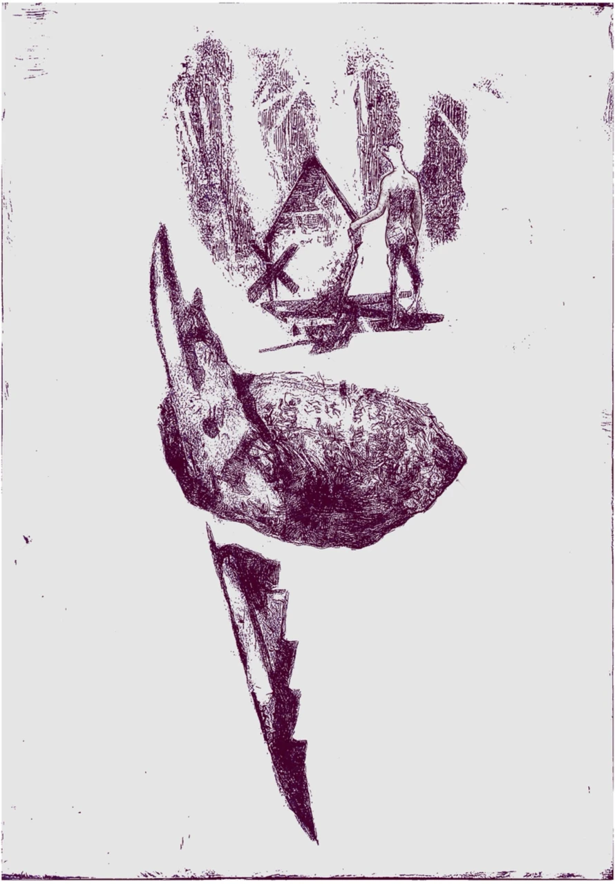 Одна из цикла работ "Метро". Черти в метро, на стройках и железных дорогах — не злодеи и не духи - они часть бессознательного. Графическая сатира о том, как ад стал повседневностью.