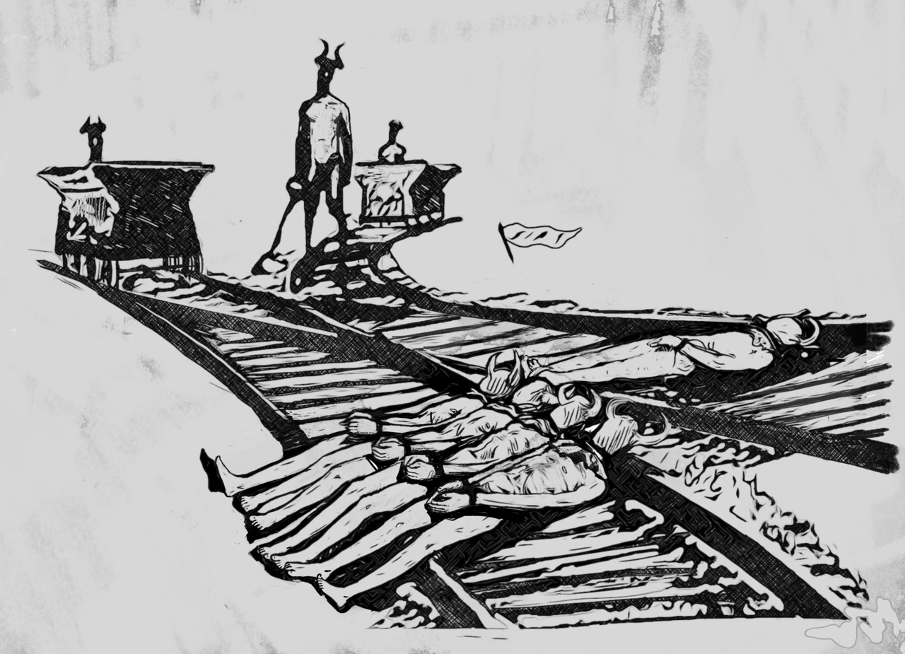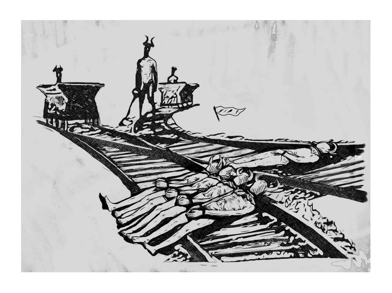 Одна из цикла работ "Метро". Черти в метро, на стройках и железных дорогах — не злодеи и не духи - они часть бессознательного. Графическая сатира о том, как ад стал повседневностью.